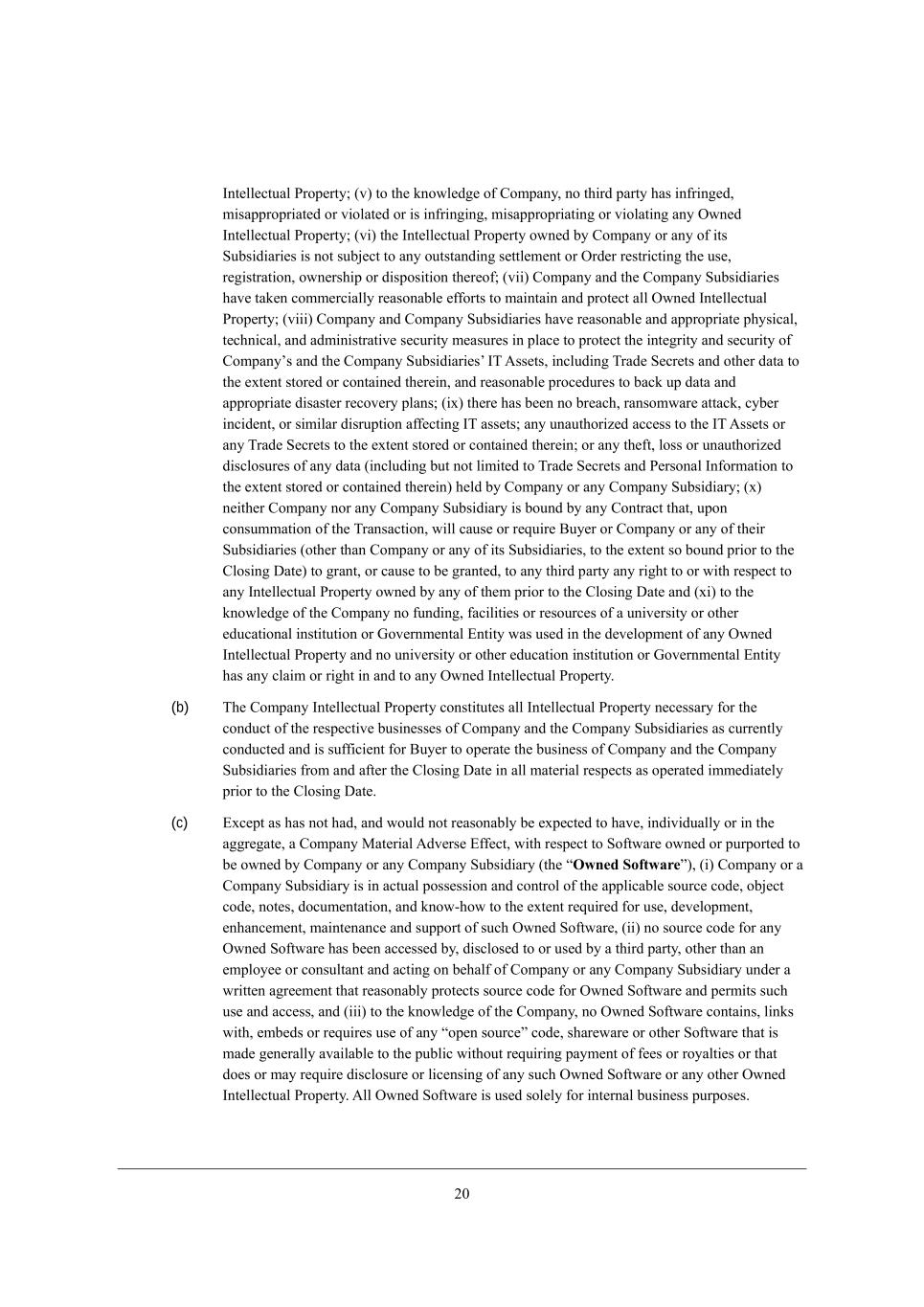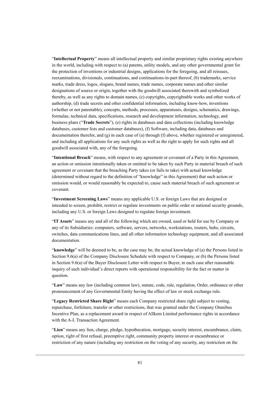 6/ rIntellectual Propertys c[Wdi Wbb _dj[bb[YjkWb fhef[hjo WdZ i_c_bWh fhefh_[jWho h_]^ji [n_ij_d] Wdom^[h[ _d j^[ mehbZ* _dYbkZ_d] m_j^ h[if[Yj je (W) fWj[dji* kj_b_jo ceZ[bi* WdZ Wdo ej^[h ]el[hdc[djWb ]hWdj \eh j^[ fhej[Yj_ed e\ _dl[dj_edi eh _dZkijh_Wb Z[i_]di* Wffb_YWj_edi \eh j^[ \eh[]e_d]* WdZ Wbb h[_iik[i* h[[nWc_dWj_edi* Z_l_i_edWbi* Yedj_dkWj_edi* WdZ Yedj_dkWj_edi+_d+fWhj j^[h[e\* (X) jhWZ[cWhai* i[hl_Y[ cWhai* jhWZ[ Zh[ii* be]ei* ibe]Wdi* XhWdZ dWc[i* jhWZ[ dWc[i* YehfehWj[ dWc[i WdZ ej^[h i_c_bWh Z[i_]dWj_edi e\ iekhY[ eh eh_]_d* je][j^[h m_j^ j^[ ]eeZm_bb WiieY_Wj[Z j^[h[m_j^ WdZ iocXeb_p[Z j^[h[Xo* Wi m[bb Wi Wdo h_]^ji je ZecW_d dWc[i* (Y) Yefoh_]^ji* Yefoh_]^jWXb[ mehai WdZ ej^[h mehai e\ Wkj^ehi^_f* (Z) jhWZ[ i[Yh[ji WdZ ej^[h Yed\_Z[dj_Wb _d\ehcWj_ed* _dYbkZ_d] adem+^em* _dl[dj_edi (m^[j^[h eh dej fWj[djWXb[)* YedY[fji* c[j^eZi* fheY[ii[i* WffWhWjki[i* Z[i_]di* iY^[cWj_Yi* ZhWm_d]i* \ehckbW[* j[Y^d_YWb ZWjW* if[Y_\_YWj_edi* h[i[WhY^ WdZ Z[l[befc[dj _d\ehcWj_ed* j[Y^debe]o* WdZ Xki_d[ii fbWdi (rTrade Secretss)* ([) h_]^ji _d ZWjWXWi[i WdZ ZWjW Yebb[Yj_edi (_dYbkZ_d] ademb[Z][ ZWjWXWi[i* Ykijec[h b_iji WdZ Ykijec[h ZWjWXWi[i)* (\) Me\jmWh[* _dYbkZ_d] ZWjW* ZWjWXWi[i WdZ ZeYkc[djWj_ed j^[h[\eh* WdZ (]) _d [WY^ YWi[ e\ (W) j^hek]^ (\) WXel[* m^[j^[h h[]_ij[h[Z eh kdh[]_ij[h[Z* WdZ _dYbkZ_d] Wbb Wffb_YWj_edi \eh Wdo ikY^ h_]^ji Wi m[bb Wi j^[ h_]^j je Wffbo \eh ikY^ h_]^ji WdZ Wbb ]eeZm_bb WiieY_Wj[Z m_j^* Wdo e\ j^[ \eh[]e_d], rIntentional Breachs c[Wdi* m_j^ h[if[Yj je Wdo W]h[[c[dj eh Yel[dWdj e\ W JWhjo _d j^_i ;]h[[c[dj* Wd WYj_ed eh ec_ii_ed _dj[dj_edWbbo jWa[d eh ec_jj[Z je X[ jWa[d Xo ikY^ JWhjo _d cWj[h_Wb Xh[WY^ e\ ikY^ W]h[[c[dj eh Yel[dWdj j^Wj j^[ Xh[WY^_d] JWhjo jWa[i (eh \W_bi je jWa[) m_j^ WYjkWb ademb[Z][ (Z[j[hc_d[Z m_j^ekj h[]WhZ je j^[ Z[\_d_j_ed e\ rademb[Z][s _d j^_i ;]h[[c[dj) j^Wj ikY^ WYj_ed eh ec_ii_ed mekbZ* eh mekbZ h[WiedWXbo X[ [nf[Yj[Z je* YWki[ ikY^ cWj[h_Wb Xh[WY^ e\ ikY^ W]h[[c[dj eh Yel[dWdj, rInvestment Screening Lawss c[Wdi Wdo Wffb_YWXb[ O,M, eh \eh[_]d FWmi j^Wj Wh[ Z[i_]d[Z eh _dj[dZ[Z je iYh[[d* fhe^_X_j* h[ijh_Yj eh h[]kbWj[ _dl[ijc[dji ed fkXb_Y ehZ[h eh dWj_edWb i[Ykh_jo ]hekdZi* _dYbkZ_d] Wdo O,M, eh \eh[_]d FWmi Z[i_]d[Z je h[]kbWj[ \eh[_]d _dl[ijc[dj, rIT Assetss c[Wdi Wdo WdZ Wbb e\ j^[ \ebbem_d] m^_Y^ Wh[ emd[Z* ki[Z eh ^[bZ \eh ki[ Xo =ecfWdo eh Wdo e\ _ji MkXi_Z_Wh_[i8 Yecfkj[hi* ie\jmWh[* i[hl[hi* d[jmehai* mehaijWj_edi* hekj[hi* ^kXi* Y_hYk_ji* im_jY^[i* ZWjW Yecckd_YWj_edi b_d[i* WdZ Wbb ej^[h _d\ehcWj_ed j[Y^debe]o [gk_fc[dj* WdZ Wbb WiieY_Wj[Z ZeYkc[djWj_ed, rknowledges m_bb X[ Z[[c[Z je X[* Wi j^[ YWi[ cWo X[* j^[ WYjkWb ademb[Z][ e\ (W) j^[ J[hiedi b_ij[Z _d M[Yj_ed 7,4(W) e\ j^[ =ecfWdo >_iYbeikh[ MY^[Zkb[ m_j^ h[if[Yj je =ecfWdo* eh (X) j^[ J[hiedi b_ij[Z _d M[Yj_ed 7,4(W) e\ j^[ <ko[h >_iYbeikh[ F[jj[h m_j^ h[if[Yj je <ko[h* _d [WY^ YWi[ W\j[h h[WiedWXb[ _dgk_ho e\ ikY^ _dZ_l_ZkWbui Z_h[Yj h[fehji m_j^ ef[hWj_edWb h[ifedi_X_b_jo \eh j^[ \WYj eh cWjj[h _d gk[ij_ed, rLaws c[Wdi Wdo bWm (_dYbkZ_d] Yecced bWm)* ijWjkj[* YeZ[* hkb[* h[]kbWj_ed* IhZ[h* ehZ_dWdY[ eh ej^[h fhedekdY[c[dj e\ Wdo Ael[hdc[djWb ?dj_jo ^Wl_d] j^[ [\\[Yj e\ bWm eh ijeYa [nY^Wd][ hkb[, rLegacy Restricted Share Rights c[Wdi [WY^ =ecfWdo h[ijh_Yj[Z i^Wh[ h_]^j ikX`[Yj je l[ij_d]* h[fkhY^Wi[* \eh\[_jkh[* jhWdi\[h eh ej^[h h[ijh_Yj_edi* j^Wj mWi ]hWdj[Z kdZ[h j^[ =ecfWdo Icd_Xki CdY[dj_l[ JbWd* Wi W h[fbWY[c[dj WmWhZ _d h[if[Yj e\ ;bba[c F_c_j[Z f[h\ehcWdY[ h_]^ji _d WYYehZWdY[ m_j^ j^[ ;+F NhWdiWYj_ed ;]h[[c[dj, rLiens c[Wdi Wdo b_[d* Y^Wh][* fb[Z][* ^ofej^[YWj_ed* cehj]W][* i[Ykh_jo _dj[h[ij* [dYkcXhWdY[* YbW_c* efj_ed* h_]^j e\ \_hij h[\kiWb* fh[[cfj_l[ h_]^j* Yecckd_jo fhef[hjo _dj[h[ij eh [dYkcXhWdY[ eh h[ijh_Yj_ed e\ Wdo dWjkh[ (_dYbkZ_d] Wdo h[ijh_Yj_ed ed j^[ lej_d] e\ Wdo i[Ykh_jo* Wdo h[ijh_Yj_ed ed j^[