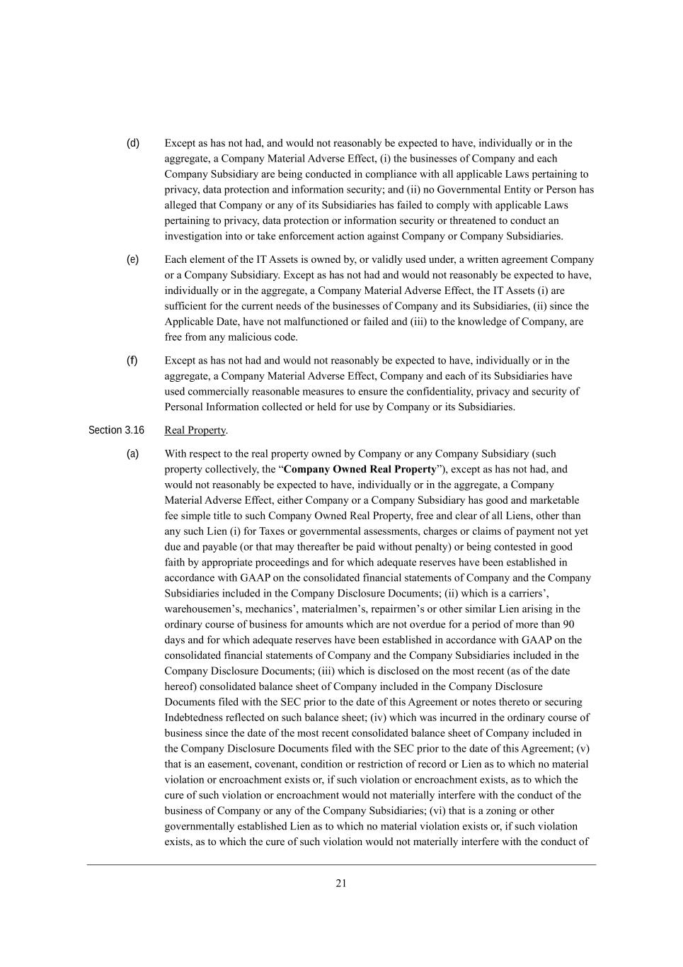 0/ (d) ?nY[fj Wi ^Wi dej ^WZ* WdZ mekbZ dej h[WiedWXbo X[ [nf[Yj[Z je ^Wl[* _dZ_l_ZkWbbo eh _d j^[ W]]h[]Wj[* W =ecfWdo GWj[h_Wb ;Zl[hi[ ?\\[Yj* (_) j^[ Xki_d[ii[i e\ =ecfWdo WdZ [WY^ =ecfWdo MkXi_Z_Who Wh[ X[_d] YedZkYj[Z _d Yecfb_WdY[ m_j^ Wbb Wffb_YWXb[ FWmi f[hjW_d_d] je fh_lWYo* ZWjW fhej[Yj_ed WdZ _d\ehcWj_ed i[Ykh_jo9 WdZ (__) de Ael[hdc[djWb ?dj_jo eh J[hied ^Wi Wbb[][Z j^Wj =ecfWdo eh Wdo e\ _ji MkXi_Z_Wh_[i ^Wi \W_b[Z je Yecfbo m_j^ Wffb_YWXb[ FWmi f[hjW_d_d] je fh_lWYo* ZWjW fhej[Yj_ed eh _d\ehcWj_ed i[Ykh_jo eh j^h[Wj[d[Z je YedZkYj Wd _dl[ij_]Wj_ed _dje eh jWa[ [d\ehY[c[dj WYj_ed W]W_dij =ecfWdo eh =ecfWdo MkXi_Z_Wh_[i, (e) ?WY^ [b[c[dj e\ j^[ CN ;ii[ji _i emd[Z Xo* eh lWb_Zbo ki[Z kdZ[h* W mh_jj[d W]h[[c[dj =ecfWdo eh W =ecfWdo MkXi_Z_Who, ?nY[fj Wi ^Wi dej ^WZ WdZ mekbZ dej h[WiedWXbo X[ [nf[Yj[Z je ^Wl[* _dZ_l_ZkWbbo eh _d j^[ W]]h[]Wj[* W =ecfWdo GWj[h_Wb ;Zl[hi[ ?\\[Yj* j^[ CN ;ii[ji (_) Wh[ ik\\_Y_[dj \eh j^[ Ykhh[dj d[[Zi e\ j^[ Xki_d[ii[i e\ =ecfWdo WdZ _ji MkXi_Z_Wh_[i* (__) i_dY[ j^[ ;ffb_YWXb[ >Wj[* ^Wl[ dej cWb\kdYj_ed[Z eh \W_b[Z WdZ (___) je j^[ ademb[Z][ e\ =ecfWdo* Wh[ \h[[ \hec Wdo cWb_Y_eki YeZ[, (f) ?nY[fj Wi ^Wi dej ^WZ WdZ mekbZ dej h[WiedWXbo X[ [nf[Yj[Z je ^Wl[* _dZ_l_ZkWbbo eh _d j^[ W]]h[]Wj[* W =ecfWdo GWj[h_Wb ;Zl[hi[ ?\\[Yj* =ecfWdo WdZ [WY^ e\ _ji MkXi_Z_Wh_[i ^Wl[ ki[Z Yecc[hY_Wbbo h[WiedWXb[ c[Wikh[i je [dikh[ j^[ Yed\_Z[dj_Wb_jo* fh_lWYo WdZ i[Ykh_jo e\ J[hiedWb Cd\ehcWj_ed Yebb[Yj[Z eh ^[bZ \eh ki[ Xo =ecfWdo eh _ji MkXi_Z_Wh_[i, Section 3.16 L[Wb Jhef[hjo, (a) Q_j^ h[if[Yj je j^[ h[Wb fhef[hjo emd[Z Xo =ecfWdo eh Wdo =ecfWdo MkXi_Z_Who (ikY^ fhef[hjo Yebb[Yj_l[bo* j^[ rCompany Owned Real Propertys)* [nY[fj Wi ^Wi dej ^WZ* WdZ mekbZ dej h[WiedWXbo X[ [nf[Yj[Z je ^Wl[* _dZ_l_ZkWbbo eh _d j^[ W]]h[]Wj[* W =ecfWdo GWj[h_Wb ;Zl[hi[ ?\\[Yj* [_j^[h =ecfWdo eh W =ecfWdo MkXi_Z_Who ^Wi ]eeZ WdZ cWha[jWXb[ \[[ i_cfb[ j_jb[ je ikY^ =ecfWdo Imd[Z L[Wb Jhef[hjo* \h[[ WdZ Yb[Wh e\ Wbb F_[di* ej^[h j^Wd Wdo ikY^ F_[d (_) \eh NWn[i eh ]el[hdc[djWb Wii[iic[dji* Y^Wh][i eh YbW_ci e\ fWoc[dj dej o[j Zk[ WdZ fWoWXb[ (eh j^Wj cWo j^[h[W\j[h X[ fW_Z m_j^ekj f[dWbjo) eh X[_d] Yedj[ij[Z _d ]eeZ \W_j^ Xo Wffhefh_Wj[ fheY[[Z_d]i WdZ \eh m^_Y^ WZ[gkWj[ h[i[hl[i ^Wl[ X[[d [ijWXb_i^[Z _d WYYehZWdY[ m_j^ A;;J ed j^[ Yedieb_ZWj[Z \_dWdY_Wb ijWj[c[dji e\ =ecfWdo WdZ j^[ =ecfWdo MkXi_Z_Wh_[i _dYbkZ[Z _d j^[ =ecfWdo >_iYbeikh[ >eYkc[dji9 (__) m^_Y^ _i W YWhh_[hiu* mWh[^eki[c[dui* c[Y^Wd_Yiu* cWj[h_Wbc[dui* h[fW_hc[dui eh ej^[h i_c_bWh F_[d Wh_i_d] _d j^[ ehZ_dWho Yekhi[ e\ Xki_d[ii \eh Wcekdji m^_Y^ Wh[ dej el[hZk[ \eh W f[h_eZ e\ ceh[ j^Wd 7. ZWoi WdZ \eh m^_Y^ WZ[gkWj[ h[i[hl[i ^Wl[ X[[d [ijWXb_i^[Z _d WYYehZWdY[ m_j^ A;;J ed j^[ Yedieb_ZWj[Z \_dWdY_Wb ijWj[c[dji e\ =ecfWdo WdZ j^[ =ecfWdo MkXi_Z_Wh_[i _dYbkZ[Z _d j^[ =ecfWdo >_iYbeikh[ >eYkc[dji9 (___) m^_Y^ _i Z_iYbei[Z ed j^[ ceij h[Y[dj (Wi e\ j^[ ZWj[ ^[h[e\) Yedieb_ZWj[Z XWbWdY[ i^[[j e\ =ecfWdo _dYbkZ[Z _d j^[ =ecfWdo >_iYbeikh[ >eYkc[dji \_b[Z m_j^ j^[ M?= fh_eh je j^[ ZWj[ e\ j^_i ;]h[[c[dj eh dej[i j^[h[je eh i[Ykh_d] CdZ[Xj[Zd[ii h[\b[Yj[Z ed ikY^ XWbWdY[ i^[[j9 (_l) m^_Y^ mWi _dYkhh[Z _d j^[ ehZ_dWho Yekhi[ e\ Xki_d[ii i_dY[ j^[ ZWj[ e\ j^[ ceij h[Y[dj Yedieb_ZWj[Z XWbWdY[ i^[[j e\ =ecfWdo _dYbkZ[Z _d j^[ =ecfWdo >_iYbeikh[ >eYkc[dji \_b[Z m_j^ j^[ M?= fh_eh je j^[ ZWj[ e\ j^_i ;]h[[c[dj9 (l) j^Wj _i Wd [Wi[c[dj* Yel[dWdj* YedZ_j_ed eh h[ijh_Yj_ed e\ h[YehZ eh F_[d Wi je m^_Y^ de cWj[h_Wb l_ebWj_ed eh [dYheWY^c[dj [n_iji eh* _\ ikY^ l_ebWj_ed eh [dYheWY^c[dj [n_iji* Wi je m^_Y^ j^[ Ykh[ e\ ikY^ l_ebWj_ed eh [dYheWY^c[dj mekbZ dej cWj[h_Wbbo _dj[h\[h[ m_j^ j^[ YedZkYj e\ j^[ Xki_d[ii e\ =ecfWdo eh Wdo e\ j^[ =ecfWdo MkXi_Z_Wh_[i9 (l_) j^Wj _i W ped_d] eh ej^[h ]el[hdc[djWbbo [ijWXb_i^[Z F_[d Wi je m^_Y^ de cWj[h_Wb l_ebWj_ed [n_iji eh* _\ ikY^ l_ebWj_ed [n_iji* Wi je m^_Y^ j^[ Ykh[ e\ ikY^ l_ebWj_ed mekbZ dej cWj[h_Wbbo _dj[h\[h[ m_j^ j^[ YedZkYj e\