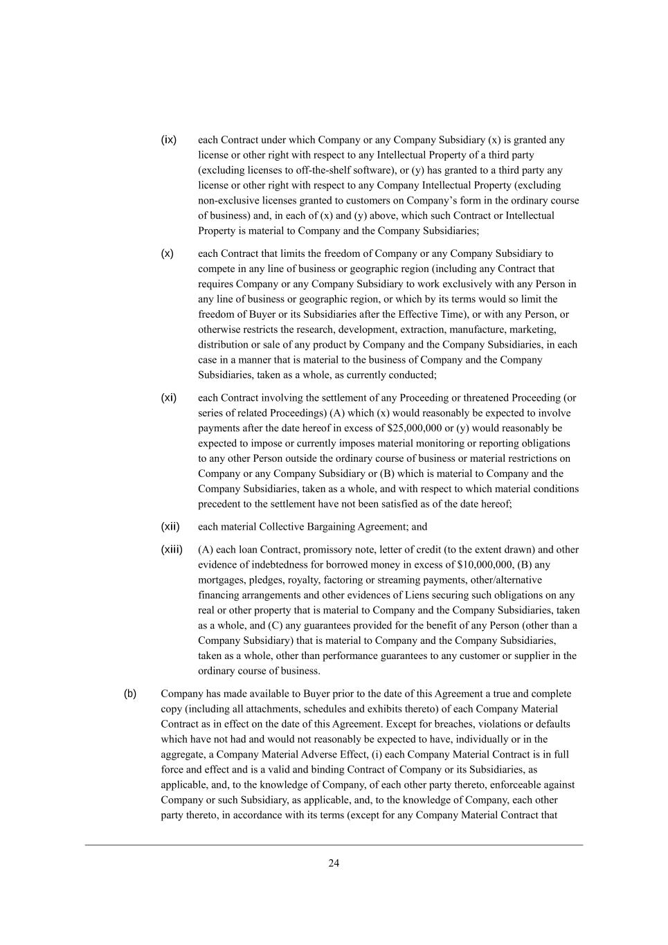 02 (ix) [WY^ =edjhWYj kdZ[h m^_Y^ =ecfWdo eh Wdo =ecfWdo MkXi_Z_Who (n) _i ]hWdj[Z Wdo b_Y[di[ eh ej^[h h_]^j m_j^ h[if[Yj je Wdo Cdj[bb[YjkWb Jhef[hjo e\ W j^_hZ fWhjo ([nYbkZ_d] b_Y[di[i je e\\+j^[+i^[b\ ie\jmWh[)* eh (o) ^Wi ]hWdj[Z je W j^_hZ fWhjo Wdo b_Y[di[ eh ej^[h h_]^j m_j^ h[if[Yj je Wdo =ecfWdo Cdj[bb[YjkWb Jhef[hjo ([nYbkZ_d] ded+[nYbki_l[ b_Y[di[i ]hWdj[Z je Ykijec[hi ed =ecfWdoui \ehc _d j^[ ehZ_dWho Yekhi[ e\ Xki_d[ii) WdZ* _d [WY^ e\ (n) WdZ (o) WXel[* m^_Y^ ikY^ =edjhWYj eh Cdj[bb[YjkWb Jhef[hjo _i cWj[h_Wb je =ecfWdo WdZ j^[ =ecfWdo MkXi_Z_Wh_[i9 (x) [WY^ =edjhWYj j^Wj b_c_ji j^[ \h[[Zec e\ =ecfWdo eh Wdo =ecfWdo MkXi_Z_Who je Yecf[j[ _d Wdo b_d[ e\ Xki_d[ii eh ][e]hWf^_Y h[]_ed (_dYbkZ_d] Wdo =edjhWYj j^Wj h[gk_h[i =ecfWdo eh Wdo =ecfWdo MkXi_Z_Who je meha [nYbki_l[bo m_j^ Wdo J[hied _d Wdo b_d[ e\ Xki_d[ii eh ][e]hWf^_Y h[]_ed* eh m^_Y^ Xo _ji j[hci mekbZ ie b_c_j j^[ \h[[Zec e\ <ko[h eh _ji MkXi_Z_Wh_[i W\j[h j^[ ?\\[Yj_l[ N_c[)* eh m_j^ Wdo J[hied* eh ej^[hm_i[ h[ijh_Yji j^[ h[i[WhY^* Z[l[befc[dj* [njhWYj_ed* cWdk\WYjkh[* cWha[j_d]* Z_ijh_Xkj_ed eh iWb[ e\ Wdo fheZkYj Xo =ecfWdo WdZ j^[ =ecfWdo MkXi_Z_Wh_[i* _d [WY^ YWi[ _d W cWdd[h j^Wj _i cWj[h_Wb je j^[ Xki_d[ii e\ =ecfWdo WdZ j^[ =ecfWdo MkXi_Z_Wh_[i* jWa[d Wi W m^eb[* Wi Ykhh[djbo YedZkYj[Z9 (xi) [WY^ =edjhWYj _dlebl_d] j^[ i[jjb[c[dj e\ Wdo JheY[[Z_d] eh j^h[Wj[d[Z JheY[[Z_d] (eh i[h_[i e\ h[bWj[Z JheY[[Z_d]i) (;) m^_Y^ (n) mekbZ h[WiedWXbo X[ [nf[Yj[Z je _dlebl[ fWoc[dji W\j[h j^[ ZWj[ ^[h[e\ _d [nY[ii e\ $03*...*... eh (o) mekbZ h[WiedWXbo X[ [nf[Yj[Z je _cfei[ eh Ykhh[djbo _cfei[i cWj[h_Wb ced_jeh_d] eh h[fehj_d] eXb_]Wj_edi je Wdo ej^[h J[hied ekji_Z[ j^[ ehZ_dWho Yekhi[ e\ Xki_d[ii eh cWj[h_Wb h[ijh_Yj_edi ed =ecfWdo eh Wdo =ecfWdo MkXi_Z_Who eh (<) m^_Y^ _i cWj[h_Wb je =ecfWdo WdZ j^[ =ecfWdo MkXi_Z_Wh_[i* jWa[d Wi W m^eb[* WdZ m_j^ h[if[Yj je m^_Y^ cWj[h_Wb YedZ_j_edi fh[Y[Z[dj je j^[ i[jjb[c[dj ^Wl[ dej X[[d iWj_i\_[Z Wi e\ j^[ ZWj[ ^[h[e\9 (xii) [WY^ cWj[h_Wb =ebb[Yj_l[ <Wh]W_d_d] ;]h[[c[dj9 WdZ (xiii) (;) [WY^ beWd =edjhWYj* fhec_iieho dej[* b[jj[h e\ Yh[Z_j (je j^[ [nj[dj ZhWmd) WdZ ej^[h [l_Z[dY[ e\ _dZ[Xj[Zd[ii \eh Xehhem[Z ced[o _d [nY[ii e\ $/.*...*...* (<) Wdo cehj]W][i* fb[Z][i* heoWbjo* \WYjeh_d] eh ijh[Wc_d] fWoc[dji* ej^[h-Wbj[hdWj_l[ \_dWdY_d] WhhWd][c[dji WdZ ej^[h [l_Z[dY[i e\ F_[di i[Ykh_d] ikY^ eXb_]Wj_edi ed Wdo h[Wb eh ej^[h fhef[hjo j^Wj _i cWj[h_Wb je =ecfWdo WdZ j^[ =ecfWdo MkXi_Z_Wh_[i* jWa[d Wi W m^eb[* WdZ (=) Wdo ]kWhWdj[[i fhel_Z[Z \eh j^[ X[d[\_j e\ Wdo J[hied (ej^[h j^Wd W =ecfWdo MkXi_Z_Who) j^Wj _i cWj[h_Wb je =ecfWdo WdZ j^[ =ecfWdo MkXi_Z_Wh_[i* jWa[d Wi W m^eb[* ej^[h j^Wd f[h\ehcWdY[ ]kWhWdj[[i je Wdo Ykijec[h eh ikffb_[h _d j^[ ehZ_dWho Yekhi[ e\ Xki_d[ii, (b) =ecfWdo ^Wi cWZ[ WlW_bWXb[ je <ko[h fh_eh je j^[ ZWj[ e\ j^_i ;]h[[c[dj W jhk[ WdZ Yecfb[j[ Yefo (_dYbkZ_d] Wbb WjjWY^c[dji* iY^[Zkb[i WdZ [n^_X_ji j^[h[je) e\ [WY^ =ecfWdo GWj[h_Wb =edjhWYj Wi _d [\\[Yj ed j^[ ZWj[ e\ j^_i ;]h[[c[dj, ?nY[fj \eh Xh[WY^[i* l_ebWj_edi eh Z[\Wkbji m^_Y^ ^Wl[ dej ^WZ WdZ mekbZ dej h[WiedWXbo X[ [nf[Yj[Z je ^Wl[* _dZ_l_ZkWbbo eh _d j^[ W]]h[]Wj[* W =ecfWdo GWj[h_Wb ;Zl[hi[ ?\\[Yj* (_) [WY^ =ecfWdo GWj[h_Wb =edjhWYj _i _d \kbb \ehY[ WdZ [\\[Yj WdZ _i W lWb_Z WdZ X_dZ_d] =edjhWYj e\ =ecfWdo eh _ji MkXi_Z_Wh_[i* Wi Wffb_YWXb[* WdZ* je j^[ ademb[Z][ e\ =ecfWdo* e\ [WY^ ej^[h fWhjo j^[h[je* [d\ehY[WXb[ W]W_dij =ecfWdo eh ikY^ MkXi_Z_Who* Wi Wffb_YWXb[* WdZ* je j^[ ademb[Z][ e\ =ecfWdo* [WY^ ej^[h fWhjo j^[h[je* _d WYYehZWdY[ m_j^ _ji j[hci ([nY[fj \eh Wdo =ecfWdo GWj[h_Wb =edjhWYj j^Wj