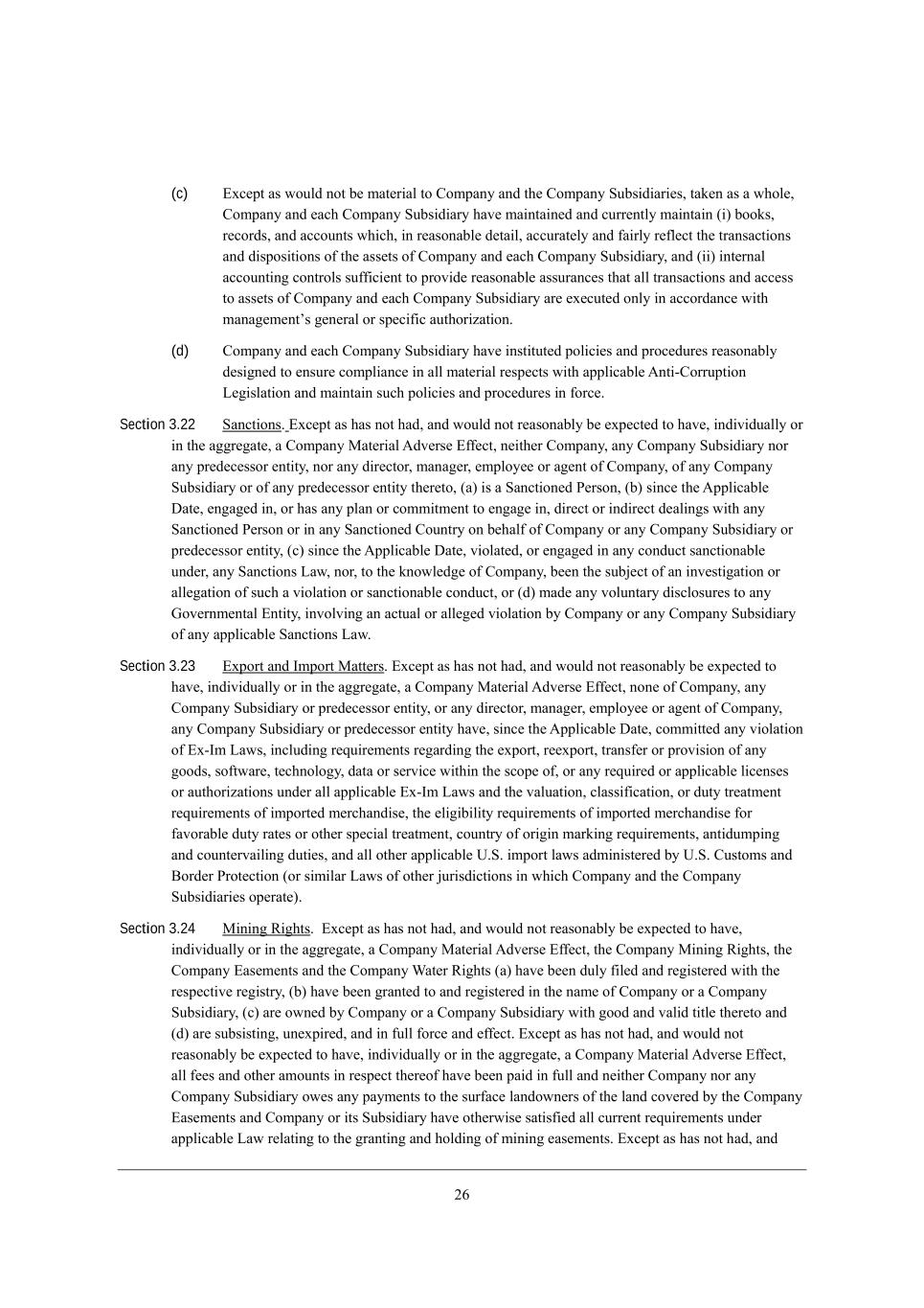04 (c) ?nY[fj Wi mekbZ dej X[ cWj[h_Wb je =ecfWdo WdZ j^[ =ecfWdo MkXi_Z_Wh_[i* jWa[d Wi W m^eb[* =ecfWdo WdZ [WY^ =ecfWdo MkXi_Z_Who ^Wl[ cW_djW_d[Z WdZ Ykhh[djbo cW_djW_d (_) Xeeai* h[YehZi* WdZ WYYekdji m^_Y^* _d h[WiedWXb[ Z[jW_b* WYYkhWj[bo WdZ \W_hbo h[\b[Yj j^[ jhWdiWYj_edi WdZ Z_ifei_j_edi e\ j^[ Wii[ji e\ =ecfWdo WdZ [WY^ =ecfWdo MkXi_Z_Who* WdZ (__) _dj[hdWb WYYekdj_d] Yedjhebi ik\\_Y_[dj je fhel_Z[ h[WiedWXb[ WiikhWdY[i j^Wj Wbb jhWdiWYj_edi WdZ WYY[ii je Wii[ji e\ =ecfWdo WdZ [WY^ =ecfWdo MkXi_Z_Who Wh[ [n[Ykj[Z edbo _d WYYehZWdY[ m_j^ cWdW][c[djui ][d[hWb eh if[Y_\_Y Wkj^eh_pWj_ed, (d) =ecfWdo WdZ [WY^ =ecfWdo MkXi_Z_Who ^Wl[ _dij_jkj[Z feb_Y_[i WdZ fheY[Zkh[i h[WiedWXbo Z[i_]d[Z je [dikh[ Yecfb_WdY[ _d Wbb cWj[h_Wb h[if[Yji m_j^ Wffb_YWXb[ ;dj_+=ehhkfj_ed F[]_ibWj_ed WdZ cW_djW_d ikY^ feb_Y_[i WdZ fheY[Zkh[i _d \ehY[, Section 3.22 MWdYj_edi, ?nY[fj Wi ^Wi dej ^WZ* WdZ mekbZ dej h[WiedWXbo X[ [nf[Yj[Z je ^Wl[* _dZ_l_ZkWbbo eh _d j^[ W]]h[]Wj[* W =ecfWdo GWj[h_Wb ;Zl[hi[ ?\\[Yj* d[_j^[h =ecfWdo* Wdo =ecfWdo MkXi_Z_Who deh Wdo fh[Z[Y[iieh [dj_jo* deh Wdo Z_h[Yjeh* cWdW][h* [cfbeo[[ eh W][dj e\ =ecfWdo* e\ Wdo =ecfWdo MkXi_Z_Who eh e\ Wdo fh[Z[Y[iieh [dj_jo j^[h[je* (W) _i W MWdYj_ed[Z J[hied* (X) i_dY[ j^[ ;ffb_YWXb[ >Wj[* [d]W][Z _d* eh ^Wi Wdo fbWd eh Yecc_jc[dj je [d]W][ _d* Z_h[Yj eh _dZ_h[Yj Z[Wb_d]i m_j^ Wdo MWdYj_ed[Z J[hied eh _d Wdo MWdYj_ed[Z =ekdjho ed X[^Wb\ e\ =ecfWdo eh Wdo =ecfWdo MkXi_Z_Who eh fh[Z[Y[iieh [dj_jo* (Y) i_dY[ j^[ ;ffb_YWXb[ >Wj[* l_ebWj[Z* eh [d]W][Z _d Wdo YedZkYj iWdYj_edWXb[ kdZ[h* Wdo MWdYj_edi FWm* deh* je j^[ ademb[Z][ e\ =ecfWdo* X[[d j^[ ikX`[Yj e\ Wd _dl[ij_]Wj_ed eh Wbb[]Wj_ed e\ ikY^ W l_ebWj_ed eh iWdYj_edWXb[ YedZkYj* eh (Z) cWZ[ Wdo lebkdjWho Z_iYbeikh[i je Wdo Ael[hdc[djWb ?dj_jo* _dlebl_d] Wd WYjkWb eh Wbb[][Z l_ebWj_ed Xo =ecfWdo eh Wdo =ecfWdo MkXi_Z_Who e\ Wdo Wffb_YWXb[ MWdYj_edi FWm, Section 3.23 ?nfehj WdZ Ccfehj GWjj[hi, ?nY[fj Wi ^Wi dej ^WZ* WdZ mekbZ dej h[WiedWXbo X[ [nf[Yj[Z je ^Wl[* _dZ_l_ZkWbbo eh _d j^[ W]]h[]Wj[* W =ecfWdo GWj[h_Wb ;Zl[hi[ ?\\[Yj* ded[ e\ =ecfWdo* Wdo =ecfWdo MkXi_Z_Who eh fh[Z[Y[iieh [dj_jo* eh Wdo Z_h[Yjeh* cWdW][h* [cfbeo[[ eh W][dj e\ =ecfWdo* Wdo =ecfWdo MkXi_Z_Who eh fh[Z[Y[iieh [dj_jo ^Wl[* i_dY[ j^[ ;ffb_YWXb[ >Wj[* Yecc_jj[Z Wdo l_ebWj_ed e\ ?n+Cc FWmi* _dYbkZ_d] h[gk_h[c[dji h[]WhZ_d] j^[ [nfehj* h[[nfehj* jhWdi\[h eh fhel_i_ed e\ Wdo ]eeZi* ie\jmWh[* j[Y^debe]o* ZWjW eh i[hl_Y[ m_j^_d j^[ iYef[ e\* eh Wdo h[gk_h[Z eh Wffb_YWXb[ b_Y[di[i eh Wkj^eh_pWj_edi kdZ[h Wbb Wffb_YWXb[ ?n+Cc FWmi WdZ j^[ lWbkWj_ed* YbWii_\_YWj_ed* eh Zkjo jh[Wjc[dj h[gk_h[c[dji e\ _cfehj[Z c[hY^WdZ_i[* j^[ [b_]_X_b_jo h[gk_h[c[dji e\ _cfehj[Z c[hY^WdZ_i[ \eh \WlehWXb[ Zkjo hWj[i eh ej^[h if[Y_Wb jh[Wjc[dj* Yekdjho e\ eh_]_d cWha_d] h[gk_h[c[dji* Wdj_Zkcf_d] WdZ Yekdj[hlW_b_d] Zkj_[i* WdZ Wbb ej^[h Wffb_YWXb[ O,M, _cfehj bWmi WZc_d_ij[h[Z Xo O,M, =kijeci WdZ <ehZ[h Jhej[Yj_ed (eh i_c_bWh FWmi e\ ej^[h `kh_iZ_Yj_edi _d m^_Y^ =ecfWdo WdZ j^[ =ecfWdo MkXi_Z_Wh_[i ef[hWj[), Section 3.24 G_d_d] L_]^ji, ?nY[fj Wi ^Wi dej ^WZ* WdZ mekbZ dej h[WiedWXbo X[ [nf[Yj[Z je ^Wl[* _dZ_l_ZkWbbo eh _d j^[ W]]h[]Wj[* W =ecfWdo GWj[h_Wb ;Zl[hi[ ?\\[Yj* j^[ =ecfWdo G_d_d] L_]^ji* j^[ =ecfWdo ?Wi[c[dji WdZ j^[ =ecfWdo QWj[h L_]^ji (W) ^Wl[ X[[d Zkbo \_b[Z WdZ h[]_ij[h[Z m_j^ j^[ h[if[Yj_l[ h[]_ijho* (X) ^Wl[ X[[d ]hWdj[Z je WdZ h[]_ij[h[Z _d j^[ dWc[ e\ =ecfWdo eh W =ecfWdo MkXi_Z_Who* (Y) Wh[ emd[Z Xo =ecfWdo eh W =ecfWdo MkXi_Z_Who m_j^ ]eeZ WdZ lWb_Z j_jb[ j^[h[je WdZ (Z) Wh[ ikXi_ij_d]* kd[nf_h[Z* WdZ _d \kbb \ehY[ WdZ [\\[Yj, ?nY[fj Wi ^Wi dej ^WZ* WdZ mekbZ dej h[WiedWXbo X[ [nf[Yj[Z je ^Wl[* _dZ_l_ZkWbbo eh _d j^[ W]]h[]Wj[* W =ecfWdo GWj[h_Wb ;Zl[hi[ ?\\[Yj* Wbb \[[i WdZ ej^[h Wcekdji _d h[if[Yj j^[h[e\ ^Wl[ X[[d fW_Z _d \kbb WdZ d[_j^[h =ecfWdo deh Wdo =ecfWdo MkXi_Z_Who em[i Wdo fWoc[dji je j^[ ikh\WY[ bWdZemd[hi e\ j^[ bWdZ Yel[h[Z Xo j^[ =ecfWdo ?Wi[c[dji WdZ =ecfWdo eh _ji MkXi_Z_Who ^Wl[ ej^[hm_i[ iWj_i\_[Z Wbb Ykhh[dj h[gk_h[c[dji kdZ[h Wffb_YWXb[ FWm h[bWj_d] je j^[ ]hWdj_d] WdZ ^ebZ_d] e\ c_d_d] [Wi[c[dji, ?nY[fj Wi ^Wi dej ^WZ* WdZ