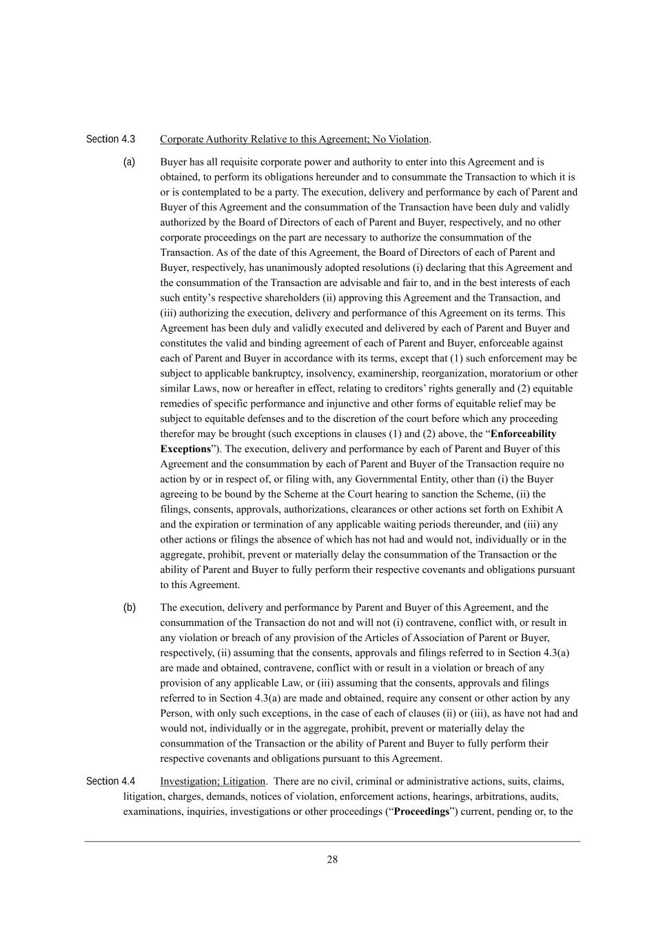 06 Section 4.3 =ehfehWj[ ;kj^eh_jo L[bWj_l[ je j^_i ;]h[[c[dj9 He P_ebWj_ed, (a) <ko[h ^Wi Wbb h[gk_i_j[ YehfehWj[ fem[h WdZ Wkj^eh_jo je [dj[h _dje j^_i ;]h[[c[dj WdZ _i eXjW_d[Z* je f[h\ehc _ji eXb_]Wj_edi ^[h[kdZ[h WdZ je YedikccWj[ j^[ NhWdiWYj_ed je m^_Y^ _j _i eh _i Yedj[cfbWj[Z je X[ W fWhjo, N^[ [n[Ykj_ed* Z[b_l[ho WdZ f[h\ehcWdY[ Xo [WY^ e\ JWh[dj WdZ <ko[h e\ j^_i ;]h[[c[dj WdZ j^[ YedikccWj_ed e\ j^[ NhWdiWYj_ed ^Wl[ X[[d Zkbo WdZ lWb_Zbo Wkj^eh_p[Z Xo j^[ <eWhZ e\ >_h[Yjehi e\ [WY^ e\ JWh[dj WdZ <ko[h* h[if[Yj_l[bo* WdZ de ej^[h YehfehWj[ fheY[[Z_d]i ed j^[ fWhj Wh[ d[Y[iiWho je Wkj^eh_p[ j^[ YedikccWj_ed e\ j^[ NhWdiWYj_ed, ;i e\ j^[ ZWj[ e\ j^_i ;]h[[c[dj* j^[ <eWhZ e\ >_h[Yjehi e\ [WY^ e\ JWh[dj WdZ <ko[h* h[if[Yj_l[bo* ^Wi kdWd_cekibo WZefj[Z h[iebkj_edi (_) Z[YbWh_d] j^Wj j^_i ;]h[[c[dj WdZ j^[ YedikccWj_ed e\ j^[ NhWdiWYj_ed Wh[ WZl_iWXb[ WdZ \W_h je* WdZ _d j^[ X[ij _dj[h[iji e\ [WY^ ikY^ [dj_joui h[if[Yj_l[ i^Wh[^ebZ[hi (__) Wffhel_d] j^_i ;]h[[c[dj WdZ j^[ NhWdiWYj_ed* WdZ (___) Wkj^eh_p_d] j^[ [n[Ykj_ed* Z[b_l[ho WdZ f[h\ehcWdY[ e\ j^_i ;]h[[c[dj ed _ji j[hci, N^_i ;]h[[c[dj ^Wi X[[d Zkbo WdZ lWb_Zbo [n[Ykj[Z WdZ Z[b_l[h[Z Xo [WY^ e\ JWh[dj WdZ <ko[h WdZ Yedij_jkj[i j^[ lWb_Z WdZ X_dZ_d] W]h[[c[dj e\ [WY^ e\ JWh[dj WdZ <ko[h* [d\ehY[WXb[ W]W_dij [WY^ e\ JWh[dj WdZ <ko[h _d WYYehZWdY[ m_j^ _ji j[hci* [nY[fj j^Wj (/) ikY^ [d\ehY[c[dj cWo X[ ikX`[Yj je Wffb_YWXb[ XWdahkfjYo* _diebl[dYo* [nWc_d[hi^_f* h[eh]Wd_pWj_ed* cehWjeh_kc eh ej^[h i_c_bWh FWmi* dem eh ^[h[W\j[h _d [\\[Yj* h[bWj_d] je Yh[Z_jehiu h_]^ji ][d[hWbbo WdZ (0) [gk_jWXb[ h[c[Z_[i e\ if[Y_\_Y f[h\ehcWdY[ WdZ _d`kdYj_l[ WdZ ej^[h \ehci e\ [gk_jWXb[ h[b_[\ cWo X[ ikX`[Yj je [gk_jWXb[ Z[\[di[i WdZ je j^[ Z_iYh[j_ed e\ j^[ Yekhj X[\eh[ m^_Y^ Wdo fheY[[Z_d] j^[h[\eh cWo X[ Xhek]^j (ikY^ [nY[fj_edi _d YbWki[i (/) WdZ (0) WXel[* j^[ rEnforceability Exceptionss), N^[ [n[Ykj_ed* Z[b_l[ho WdZ f[h\ehcWdY[ Xo [WY^ e\ JWh[dj WdZ <ko[h e\ j^_i ;]h[[c[dj WdZ j^[ YedikccWj_ed Xo [WY^ e\ JWh[dj WdZ <ko[h e\ j^[ NhWdiWYj_ed h[gk_h[ de WYj_ed Xo eh _d h[if[Yj e\* eh \_b_d] m_j^* Wdo Ael[hdc[djWb ?dj_jo* ej^[h j^Wd (_) j^[ <ko[h W]h[[_d] je X[ XekdZ Xo j^[ MY^[c[ Wj j^[ =ekhj ^[Wh_d] je iWdYj_ed j^[ MY^[c[* (__) j^[ \_b_d]i* Yedi[dji* WffhelWbi* Wkj^eh_pWj_edi* Yb[WhWdY[i eh ej^[h WYj_edi i[j \ehj^ ed ?n^_X_j ; WdZ j^[ [nf_hWj_ed eh j[hc_dWj_ed e\ Wdo Wffb_YWXb[ mW_j_d] f[h_eZi j^[h[kdZ[h* WdZ (___) Wdo ej^[h WYj_edi eh \_b_d]i j^[ WXi[dY[ e\ m^_Y^ ^Wi dej ^WZ WdZ mekbZ dej* _dZ_l_ZkWbbo eh _d j^[ W]]h[]Wj[* fhe^_X_j* fh[l[dj eh cWj[h_Wbbo Z[bWo j^[ YedikccWj_ed e\ j^[ NhWdiWYj_ed eh j^[ WX_b_jo e\ JWh[dj WdZ <ko[h je \kbbo f[h\ehc j^[_h h[if[Yj_l[ Yel[dWdji WdZ eXb_]Wj_edi fkhikWdj je j^_i ;]h[[c[dj, (b) N^[ [n[Ykj_ed* Z[b_l[ho WdZ f[h\ehcWdY[ Xo JWh[dj WdZ <ko[h e\ j^_i ;]h[[c[dj* WdZ j^[ YedikccWj_ed e\ j^[ NhWdiWYj_ed Ze dej WdZ m_bb dej (_) YedjhWl[d[* Yed\b_Yj m_j^* eh h[ikbj _d Wdo l_ebWj_ed eh Xh[WY^ e\ Wdo fhel_i_ed e\ j^[ ;hj_Yb[i e\ ;iieY_Wj_ed e\ JWh[dj eh <ko[h* h[if[Yj_l[bo* (__) Wiikc_d] j^Wj j^[ Yedi[dji* WffhelWbi WdZ \_b_d]i h[\[hh[Z je _d M[Yj_ed 2,1(W) Wh[ cWZ[ WdZ eXjW_d[Z* YedjhWl[d[* Yed\b_Yj m_j^ eh h[ikbj _d W l_ebWj_ed eh Xh[WY^ e\ Wdo fhel_i_ed e\ Wdo Wffb_YWXb[ FWm* eh (___) Wiikc_d] j^Wj j^[ Yedi[dji* WffhelWbi WdZ \_b_d]i h[\[hh[Z je _d M[Yj_ed 2,1(W) Wh[ cWZ[ WdZ eXjW_d[Z* h[gk_h[ Wdo Yedi[dj eh ej^[h WYj_ed Xo Wdo J[hied* m_j^ edbo ikY^ [nY[fj_edi* _d j^[ YWi[ e\ [WY^ e\ YbWki[i (__) eh (___)* Wi ^Wl[ dej ^WZ WdZ mekbZ dej* _dZ_l_ZkWbbo eh _d j^[ W]]h[]Wj[* fhe^_X_j* fh[l[dj eh cWj[h_Wbbo Z[bWo j^[ YedikccWj_ed e\ j^[ NhWdiWYj_ed eh j^[ WX_b_jo e\ JWh[dj WdZ <ko[h je \kbbo f[h\ehc j^[_h h[if[Yj_l[ Yel[dWdji WdZ eXb_]Wj_edi fkhikWdj je j^_i ;]h[[c[dj, Section 4.4 Cdl[ij_]Wj_ed9 F_j_]Wj_ed, N^[h[ Wh[ de Y_l_b* Yh_c_dWb eh WZc_d_ijhWj_l[ WYj_edi* ik_ji* YbW_ci* b_j_]Wj_ed* Y^Wh][i* Z[cWdZi* dej_Y[i e\ l_ebWj_ed* [d\ehY[c[dj WYj_edi* ^[Wh_d]i* WhX_jhWj_edi* WkZ_ji* [nWc_dWj_edi* _dgk_h_[i* _dl[ij_]Wj_edi eh ej^[h fheY[[Z_d]i (rProceedingss) Ykhh[dj* f[dZ_d] eh* je j^[