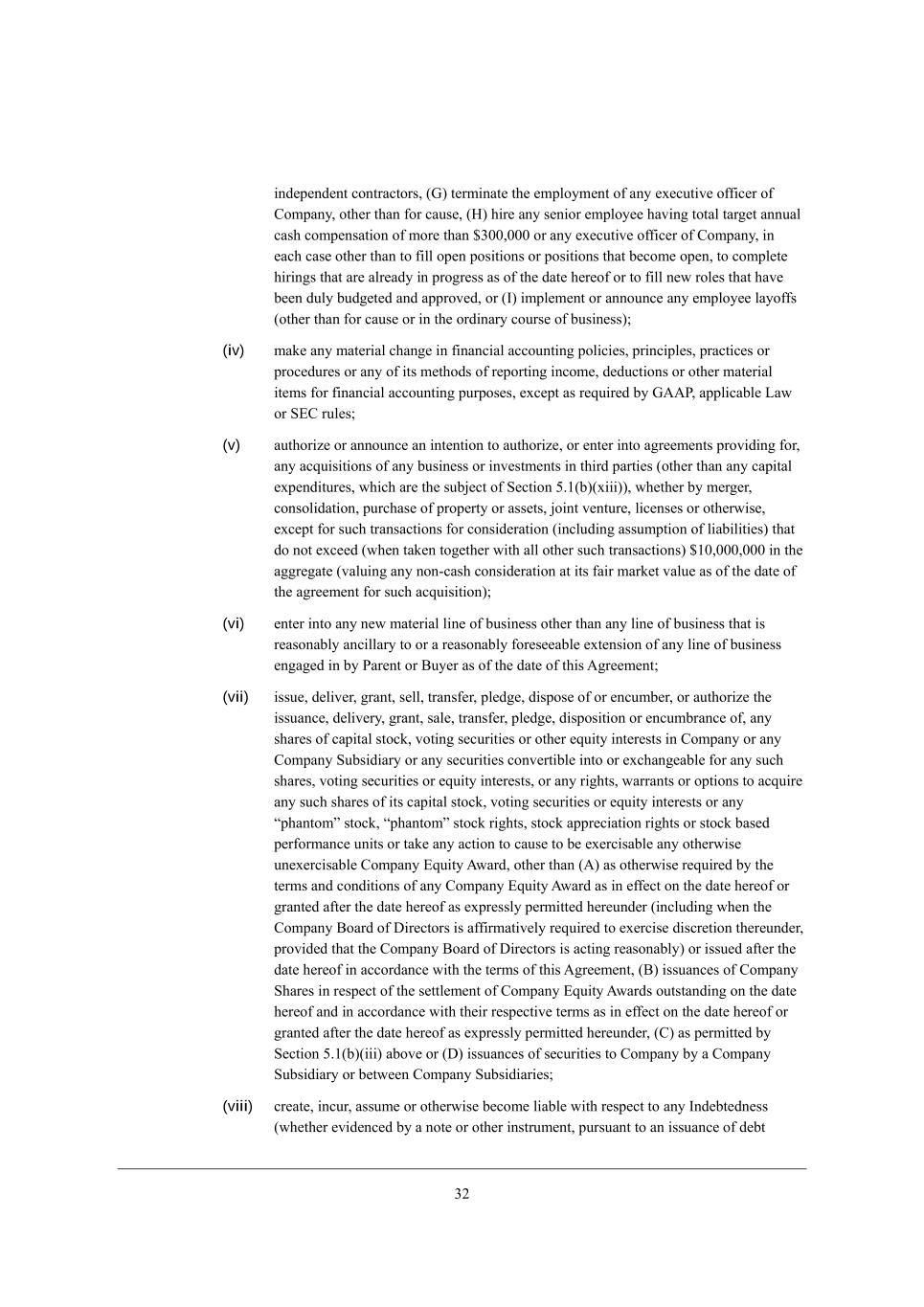 10 _dZ[f[dZ[dj YedjhWYjehi* (A) j[hc_dWj[ j^[ [cfbeoc[dj e\ Wdo [n[Ykj_l[ e\\_Y[h e\ =ecfWdo* ej^[h j^Wd \eh YWki[* (B) ^_h[ Wdo i[d_eh [cfbeo[[ ^Wl_d] jejWb jWh][j WddkWb YWi^ Yecf[diWj_ed e\ ceh[ j^Wd $1..*... eh Wdo [n[Ykj_l[ e\\_Y[h e\ =ecfWdo* _d [WY^ YWi[ ej^[h j^Wd je \_bb ef[d fei_j_edi eh fei_j_edi j^Wj X[Yec[ ef[d* je Yecfb[j[ ^_h_d]i j^Wj Wh[ Wbh[WZo _d fhe]h[ii Wi e\ j^[ ZWj[ ^[h[e\ eh je \_bb d[m heb[i j^Wj ^Wl[ X[[d Zkbo XkZ][j[Z WdZ Wffhel[Z* eh (C) _cfb[c[dj eh WddekdY[ Wdo [cfbeo[[ bWoe\\i (ej^[h j^Wd \eh YWki[ eh _d j^[ ehZ_dWho Yekhi[ e\ Xki_d[ii)9 (iv) cWa[ Wdo cWj[h_Wb Y^Wd][ _d \_dWdY_Wb WYYekdj_d] feb_Y_[i* fh_dY_fb[i* fhWYj_Y[i eh fheY[Zkh[i eh Wdo e\ _ji c[j^eZi e\ h[fehj_d] _dYec[* Z[ZkYj_edi eh ej^[h cWj[h_Wb _j[ci \eh \_dWdY_Wb WYYekdj_d] fkhfei[i* [nY[fj Wi h[gk_h[Z Xo A;;J* Wffb_YWXb[ FWm eh M?= hkb[i9 (v) Wkj^eh_p[ eh WddekdY[ Wd _dj[dj_ed je Wkj^eh_p[* eh [dj[h _dje W]h[[c[dji fhel_Z_d] \eh* Wdo WYgk_i_j_edi e\ Wdo Xki_d[ii eh _dl[ijc[dji _d j^_hZ fWhj_[i (ej^[h j^Wd Wdo YWf_jWb [nf[dZ_jkh[i* m^_Y^ Wh[ j^[ ikX`[Yj e\ M[Yj_ed 3,/(X)(n___))* m^[j^[h Xo c[h][h* Yedieb_ZWj_ed* fkhY^Wi[ e\ fhef[hjo eh Wii[ji* `e_dj l[djkh[* b_Y[di[i eh ej^[hm_i[* [nY[fj \eh ikY^ jhWdiWYj_edi \eh Yedi_Z[hWj_ed (_dYbkZ_d] Wiikcfj_ed e\ b_WX_b_j_[i) j^Wj Ze dej [nY[[Z (m^[d jWa[d je][j^[h m_j^ Wbb ej^[h ikY^ jhWdiWYj_edi) $/.*...*... _d j^[ W]]h[]Wj[ (lWbk_d] Wdo ded+YWi^ Yedi_Z[hWj_ed Wj _ji \W_h cWha[j lWbk[ Wi e\ j^[ ZWj[ e\ j^[ W]h[[c[dj \eh ikY^ WYgk_i_j_ed)9 (vi) [dj[h _dje Wdo d[m cWj[h_Wb b_d[ e\ Xki_d[ii ej^[h j^Wd Wdo b_d[ e\ Xki_d[ii j^Wj _i h[WiedWXbo WdY_bbWho je eh W h[WiedWXbo \eh[i[[WXb[ [nj[di_ed e\ Wdo b_d[ e\ Xki_d[ii [d]W][Z _d Xo JWh[dj eh <ko[h Wi e\ j^[ ZWj[ e\ j^_i ;]h[[c[dj9 (vii) _iik[* Z[b_l[h* ]hWdj* i[bb* jhWdi\[h* fb[Z][* Z_ifei[ e\ eh [dYkcX[h* eh Wkj^eh_p[ j^[ _iikWdY[* Z[b_l[ho* ]hWdj* iWb[* jhWdi\[h* fb[Z][* Z_ifei_j_ed eh [dYkcXhWdY[ e\* Wdo i^Wh[i e\ YWf_jWb ijeYa* lej_d] i[Ykh_j_[i eh ej^[h [gk_jo _dj[h[iji _d =ecfWdo eh Wdo =ecfWdo MkXi_Z_Who eh Wdo i[Ykh_j_[i Yedl[hj_Xb[ _dje eh [nY^Wd][WXb[ \eh Wdo ikY^ i^Wh[i* lej_d] i[Ykh_j_[i eh [gk_jo _dj[h[iji* eh Wdo h_]^ji* mWhhWdji eh efj_edi je WYgk_h[ Wdo ikY^ i^Wh[i e\ _ji YWf_jWb ijeYa* lej_d] i[Ykh_j_[i eh [gk_jo _dj[h[iji eh Wdo rf^Wdjecs ijeYa* rf^Wdjecs ijeYa h_]^ji* ijeYa Wffh[Y_Wj_ed h_]^ji eh ijeYa XWi[Z f[h\ehcWdY[ kd_ji eh jWa[ Wdo WYj_ed je YWki[ je X[ [n[hY_iWXb[ Wdo ej^[hm_i[ kd[n[hY_iWXb[ =ecfWdo ?gk_jo ;mWhZ* ej^[h j^Wd (;) Wi ej^[hm_i[ h[gk_h[Z Xo j^[ j[hci WdZ YedZ_j_edi e\ Wdo =ecfWdo ?gk_jo ;mWhZ Wi _d [\\[Yj ed j^[ ZWj[ ^[h[e\ eh ]hWdj[Z W\j[h j^[ ZWj[ ^[h[e\ Wi [nfh[iibo f[hc_jj[Z ^[h[kdZ[h (_dYbkZ_d] m^[d j^[ =ecfWdo <eWhZ e\ >_h[Yjehi _i W\\_hcWj_l[bo h[gk_h[Z je [n[hY_i[ Z_iYh[j_ed j^[h[kdZ[h* fhel_Z[Z j^Wj j^[ =ecfWdo <eWhZ e\ >_h[Yjehi _i WYj_d] h[WiedWXbo) eh _iik[Z W\j[h j^[ ZWj[ ^[h[e\ _d WYYehZWdY[ m_j^ j^[ j[hci e\ j^_i ;]h[[c[dj* (<) _iikWdY[i e\ =ecfWdo M^Wh[i _d h[if[Yj e\ j^[ i[jjb[c[dj e\ =ecfWdo ?gk_jo ;mWhZi ekjijWdZ_d] ed j^[ ZWj[ ^[h[e\ WdZ _d WYYehZWdY[ m_j^ j^[_h h[if[Yj_l[ j[hci Wi _d [\\[Yj ed j^[ ZWj[ ^[h[e\ eh ]hWdj[Z W\j[h j^[ ZWj[ ^[h[e\ Wi [nfh[iibo f[hc_jj[Z ^[h[kdZ[h* (=) Wi f[hc_jj[Z Xo M[Yj_ed 3,/(X)(___) WXel[ eh (>) _iikWdY[i e\ i[Ykh_j_[i je =ecfWdo Xo W =ecfWdo MkXi_Z_Who eh X[jm[[d =ecfWdo MkXi_Z_Wh_[i9 (viii) Yh[Wj[* _dYkh* Wiikc[ eh ej^[hm_i[ X[Yec[ b_WXb[ m_j^ h[if[Yj je Wdo CdZ[Xj[Zd[ii (m^[j^[h [l_Z[dY[Z Xo W dej[ eh ej^[h _dijhkc[dj* fkhikWdj je Wd _iikWdY[ e\ Z[Xj