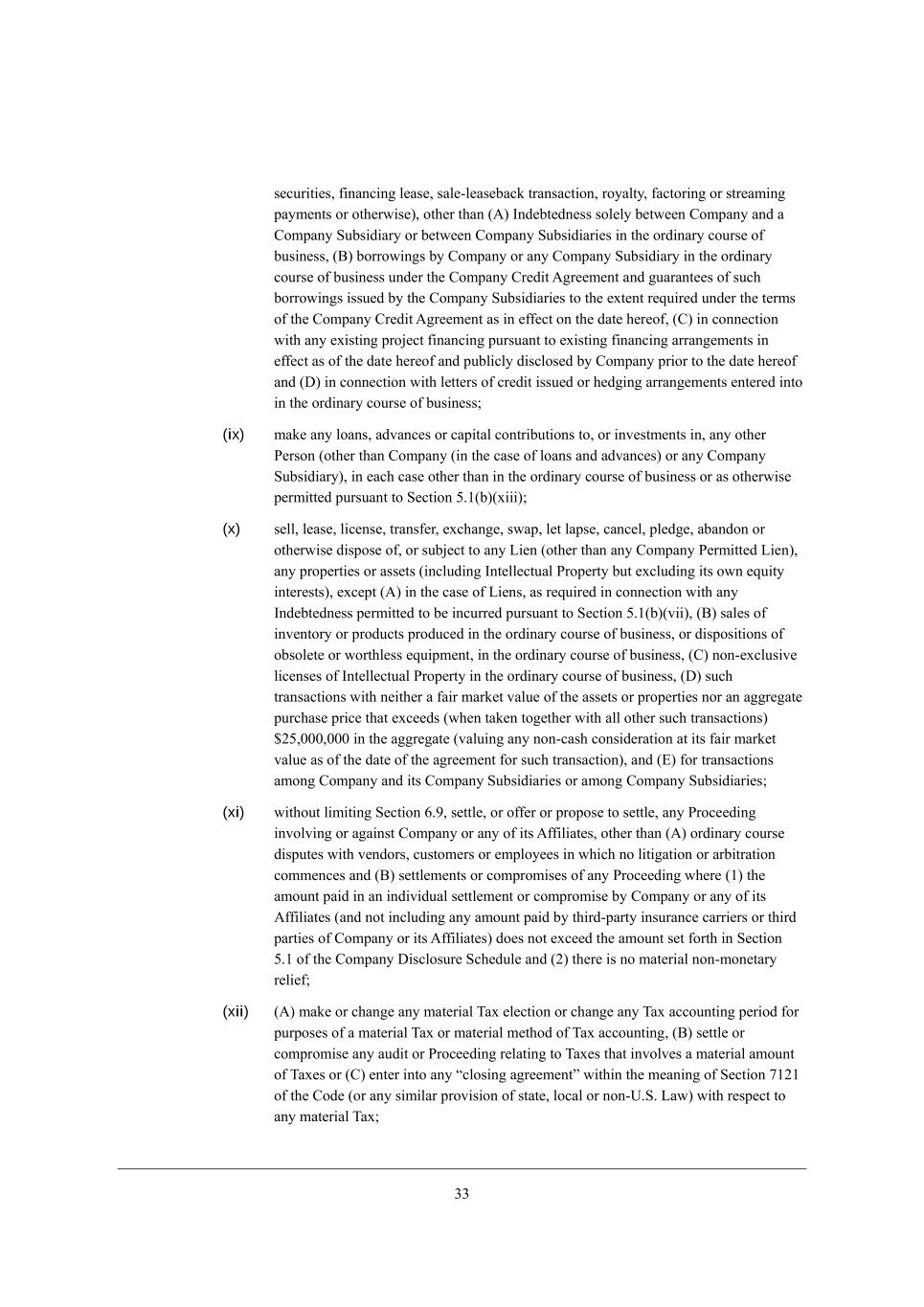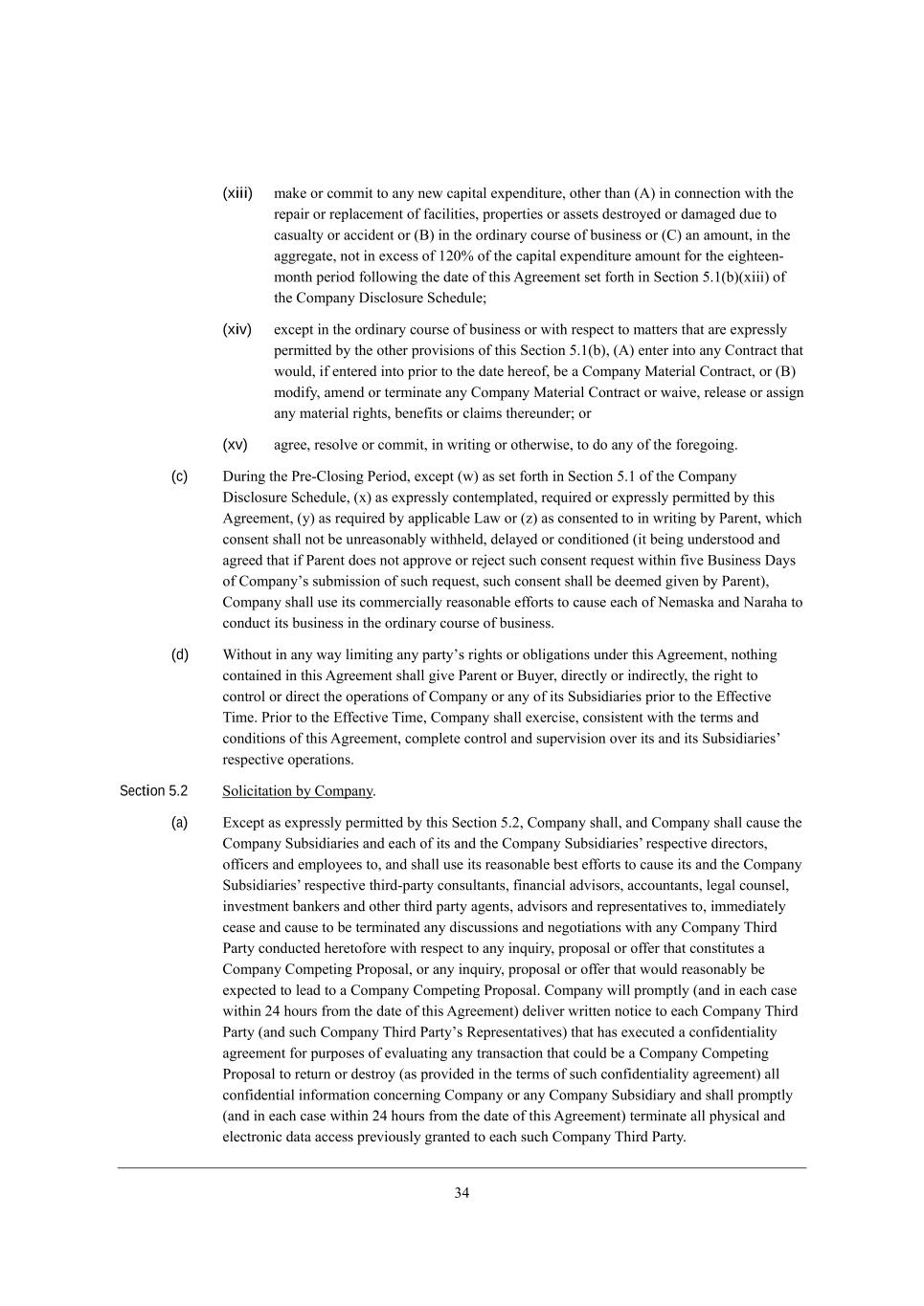 12 (xiii) cWa[ eh Yecc_j je Wdo d[m YWf_jWb [nf[dZ_jkh[* ej^[h j^Wd (;) _d Yedd[Yj_ed m_j^ j^[ h[fW_h eh h[fbWY[c[dj e\ \WY_b_j_[i* fhef[hj_[i eh Wii[ji Z[ijheo[Z eh ZWcW][Z Zk[ je YWikWbjo eh WYY_Z[dj eh (<) _d j^[ ehZ_dWho Yekhi[ e\ Xki_d[ii eh (=) Wd Wcekdj* _d j^[ W]]h[]Wj[* dej _d [nY[ii e\ /0.% e\ j^[ YWf_jWb [nf[dZ_jkh[ Wcekdj \eh j^[ [_]^j[[d+ cedj^ f[h_eZ \ebbem_d] j^[ ZWj[ e\ j^_i ;]h[[c[dj i[j \ehj^ _d M[Yj_ed 3,/(X)(n___) e\ j^[ =ecfWdo >_iYbeikh[ MY^[Zkb[9 (xiv) [nY[fj _d j^[ ehZ_dWho Yekhi[ e\ Xki_d[ii eh m_j^ h[if[Yj je cWjj[hi j^Wj Wh[ [nfh[iibo f[hc_jj[Z Xo j^[ ej^[h fhel_i_edi e\ j^_i M[Yj_ed 3,/(X)* (;) [dj[h _dje Wdo =edjhWYj j^Wj mekbZ* _\ [dj[h[Z _dje fh_eh je j^[ ZWj[ ^[h[e\* X[ W =ecfWdo GWj[h_Wb =edjhWYj* eh (<) ceZ_\o* Wc[dZ eh j[hc_dWj[ Wdo =ecfWdo GWj[h_Wb =edjhWYj eh mW_l[* h[b[Wi[ eh Wii_]d Wdo cWj[h_Wb h_]^ji* X[d[\_ji eh YbW_ci j^[h[kdZ[h9 eh (xv) W]h[[* h[iebl[ eh Yecc_j* _d mh_j_d] eh ej^[hm_i[* je Ze Wdo e\ j^[ \eh[]e_d], (c) >kh_d] j^[ Jh[+=bei_d] J[h_eZ* [nY[fj (m) Wi i[j \ehj^ _d M[Yj_ed 3,/ e\ j^[ =ecfWdo >_iYbeikh[ MY^[Zkb[* (n) Wi [nfh[iibo Yedj[cfbWj[Z* h[gk_h[Z eh [nfh[iibo f[hc_jj[Z Xo j^_i ;]h[[c[dj* (o) Wi h[gk_h[Z Xo Wffb_YWXb[ FWm eh (p) Wi Yedi[dj[Z je _d mh_j_d] Xo JWh[dj* m^_Y^ Yedi[dj i^Wbb dej X[ kdh[WiedWXbo m_j^^[bZ* Z[bWo[Z eh YedZ_j_ed[Z (_j X[_d] kdZ[hijeeZ WdZ W]h[[Z j^Wj _\ JWh[dj Ze[i dej Wffhel[ eh h[`[Yj ikY^ Yedi[dj h[gk[ij m_j^_d \_l[ <ki_d[ii >Woi e\ =ecfWdoui ikXc_ii_ed e\ ikY^ h[gk[ij* ikY^ Yedi[dj i^Wbb X[ Z[[c[Z ]_l[d Xo JWh[dj)* =ecfWdo i^Wbb ki[ _ji Yecc[hY_Wbbo h[WiedWXb[ [\\ehji je YWki[ [WY^ e\ H[cWiaW WdZ HWhW^W je YedZkYj _ji Xki_d[ii _d j^[ ehZ_dWho Yekhi[ e\ Xki_d[ii, (d) Q_j^ekj _d Wdo mWo b_c_j_d] Wdo fWhjoui h_]^ji eh eXb_]Wj_edi kdZ[h j^_i ;]h[[c[dj* dej^_d] YedjW_d[Z _d j^_i ;]h[[c[dj i^Wbb ]_l[ JWh[dj eh <ko[h* Z_h[Yjbo eh _dZ_h[Yjbo* j^[ h_]^j je Yedjheb eh Z_h[Yj j^[ ef[hWj_edi e\ =ecfWdo eh Wdo e\ _ji MkXi_Z_Wh_[i fh_eh je j^[ ?\\[Yj_l[ N_c[, Jh_eh je j^[ ?\\[Yj_l[ N_c[* =ecfWdo i^Wbb [n[hY_i[* Yedi_ij[dj m_j^ j^[ j[hci WdZ YedZ_j_edi e\ j^_i ;]h[[c[dj* Yecfb[j[ Yedjheb WdZ ikf[hl_i_ed el[h _ji WdZ _ji MkXi_Z_Wh_[iu h[if[Yj_l[ ef[hWj_edi, Section 5.2 Meb_Y_jWj_ed Xo =ecfWdo, (a) ?nY[fj Wi [nfh[iibo f[hc_jj[Z Xo j^_i M[Yj_ed 3,0* =ecfWdo i^Wbb* WdZ =ecfWdo i^Wbb YWki[ j^[ =ecfWdo MkXi_Z_Wh_[i WdZ [WY^ e\ _ji WdZ j^[ =ecfWdo MkXi_Z_Wh_[iu h[if[Yj_l[ Z_h[Yjehi* e\\_Y[hi WdZ [cfbeo[[i je* WdZ i^Wbb ki[ _ji h[WiedWXb[ X[ij [\\ehji je YWki[ _ji WdZ j^[ =ecfWdo MkXi_Z_Wh_[iu h[if[Yj_l[ j^_hZ+fWhjo YedikbjWdji* \_dWdY_Wb WZl_iehi* WYYekdjWdji* b[]Wb Yekdi[b* _dl[ijc[dj XWda[hi WdZ ej^[h j^_hZ fWhjo W][dji* WZl_iehi WdZ h[fh[i[djWj_l[i je* _cc[Z_Wj[bo Y[Wi[ WdZ YWki[ je X[ j[hc_dWj[Z Wdo Z_iYkii_edi WdZ d[]ej_Wj_edi m_j^ Wdo =ecfWdo N^_hZ JWhjo YedZkYj[Z ^[h[je\eh[ m_j^ h[if[Yj je Wdo _dgk_ho* fhefeiWb eh e\\[h j^Wj Yedij_jkj[i W =ecfWdo =ecf[j_d] JhefeiWb* eh Wdo _dgk_ho* fhefeiWb eh e\\[h j^Wj mekbZ h[WiedWXbo X[ [nf[Yj[Z je b[WZ je W =ecfWdo =ecf[j_d] JhefeiWb, =ecfWdo m_bb fhecfjbo (WdZ _d [WY^ YWi[ m_j^_d 02 ^ekhi \hec j^[ ZWj[ e\ j^_i ;]h[[c[dj) Z[b_l[h mh_jj[d dej_Y[ je [WY^ =ecfWdo N^_hZ JWhjo (WdZ ikY^ =ecfWdo N^_hZ JWhjoui L[fh[i[djWj_l[i) j^Wj ^Wi [n[Ykj[Z W Yed\_Z[dj_Wb_jo W]h[[c[dj \eh fkhfei[i e\ [lWbkWj_d] Wdo jhWdiWYj_ed j^Wj YekbZ X[ W =ecfWdo =ecf[j_d] JhefeiWb je h[jkhd eh Z[ijheo (Wi fhel_Z[Z _d j^[ j[hci e\ ikY^ Yed\_Z[dj_Wb_jo W]h[[c[dj) Wbb Yed\_Z[dj_Wb _d\ehcWj_ed YedY[hd_d] =ecfWdo eh Wdo =ecfWdo MkXi_Z_Who WdZ i^Wbb fhecfjbo (WdZ _d [WY^ YWi[ m_j^_d 02 ^ekhi \hec j^[ ZWj[ e\ j^_i ;]h[[c[dj) j[hc_dWj[ Wbb f^oi_YWb WdZ [b[Yjhed_Y ZWjW WYY[ii fh[l_ekibo ]hWdj[Z je [WY^ ikY^ =ecfWdo N^_hZ JWhjo,