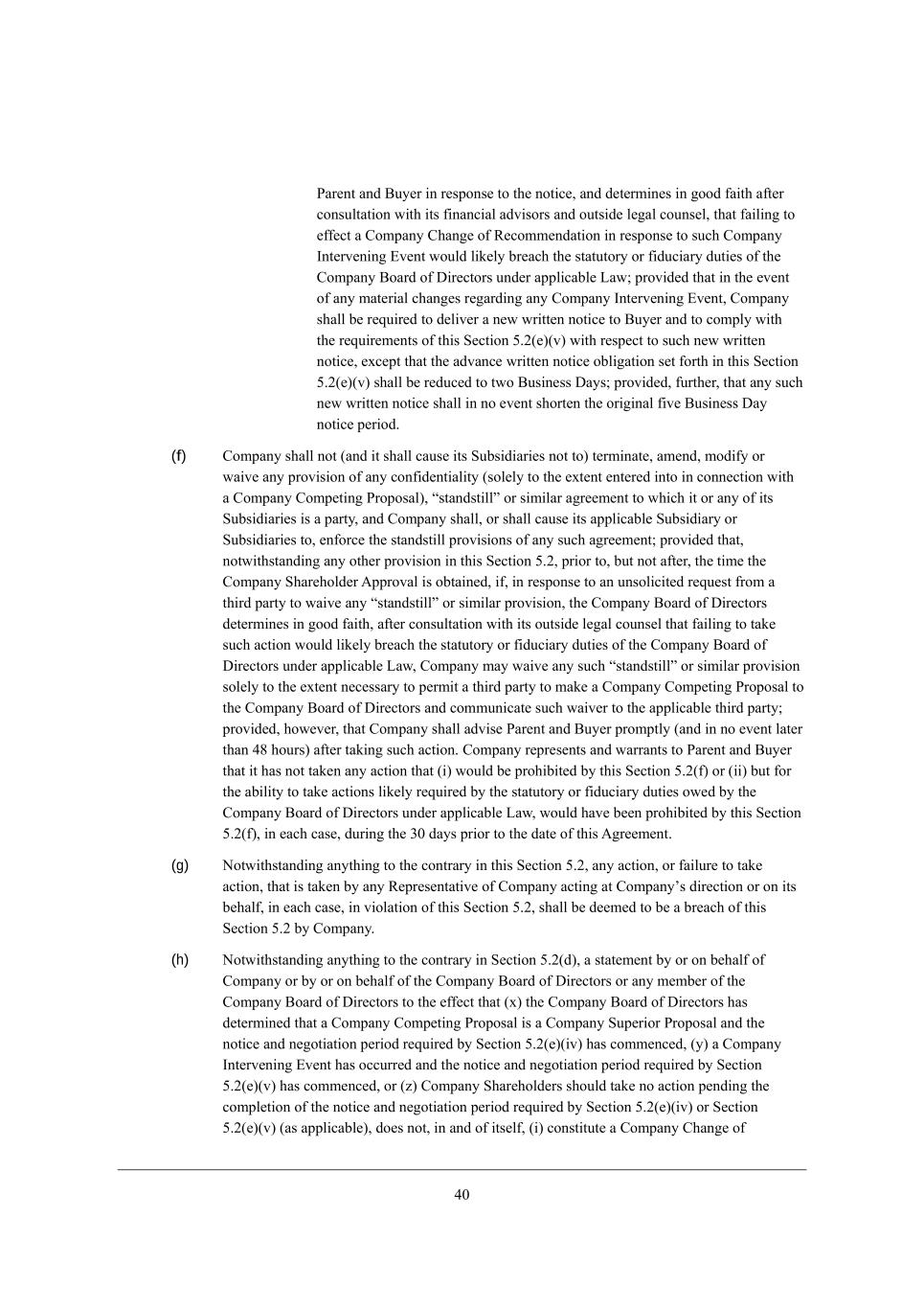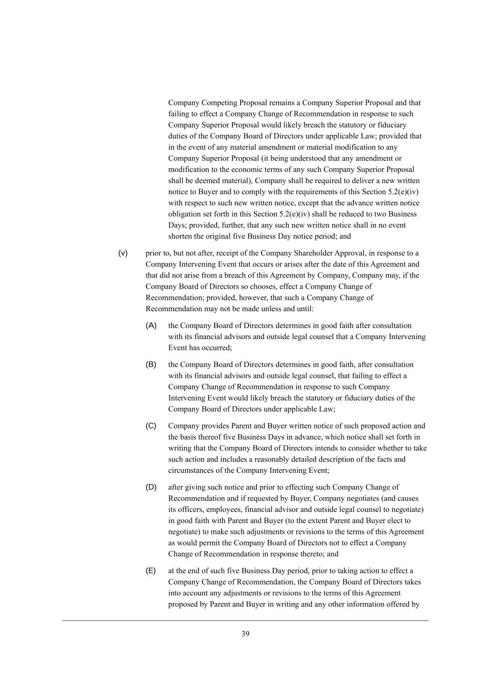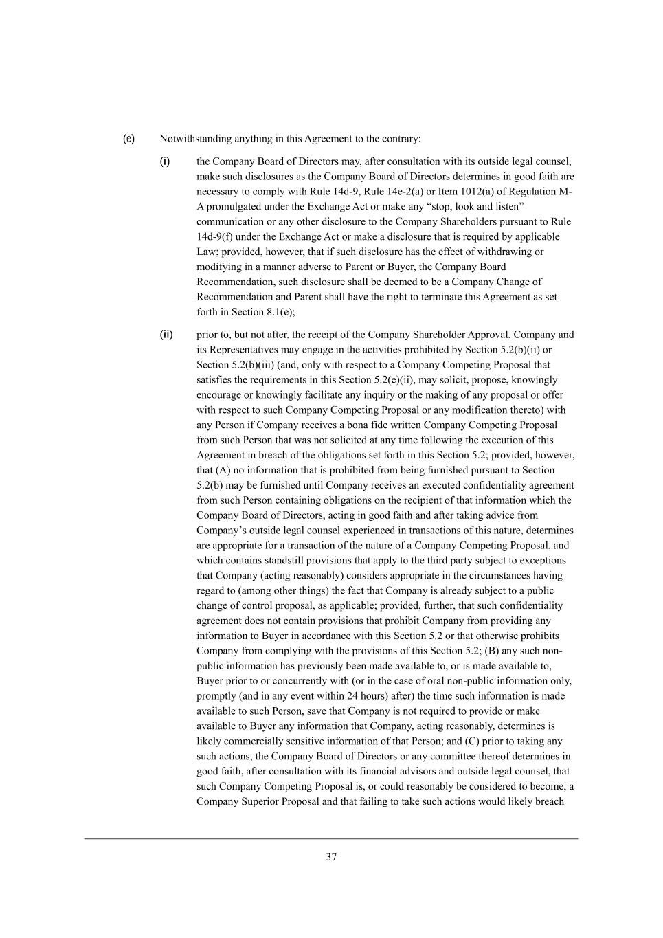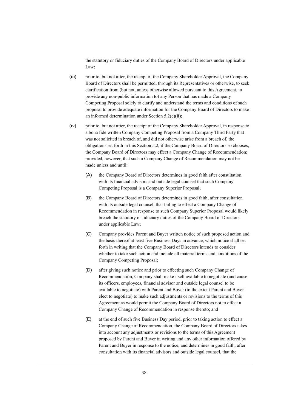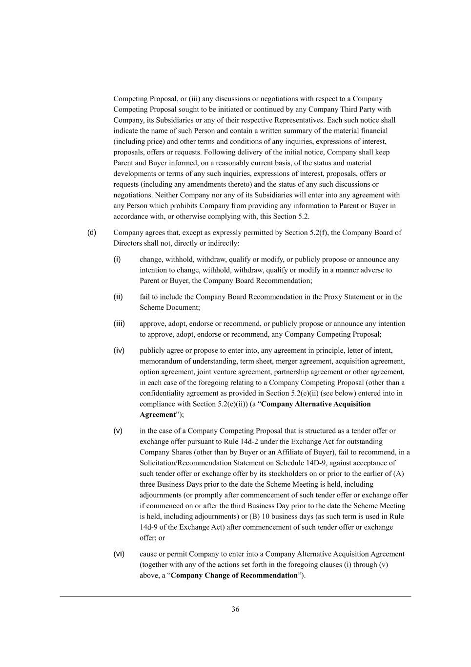 14 =ecf[j_d] JhefeiWb* eh (___) Wdo Z_iYkii_edi eh d[]ej_Wj_edi m_j^ h[if[Yj je W =ecfWdo =ecf[j_d] JhefeiWb iek]^j je X[ _d_j_Wj[Z eh Yedj_dk[Z Xo Wdo =ecfWdo N^_hZ JWhjo m_j^ =ecfWdo* _ji MkXi_Z_Wh_[i eh Wdo e\ j^[_h h[if[Yj_l[ L[fh[i[djWj_l[i, ?WY^ ikY^ dej_Y[ i^Wbb _dZ_YWj[ j^[ dWc[ e\ ikY^ J[hied WdZ YedjW_d W mh_jj[d ikccWho e\ j^[ cWj[h_Wb \_dWdY_Wb (_dYbkZ_d] fh_Y[) WdZ ej^[h j[hci WdZ YedZ_j_edi e\ Wdo _dgk_h_[i* [nfh[ii_edi e\ _dj[h[ij* fhefeiWbi* e\\[hi eh h[gk[iji, @ebbem_d] Z[b_l[ho e\ j^[ _d_j_Wb dej_Y[* =ecfWdo i^Wbb a[[f JWh[dj WdZ <ko[h _d\ehc[Z* ed W h[WiedWXbo Ykhh[dj XWi_i* e\ j^[ ijWjki WdZ cWj[h_Wb Z[l[befc[dji eh j[hci e\ Wdo ikY^ _dgk_h_[i* [nfh[ii_edi e\ _dj[h[ij* fhefeiWbi* e\\[hi eh h[gk[iji (_dYbkZ_d] Wdo Wc[dZc[dji j^[h[je) WdZ j^[ ijWjki e\ Wdo ikY^ Z_iYkii_edi eh d[]ej_Wj_edi, H[_j^[h =ecfWdo deh Wdo e\ _ji MkXi_Z_Wh_[i m_bb [dj[h _dje Wdo W]h[[c[dj m_j^ Wdo J[hied m^_Y^ fhe^_X_ji =ecfWdo \hec fhel_Z_d] Wdo _d\ehcWj_ed je JWh[dj eh <ko[h _d WYYehZWdY[ m_j^* eh ej^[hm_i[ Yecfbo_d] m_j^* j^_i M[Yj_ed 3,0, (d) =ecfWdo W]h[[i j^Wj* [nY[fj Wi [nfh[iibo f[hc_jj[Z Xo M[Yj_ed 3,0(\)* j^[ =ecfWdo <eWhZ e\ >_h[Yjehi i^Wbb dej* Z_h[Yjbo eh _dZ_h[Yjbo8 (i) Y^Wd][* m_j^^ebZ* m_j^ZhWm* gkWb_\o eh ceZ_\o* eh fkXb_Ybo fhefei[ eh WddekdY[ Wdo _dj[dj_ed je Y^Wd][* m_j^^ebZ* m_j^ZhWm* gkWb_\o eh ceZ_\o _d W cWdd[h WZl[hi[ je JWh[dj eh <ko[h* j^[ =ecfWdo <eWhZ L[Yecc[dZWj_ed9 (ii) \W_b je _dYbkZ[ j^[ =ecfWdo <eWhZ L[Yecc[dZWj_ed _d j^[ Jheno MjWj[c[dj eh _d j^[ MY^[c[ >eYkc[dj9 (iii) Wffhel[* WZefj* [dZehi[ eh h[Yecc[dZ* eh fkXb_Ybo fhefei[ eh WddekdY[ Wdo _dj[dj_ed je Wffhel[* WZefj* [dZehi[ eh h[Yecc[dZ* Wdo =ecfWdo =ecf[j_d] JhefeiWb9 (iv) fkXb_Ybo W]h[[ eh fhefei[ je [dj[h _dje* Wdo W]h[[c[dj _d fh_dY_fb[* b[jj[h e\ _dj[dj* c[cehWdZkc e\ kdZ[hijWdZ_d]* j[hc i^[[j* c[h][h W]h[[c[dj* WYgk_i_j_ed W]h[[c[dj* efj_ed W]h[[c[dj* `e_dj l[djkh[ W]h[[c[dj* fWhjd[hi^_f W]h[[c[dj eh ej^[h W]h[[c[dj* _d [WY^ YWi[ e\ j^[ \eh[]e_d] h[bWj_d] je W =ecfWdo =ecf[j_d] JhefeiWb (ej^[h j^Wd W Yed\_Z[dj_Wb_jo W]h[[c[dj Wi fhel_Z[Z _d M[Yj_ed 3,0([)(__) (i[[ X[bem) [dj[h[Z _dje _d Yecfb_WdY[ m_j^ M[Yj_ed 3,0([)(__)) (W rCompany Alternative Acquisition Agreements)9 (v) _d j^[ YWi[ e\ W =ecfWdo =ecf[j_d] JhefeiWb j^Wj _i ijhkYjkh[Z Wi W j[dZ[h e\\[h eh [nY^Wd][ e\\[h fkhikWdj je Lkb[ /2Z+0 kdZ[h j^[ ?nY^Wd][ ;Yj \eh ekjijWdZ_d] =ecfWdo M^Wh[i (ej^[h j^Wd Xo <ko[h eh Wd ;\\_b_Wj[ e\ <ko[h)* \W_b je h[Yecc[dZ* _d W Meb_Y_jWj_ed-L[Yecc[dZWj_ed MjWj[c[dj ed MY^[Zkb[ /2>+7* W]W_dij WYY[fjWdY[ e\ ikY^ j[dZ[h e\\[h eh [nY^Wd][ e\\[h Xo _ji ijeYa^ebZ[hi ed eh fh_eh je j^[ [Whb_[h e\ (;) j^h[[ <ki_d[ii >Woi fh_eh je j^[ ZWj[ j^[ MY^[c[ G[[j_d] _i ^[bZ* _dYbkZ_d] WZ`ekhdc[dji (eh fhecfjbo W\j[h Yecc[dY[c[dj e\ ikY^ j[dZ[h e\\[h eh [nY^Wd][ e\\[h _\ Yecc[dY[Z ed eh W\j[h j^[ j^_hZ <ki_d[ii >Wo fh_eh je j^[ ZWj[ j^[ MY^[c[ G[[j_d] _i ^[bZ* _dYbkZ_d] WZ`ekhdc[dji) eh (<) /. Xki_d[ii ZWoi (Wi ikY^ j[hc _i ki[Z _d Lkb[ /2Z+7 e\ j^[ ?nY^Wd][ ;Yj) W\j[h Yecc[dY[c[dj e\ ikY^ j[dZ[h e\\[h eh [nY^Wd][ e\\[h9 eh (vi) YWki[ eh f[hc_j =ecfWdo je [dj[h _dje W =ecfWdo ;bj[hdWj_l[ ;Ygk_i_j_ed ;]h[[c[dj (je][j^[h m_j^ Wdo e\ j^[ WYj_edi i[j \ehj^ _d j^[ \eh[]e_d] YbWki[i (_) j^hek]^ (l) WXel[* W rCompany Change of Recommendations),