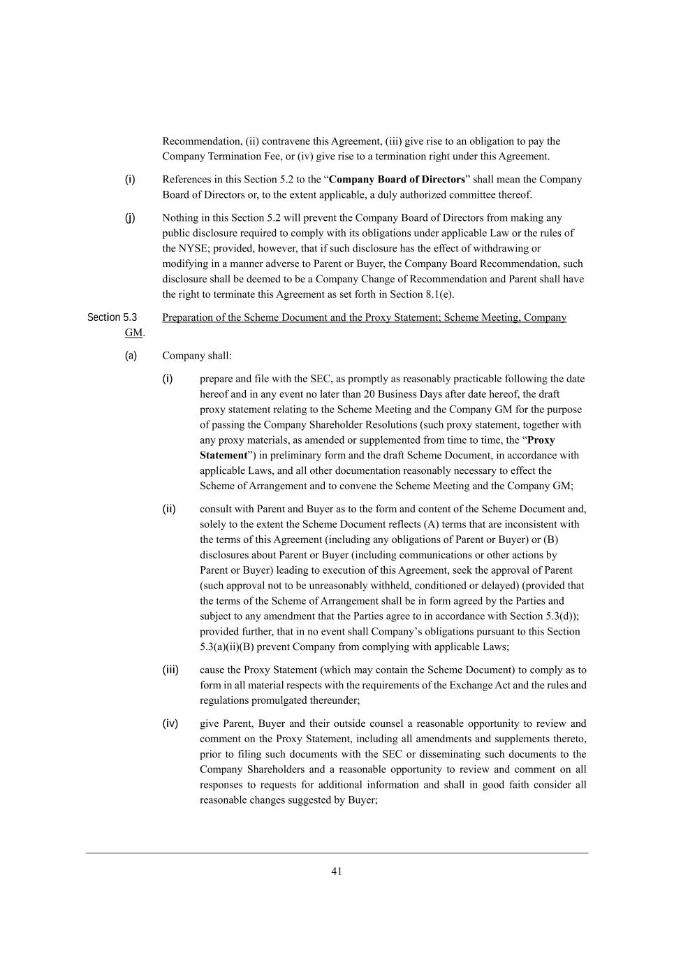 2/ L[Yecc[dZWj_ed* (__) YedjhWl[d[ j^_i ;]h[[c[dj* (___) ]_l[ h_i[ je Wd eXb_]Wj_ed je fWo j^[ =ecfWdo N[hc_dWj_ed @[[* eh (_l) ]_l[ h_i[ je W j[hc_dWj_ed h_]^j kdZ[h j^_i ;]h[[c[dj, (i) L[\[h[dY[i _d j^_i M[Yj_ed 3,0 je j^[ rCompany Board of Directorss i^Wbb c[Wd j^[ =ecfWdo <eWhZ e\ >_h[Yjehi eh* je j^[ [nj[dj Wffb_YWXb[* W Zkbo Wkj^eh_p[Z Yecc_jj[[ j^[h[e\, (j) Hej^_d] _d j^_i M[Yj_ed 3,0 m_bb fh[l[dj j^[ =ecfWdo <eWhZ e\ >_h[Yjehi \hec cWa_d] Wdo fkXb_Y Z_iYbeikh[ h[gk_h[Z je Yecfbo m_j^ _ji eXb_]Wj_edi kdZ[h Wffb_YWXb[ FWm eh j^[ hkb[i e\ j^[ HSM?9 fhel_Z[Z* ^em[l[h* j^Wj _\ ikY^ Z_iYbeikh[ ^Wi j^[ [\\[Yj e\ m_j^ZhWm_d] eh ceZ_\o_d] _d W cWdd[h WZl[hi[ je JWh[dj eh <ko[h* j^[ =ecfWdo <eWhZ L[Yecc[dZWj_ed* ikY^ Z_iYbeikh[ i^Wbb X[ Z[[c[Z je X[ W =ecfWdo =^Wd][ e\ L[Yecc[dZWj_ed WdZ JWh[dj i^Wbb ^Wl[ j^[ h_]^j je j[hc_dWj[ j^_i ;]h[[c[dj Wi i[j \ehj^ _d M[Yj_ed 6,/([), Section 5.3 Jh[fWhWj_ed e\ j^[ MY^[c[ >eYkc[dj WdZ j^[ Jheno MjWj[c[dj9 MY^[c[ G[[j_d]* =ecfWdo AG, (a) =ecfWdo i^Wbb8 (i) fh[fWh[ WdZ \_b[ m_j^ j^[ M?=* Wi fhecfjbo Wi h[WiedWXbo fhWYj_YWXb[ \ebbem_d] j^[ ZWj[ ^[h[e\ WdZ _d Wdo [l[dj de bWj[h j^Wd 0. <ki_d[ii >Woi W\j[h ZWj[ ^[h[e\* j^[ ZhW\j fheno ijWj[c[dj h[bWj_d] je j^[ MY^[c[ G[[j_d] WdZ j^[ =ecfWdo AG \eh j^[ fkhfei[ e\ fWii_d] j^[ =ecfWdo M^Wh[^ebZ[h L[iebkj_edi (ikY^ fheno ijWj[c[dj* je][j^[h m_j^ Wdo fheno cWj[h_Wbi* Wi Wc[dZ[Z eh ikffb[c[dj[Z \hec j_c[ je j_c[* j^[ rProxy Statements) _d fh[b_c_dWho \ehc WdZ j^[ ZhW\j MY^[c[ >eYkc[dj* _d WYYehZWdY[ m_j^ Wffb_YWXb[ FWmi* WdZ Wbb ej^[h ZeYkc[djWj_ed h[WiedWXbo d[Y[iiWho je [\\[Yj j^[ MY^[c[ e\ ;hhWd][c[dj WdZ je Yedl[d[ j^[ MY^[c[ G[[j_d] WdZ j^[ =ecfWdo AG9 (ii) Yedikbj m_j^ JWh[dj WdZ <ko[h Wi je j^[ \ehc WdZ Yedj[dj e\ j^[ MY^[c[ >eYkc[dj WdZ* ieb[bo je j^[ [nj[dj j^[ MY^[c[ >eYkc[dj h[\b[Yji (;) j[hci j^Wj Wh[ _dYedi_ij[dj m_j^ j^[ j[hci e\ j^_i ;]h[[c[dj (_dYbkZ_d] Wdo eXb_]Wj_edi e\ JWh[dj eh <ko[h) eh (<) Z_iYbeikh[i WXekj JWh[dj eh <ko[h (_dYbkZ_d] Yecckd_YWj_edi eh ej^[h WYj_edi Xo JWh[dj eh <ko[h) b[WZ_d] je [n[Ykj_ed e\ j^_i ;]h[[c[dj* i[[a j^[ WffhelWb e\ JWh[dj (ikY^ WffhelWb dej je X[ kdh[WiedWXbo m_j^^[bZ* YedZ_j_ed[Z eh Z[bWo[Z) (fhel_Z[Z j^Wj j^[ j[hci e\ j^[ MY^[c[ e\ ;hhWd][c[dj i^Wbb X[ _d \ehc W]h[[Z Xo j^[ JWhj_[i WdZ ikX`[Yj je Wdo Wc[dZc[dj j^Wj j^[ JWhj_[i W]h[[ je _d WYYehZWdY[ m_j^ M[Yj_ed 3,1(Z))9 fhel_Z[Z \khj^[h* j^Wj _d de [l[dj i^Wbb =ecfWdoui eXb_]Wj_edi fkhikWdj je j^_i M[Yj_ed 3,1(W)(__)(<) fh[l[dj =ecfWdo \hec Yecfbo_d] m_j^ Wffb_YWXb[ FWmi9 (iii) YWki[ j^[ Jheno MjWj[c[dj (m^_Y^ cWo YedjW_d j^[ MY^[c[ >eYkc[dj) je Yecfbo Wi je \ehc _d Wbb cWj[h_Wb h[if[Yji m_j^ j^[ h[gk_h[c[dji e\ j^[ ?nY^Wd][ ;Yj WdZ j^[ hkb[i WdZ h[]kbWj_edi fheckb]Wj[Z j^[h[kdZ[h9 (iv) ]_l[ JWh[dj* <ko[h WdZ j^[_h ekji_Z[ Yekdi[b W h[WiedWXb[ effehjkd_jo je h[l_[m WdZ Yecc[dj ed j^[ Jheno MjWj[c[dj* _dYbkZ_d] Wbb Wc[dZc[dji WdZ ikffb[c[dji j^[h[je* fh_eh je \_b_d] ikY^ ZeYkc[dji m_j^ j^[ M?= eh Z_ii[c_dWj_d] ikY^ ZeYkc[dji je j^[ =ecfWdo M^Wh[^ebZ[hi WdZ W h[WiedWXb[ effehjkd_jo je h[l_[m WdZ Yecc[dj ed Wbb h[ifedi[i je h[gk[iji \eh WZZ_j_edWb _d\ehcWj_ed WdZ i^Wbb _d ]eeZ \W_j^ Yedi_Z[h Wbb h[WiedWXb[ Y^Wd][i ik]][ij[Z Xo <ko[h9