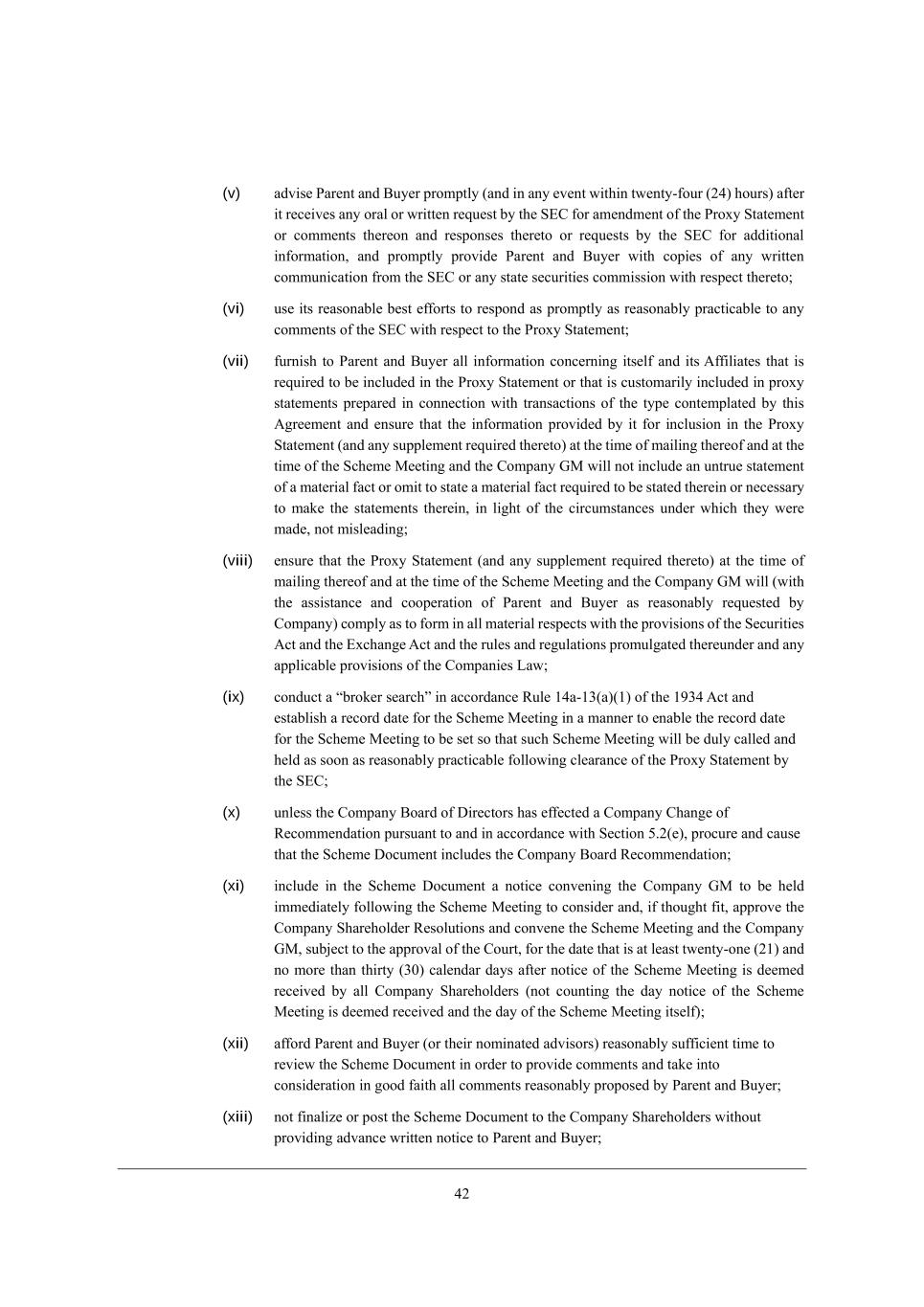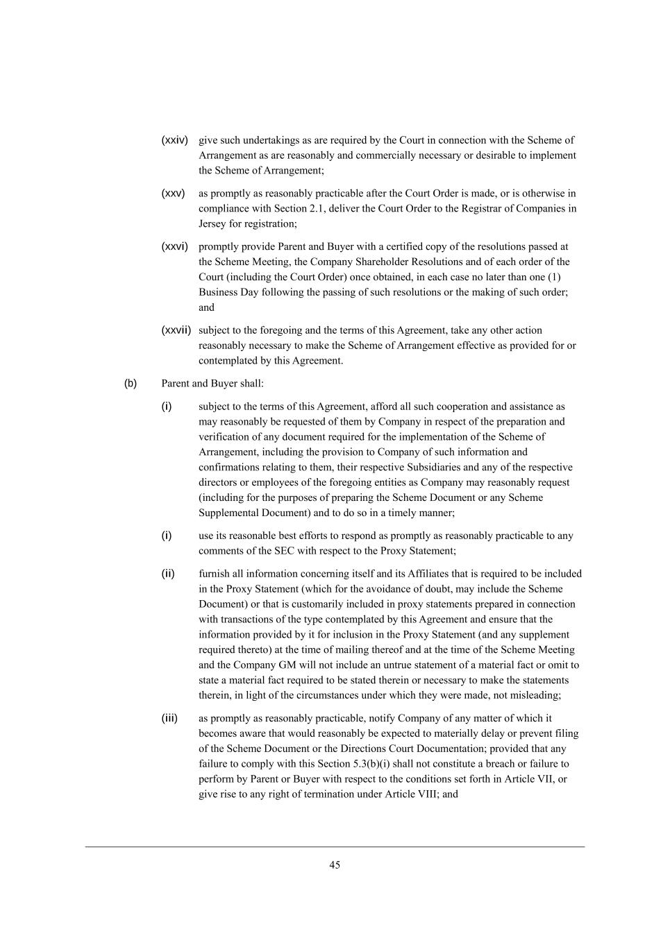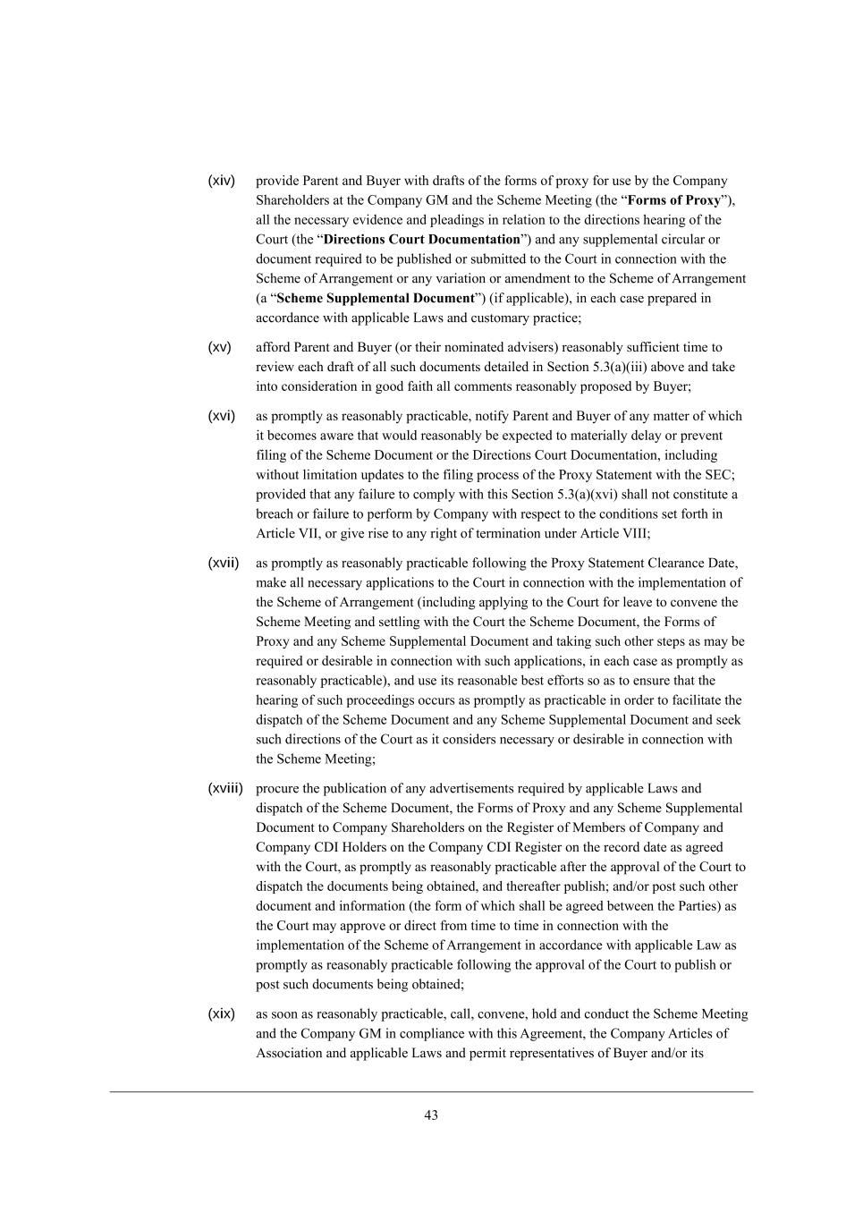 21 (xiv) fhel_Z[ JWh[dj WdZ <ko[h m_j^ ZhW\ji e\ j^[ \ehci e\ fheno \eh ki[ Xo j^[ =ecfWdo M^Wh[^ebZ[hi Wj j^[ =ecfWdo AG WdZ j^[ MY^[c[ G[[j_d] (j^[ rForms of Proxys)* Wbb j^[ d[Y[iiWho [l_Z[dY[ WdZ fb[WZ_d]i _d h[bWj_ed je j^[ Z_h[Yj_edi ^[Wh_d] e\ j^[ =ekhj (j^[ rDirections Court Documentations) WdZ Wdo ikffb[c[djWb Y_hYkbWh eh ZeYkc[dj h[gk_h[Z je X[ fkXb_i^[Z eh ikXc_jj[Z je j^[ =ekhj _d Yedd[Yj_ed m_j^ j^[ MY^[c[ e\ ;hhWd][c[dj eh Wdo lWh_Wj_ed eh Wc[dZc[dj je j^[ MY^[c[ e\ ;hhWd][c[dj (W rScheme Supplemental Documents) (_\ Wffb_YWXb[)* _d [WY^ YWi[ fh[fWh[Z _d WYYehZWdY[ m_j^ Wffb_YWXb[ FWmi WdZ YkijecWho fhWYj_Y[9 (xv) W\\ehZ JWh[dj WdZ <ko[h (eh j^[_h dec_dWj[Z WZl_i[hi) h[WiedWXbo ik\\_Y_[dj j_c[ je h[l_[m [WY^ ZhW\j e\ Wbb ikY^ ZeYkc[dji Z[jW_b[Z _d M[Yj_ed 3,1(W)(___) WXel[ WdZ jWa[ _dje Yedi_Z[hWj_ed _d ]eeZ \W_j^ Wbb Yecc[dji h[WiedWXbo fhefei[Z Xo <ko[h9 (xvi) Wi fhecfjbo Wi h[WiedWXbo fhWYj_YWXb[* dej_\o JWh[dj WdZ <ko[h e\ Wdo cWjj[h e\ m^_Y^ _j X[Yec[i WmWh[ j^Wj mekbZ h[WiedWXbo X[ [nf[Yj[Z je cWj[h_Wbbo Z[bWo eh fh[l[dj \_b_d] e\ j^[ MY^[c[ >eYkc[dj eh j^[ >_h[Yj_edi =ekhj >eYkc[djWj_ed* _dYbkZ_d] m_j^ekj b_c_jWj_ed kfZWj[i je j^[ \_b_d] fheY[ii e\ j^[ Jheno MjWj[c[dj m_j^ j^[ M?=9 fhel_Z[Z j^Wj Wdo \W_bkh[ je Yecfbo m_j^ j^_i M[Yj_ed 3,1(W)(nl_) i^Wbb dej Yedij_jkj[ W Xh[WY^ eh \W_bkh[ je f[h\ehc Xo =ecfWdo m_j^ h[if[Yj je j^[ YedZ_j_edi i[j \ehj^ _d ;hj_Yb[ PCC* eh ]_l[ h_i[ je Wdo h_]^j e\ j[hc_dWj_ed kdZ[h ;hj_Yb[ PCCC9 (xvii) Wi fhecfjbo Wi h[WiedWXbo fhWYj_YWXb[ \ebbem_d] j^[ Jheno MjWj[c[dj =b[WhWdY[ >Wj[* cWa[ Wbb d[Y[iiWho Wffb_YWj_edi je j^[ =ekhj _d Yedd[Yj_ed m_j^ j^[ _cfb[c[djWj_ed e\ j^[ MY^[c[ e\ ;hhWd][c[dj (_dYbkZ_d] Wffbo_d] je j^[ =ekhj \eh b[Wl[ je Yedl[d[ j^[ MY^[c[ G[[j_d] WdZ i[jjb_d] m_j^ j^[ =ekhj j^[ MY^[c[ >eYkc[dj* j^[ @ehci e\ Jheno WdZ Wdo MY^[c[ Mkffb[c[djWb >eYkc[dj WdZ jWa_d] ikY^ ej^[h ij[fi Wi cWo X[ h[gk_h[Z eh Z[i_hWXb[ _d Yedd[Yj_ed m_j^ ikY^ Wffb_YWj_edi* _d [WY^ YWi[ Wi fhecfjbo Wi h[WiedWXbo fhWYj_YWXb[)* WdZ ki[ _ji h[WiedWXb[ X[ij [\\ehji ie Wi je [dikh[ j^Wj j^[ ^[Wh_d] e\ ikY^ fheY[[Z_d]i eYYkhi Wi fhecfjbo Wi fhWYj_YWXb[ _d ehZ[h je \WY_b_jWj[ j^[ Z_ifWjY^ e\ j^[ MY^[c[ >eYkc[dj WdZ Wdo MY^[c[ Mkffb[c[djWb >eYkc[dj WdZ i[[a ikY^ Z_h[Yj_edi e\ j^[ =ekhj Wi _j Yedi_Z[hi d[Y[iiWho eh Z[i_hWXb[ _d Yedd[Yj_ed m_j^ j^[ MY^[c[ G[[j_d]9 (xviii) fheYkh[ j^[ fkXb_YWj_ed e\ Wdo WZl[hj_i[c[dji h[gk_h[Z Xo Wffb_YWXb[ FWmi WdZ Z_ifWjY^ e\ j^[ MY^[c[ >eYkc[dj* j^[ @ehci e\ Jheno WdZ Wdo MY^[c[ Mkffb[c[djWb >eYkc[dj je =ecfWdo M^Wh[^ebZ[hi ed j^[ L[]_ij[h e\ G[cX[hi e\ =ecfWdo WdZ =ecfWdo =>C BebZ[hi ed j^[ =ecfWdo =>C L[]_ij[h ed j^[ h[YehZ ZWj[ Wi W]h[[Z m_j^ j^[ =ekhj* Wi fhecfjbo Wi h[WiedWXbo fhWYj_YWXb[ W\j[h j^[ WffhelWb e\ j^[ =ekhj je Z_ifWjY^ j^[ ZeYkc[dji X[_d] eXjW_d[Z* WdZ j^[h[W\j[h fkXb_i^9 WdZ-eh feij ikY^ ej^[h ZeYkc[dj WdZ _d\ehcWj_ed (j^[ \ehc e\ m^_Y^ i^Wbb X[ W]h[[Z X[jm[[d j^[ JWhj_[i) Wi j^[ =ekhj cWo Wffhel[ eh Z_h[Yj \hec j_c[ je j_c[ _d Yedd[Yj_ed m_j^ j^[ _cfb[c[djWj_ed e\ j^[ MY^[c[ e\ ;hhWd][c[dj _d WYYehZWdY[ m_j^ Wffb_YWXb[ FWm Wi fhecfjbo Wi h[WiedWXbo fhWYj_YWXb[ \ebbem_d] j^[ WffhelWb e\ j^[ =ekhj je fkXb_i^ eh feij ikY^ ZeYkc[dji X[_d] eXjW_d[Z9 (xix) Wi ieed Wi h[WiedWXbo fhWYj_YWXb[* YWbb* Yedl[d[* ^ebZ WdZ YedZkYj j^[ MY^[c[ G[[j_d] WdZ j^[ =ecfWdo AG _d Yecfb_WdY[ m_j^ j^_i ;]h[[c[dj* j^[ =ecfWdo ;hj_Yb[i e\ ;iieY_Wj_ed WdZ Wffb_YWXb[ FWmi WdZ f[hc_j h[fh[i[djWj_l[i e\ <ko[h WdZ-eh _ji