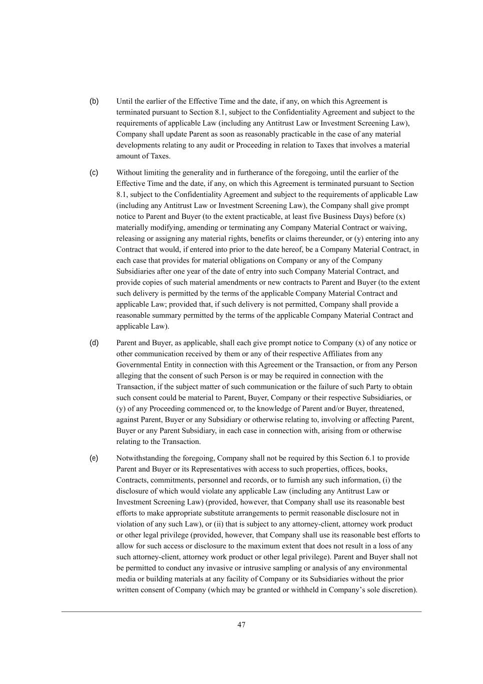 25 (b) Odj_b j^[ [Whb_[h e\ j^[ ?\\[Yj_l[ N_c[ WdZ j^[ ZWj[* _\ Wdo* ed m^_Y^ j^_i ;]h[[c[dj _i j[hc_dWj[Z fkhikWdj je M[Yj_ed 6,/* ikX`[Yj je j^[ =ed\_Z[dj_Wb_jo ;]h[[c[dj WdZ ikX`[Yj je j^[ h[gk_h[c[dji e\ Wffb_YWXb[ FWm (_dYbkZ_d] Wdo ;dj_jhkij FWm eh Cdl[ijc[dj MYh[[d_d] FWm)* =ecfWdo i^Wbb kfZWj[ JWh[dj Wi ieed Wi h[WiedWXbo fhWYj_YWXb[ _d j^[ YWi[ e\ Wdo cWj[h_Wb Z[l[befc[dji h[bWj_d] je Wdo WkZ_j eh JheY[[Z_d] _d h[bWj_ed je NWn[i j^Wj _dlebl[i W cWj[h_Wb Wcekdj e\ NWn[i, (c) Q_j^ekj b_c_j_d] j^[ ][d[hWb_jo WdZ _d \khj^[hWdY[ e\ j^[ \eh[]e_d]* kdj_b j^[ [Whb_[h e\ j^[ ?\\[Yj_l[ N_c[ WdZ j^[ ZWj[* _\ Wdo* ed m^_Y^ j^_i ;]h[[c[dj _i j[hc_dWj[Z fkhikWdj je M[Yj_ed 6,/* ikX`[Yj je j^[ =ed\_Z[dj_Wb_jo ;]h[[c[dj WdZ ikX`[Yj je j^[ h[gk_h[c[dji e\ Wffb_YWXb[ FWm (_dYbkZ_d] Wdo ;dj_jhkij FWm eh Cdl[ijc[dj MYh[[d_d] FWm)* j^[ =ecfWdo i^Wbb ]_l[ fhecfj dej_Y[ je JWh[dj WdZ <ko[h (je j^[ [nj[dj fhWYj_YWXb[* Wj b[Wij \_l[ <ki_d[ii >Woi) X[\eh[ (n) cWj[h_Wbbo ceZ_\o_d]* Wc[dZ_d] eh j[hc_dWj_d] Wdo =ecfWdo GWj[h_Wb =edjhWYj eh mW_l_d]* h[b[Wi_d] eh Wii_]d_d] Wdo cWj[h_Wb h_]^ji* X[d[\_ji eh YbW_ci j^[h[kdZ[h* eh (o) [dj[h_d] _dje Wdo =edjhWYj j^Wj mekbZ* _\ [dj[h[Z _dje fh_eh je j^[ ZWj[ ^[h[e\* X[ W =ecfWdo GWj[h_Wb =edjhWYj* _d [WY^ YWi[ j^Wj fhel_Z[i \eh cWj[h_Wb eXb_]Wj_edi ed =ecfWdo eh Wdo e\ j^[ =ecfWdo MkXi_Z_Wh_[i W\j[h ed[ o[Wh e\ j^[ ZWj[ e\ [djho _dje ikY^ =ecfWdo GWj[h_Wb =edjhWYj* WdZ fhel_Z[ Yef_[i e\ ikY^ cWj[h_Wb Wc[dZc[dji eh d[m YedjhWYji je JWh[dj WdZ <ko[h (je j^[ [nj[dj ikY^ Z[b_l[ho _i f[hc_jj[Z Xo j^[ j[hci e\ j^[ Wffb_YWXb[ =ecfWdo GWj[h_Wb =edjhWYj WdZ Wffb_YWXb[ FWm9 fhel_Z[Z j^Wj* _\ ikY^ Z[b_l[ho _i dej f[hc_jj[Z* =ecfWdo i^Wbb fhel_Z[ W h[WiedWXb[ ikccWho f[hc_jj[Z Xo j^[ j[hci e\ j^[ Wffb_YWXb[ =ecfWdo GWj[h_Wb =edjhWYj WdZ Wffb_YWXb[ FWm), (d) JWh[dj WdZ <ko[h* Wi Wffb_YWXb[* i^Wbb [WY^ ]_l[ fhecfj dej_Y[ je =ecfWdo (n) e\ Wdo dej_Y[ eh ej^[h Yecckd_YWj_ed h[Y[_l[Z Xo j^[c eh Wdo e\ j^[_h h[if[Yj_l[ ;\\_b_Wj[i \hec Wdo Ael[hdc[djWb ?dj_jo _d Yedd[Yj_ed m_j^ j^_i ;]h[[c[dj eh j^[ NhWdiWYj_ed* eh \hec Wdo J[hied Wbb[]_d] j^Wj j^[ Yedi[dj e\ ikY^ J[hied _i eh cWo X[ h[gk_h[Z _d Yedd[Yj_ed m_j^ j^[ NhWdiWYj_ed* _\ j^[ ikX`[Yj cWjj[h e\ ikY^ Yecckd_YWj_ed eh j^[ \W_bkh[ e\ ikY^ JWhjo je eXjW_d ikY^ Yedi[dj YekbZ X[ cWj[h_Wb je JWh[dj* <ko[h* =ecfWdo eh j^[_h h[if[Yj_l[ MkXi_Z_Wh_[i* eh (o) e\ Wdo JheY[[Z_d] Yecc[dY[Z eh* je j^[ ademb[Z][ e\ JWh[dj WdZ-eh <ko[h* j^h[Wj[d[Z* W]W_dij JWh[dj* <ko[h eh Wdo MkXi_Z_Who eh ej^[hm_i[ h[bWj_d] je* _dlebl_d] eh W\\[Yj_d] JWh[dj* <ko[h eh Wdo JWh[dj MkXi_Z_Who* _d [WY^ YWi[ _d Yedd[Yj_ed m_j^* Wh_i_d] \hec eh ej^[hm_i[ h[bWj_d] je j^[ NhWdiWYj_ed, (e) Hejm_j^ijWdZ_d] j^[ \eh[]e_d]* =ecfWdo i^Wbb dej X[ h[gk_h[Z Xo j^_i M[Yj_ed 4,/ je fhel_Z[ JWh[dj WdZ <ko[h eh _ji L[fh[i[djWj_l[i m_j^ WYY[ii je ikY^ fhef[hj_[i* e\\_Y[i* Xeeai* =edjhWYji* Yecc_jc[dji* f[hiedd[b WdZ h[YehZi* eh je \khd_i^ Wdo ikY^ _d\ehcWj_ed* (_) j^[ Z_iYbeikh[ e\ m^_Y^ mekbZ l_ebWj[ Wdo Wffb_YWXb[ FWm (_dYbkZ_d] Wdo ;dj_jhkij FWm eh Cdl[ijc[dj MYh[[d_d] FWm) (fhel_Z[Z* ^em[l[h* j^Wj =ecfWdo i^Wbb ki[ _ji h[WiedWXb[ X[ij [\\ehji je cWa[ Wffhefh_Wj[ ikXij_jkj[ WhhWd][c[dji je f[hc_j h[WiedWXb[ Z_iYbeikh[ dej _d l_ebWj_ed e\ Wdo ikY^ FWm)* eh (__) j^Wj _i ikX`[Yj je Wdo Wjjehd[o+Yb_[dj* Wjjehd[o meha fheZkYj eh ej^[h b[]Wb fh_l_b[][ (fhel_Z[Z* ^em[l[h* j^Wj =ecfWdo i^Wbb ki[ _ji h[WiedWXb[ X[ij [\\ehji je Wbbem \eh ikY^ WYY[ii eh Z_iYbeikh[ je j^[ cWn_ckc [nj[dj j^Wj Ze[i dej h[ikbj _d W beii e\ Wdo ikY^ Wjjehd[o+Yb_[dj* Wjjehd[o meha fheZkYj eh ej^[h b[]Wb fh_l_b[][), JWh[dj WdZ <ko[h i^Wbb dej X[ f[hc_jj[Z je YedZkYj Wdo _dlWi_l[ eh _djhki_l[ iWcfb_d] eh WdWboi_i e\ Wdo [dl_hedc[djWb c[Z_W eh Xk_bZ_d] cWj[h_Wbi Wj Wdo \WY_b_jo e\ =ecfWdo eh _ji MkXi_Z_Wh_[i m_j^ekj j^[ fh_eh mh_jj[d Yedi[dj e\ =ecfWdo (m^_Y^ cWo X[ ]hWdj[Z eh m_j^^[bZ _d =ecfWdoui ieb[ Z_iYh[j_ed),