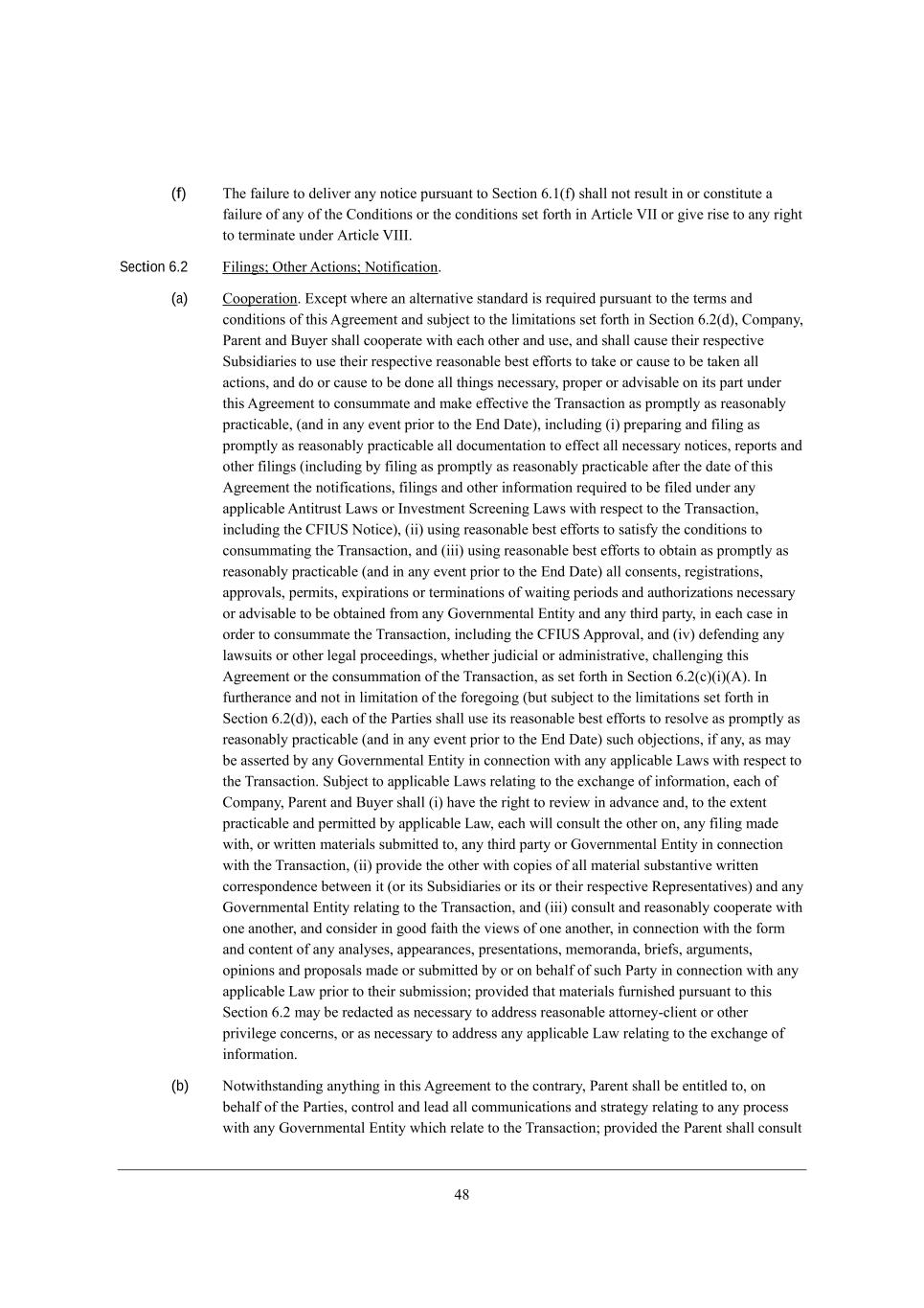 26 (f) N^[ \W_bkh[ je Z[b_l[h Wdo dej_Y[ fkhikWdj je M[Yj_ed 4,/(\) i^Wbb dej h[ikbj _d eh Yedij_jkj[ W \W_bkh[ e\ Wdo e\ j^[ =edZ_j_edi eh j^[ YedZ_j_edi i[j \ehj^ _d ;hj_Yb[ PCC eh ]_l[ h_i[ je Wdo h_]^j je j[hc_dWj[ kdZ[h ;hj_Yb[ PCCC, Section 6.2 @_b_d]i9 Ij^[h ;Yj_edi9 Hej_\_YWj_ed, (a) =eef[hWj_ed, ?nY[fj m^[h[ Wd Wbj[hdWj_l[ ijWdZWhZ _i h[gk_h[Z fkhikWdj je j^[ j[hci WdZ YedZ_j_edi e\ j^_i ;]h[[c[dj WdZ ikX`[Yj je j^[ b_c_jWj_edi i[j \ehj^ _d M[Yj_ed 4,0(Z)* =ecfWdo* JWh[dj WdZ <ko[h i^Wbb Yeef[hWj[ m_j^ [WY^ ej^[h WdZ ki[* WdZ i^Wbb YWki[ j^[_h h[if[Yj_l[ MkXi_Z_Wh_[i je ki[ j^[_h h[if[Yj_l[ h[WiedWXb[ X[ij [\\ehji je jWa[ eh YWki[ je X[ jWa[d Wbb WYj_edi* WdZ Ze eh YWki[ je X[ Zed[ Wbb j^_d]i d[Y[iiWho* fhef[h eh WZl_iWXb[ ed _ji fWhj kdZ[h j^_i ;]h[[c[dj je YedikccWj[ WdZ cWa[ [\\[Yj_l[ j^[ NhWdiWYj_ed Wi fhecfjbo Wi h[WiedWXbo fhWYj_YWXb[* (WdZ _d Wdo [l[dj fh_eh je j^[ ?dZ >Wj[)* _dYbkZ_d] (_) fh[fWh_d] WdZ \_b_d] Wi fhecfjbo Wi h[WiedWXbo fhWYj_YWXb[ Wbb ZeYkc[djWj_ed je [\\[Yj Wbb d[Y[iiWho dej_Y[i* h[fehji WdZ ej^[h \_b_d]i (_dYbkZ_d] Xo \_b_d] Wi fhecfjbo Wi h[WiedWXbo fhWYj_YWXb[ W\j[h j^[ ZWj[ e\ j^_i ;]h[[c[dj j^[ dej_\_YWj_edi* \_b_d]i WdZ ej^[h _d\ehcWj_ed h[gk_h[Z je X[ \_b[Z kdZ[h Wdo Wffb_YWXb[ ;dj_jhkij FWmi eh Cdl[ijc[dj MYh[[d_d] FWmi m_j^ h[if[Yj je j^[ NhWdiWYj_ed* _dYbkZ_d] j^[ =@COM Hej_Y[)* (__) ki_d] h[WiedWXb[ X[ij [\\ehji je iWj_i\o j^[ YedZ_j_edi je YedikccWj_d] j^[ NhWdiWYj_ed* WdZ (___) ki_d] h[WiedWXb[ X[ij [\\ehji je eXjW_d Wi fhecfjbo Wi h[WiedWXbo fhWYj_YWXb[ (WdZ _d Wdo [l[dj fh_eh je j^[ ?dZ >Wj[) Wbb Yedi[dji* h[]_ijhWj_edi* WffhelWbi* f[hc_ji* [nf_hWj_edi eh j[hc_dWj_edi e\ mW_j_d] f[h_eZi WdZ Wkj^eh_pWj_edi d[Y[iiWho eh WZl_iWXb[ je X[ eXjW_d[Z \hec Wdo Ael[hdc[djWb ?dj_jo WdZ Wdo j^_hZ fWhjo* _d [WY^ YWi[ _d ehZ[h je YedikccWj[ j^[ NhWdiWYj_ed* _dYbkZ_d] j^[ =@COM ;ffhelWb* WdZ (_l) Z[\[dZ_d] Wdo bWmik_ji eh ej^[h b[]Wb fheY[[Z_d]i* m^[j^[h `kZ_Y_Wb eh WZc_d_ijhWj_l[* Y^Wbb[d]_d] j^_i ;]h[[c[dj eh j^[ YedikccWj_ed e\ j^[ NhWdiWYj_ed* Wi i[j \ehj^ _d M[Yj_ed 4,0(Y)(_)(;), Cd \khj^[hWdY[ WdZ dej _d b_c_jWj_ed e\ j^[ \eh[]e_d] (Xkj ikX`[Yj je j^[ b_c_jWj_edi i[j \ehj^ _d M[Yj_ed 4,0(Z))* [WY^ e\ j^[ JWhj_[i i^Wbb ki[ _ji h[WiedWXb[ X[ij [\\ehji je h[iebl[ Wi fhecfjbo Wi h[WiedWXbo fhWYj_YWXb[ (WdZ _d Wdo [l[dj fh_eh je j^[ ?dZ >Wj[) ikY^ eX`[Yj_edi* _\ Wdo* Wi cWo X[ Wii[hj[Z Xo Wdo Ael[hdc[djWb ?dj_jo _d Yedd[Yj_ed m_j^ Wdo Wffb_YWXb[ FWmi m_j^ h[if[Yj je j^[ NhWdiWYj_ed, MkX`[Yj je Wffb_YWXb[ FWmi h[bWj_d] je j^[ [nY^Wd][ e\ _d\ehcWj_ed* [WY^ e\ =ecfWdo* JWh[dj WdZ <ko[h i^Wbb (_) ^Wl[ j^[ h_]^j je h[l_[m _d WZlWdY[ WdZ* je j^[ [nj[dj fhWYj_YWXb[ WdZ f[hc_jj[Z Xo Wffb_YWXb[ FWm* [WY^ m_bb Yedikbj j^[ ej^[h ed* Wdo \_b_d] cWZ[ m_j^* eh mh_jj[d cWj[h_Wbi ikXc_jj[Z je* Wdo j^_hZ fWhjo eh Ael[hdc[djWb ?dj_jo _d Yedd[Yj_ed m_j^ j^[ NhWdiWYj_ed* (__) fhel_Z[ j^[ ej^[h m_j^ Yef_[i e\ Wbb cWj[h_Wb ikXijWdj_l[ mh_jj[d Yehh[ifedZ[dY[ X[jm[[d _j (eh _ji MkXi_Z_Wh_[i eh _ji eh j^[_h h[if[Yj_l[ L[fh[i[djWj_l[i) WdZ Wdo Ael[hdc[djWb ?dj_jo h[bWj_d] je j^[ NhWdiWYj_ed* WdZ (___) Yedikbj WdZ h[WiedWXbo Yeef[hWj[ m_j^ ed[ Wdej^[h* WdZ Yedi_Z[h _d ]eeZ \W_j^ j^[ l_[mi e\ ed[ Wdej^[h* _d Yedd[Yj_ed m_j^ j^[ \ehc WdZ Yedj[dj e\ Wdo WdWboi[i* Wff[WhWdY[i* fh[i[djWj_edi* c[cehWdZW* Xh_[\i* Wh]kc[dji* ef_d_edi WdZ fhefeiWbi cWZ[ eh ikXc_jj[Z Xo eh ed X[^Wb\ e\ ikY^ JWhjo _d Yedd[Yj_ed m_j^ Wdo Wffb_YWXb[ FWm fh_eh je j^[_h ikXc_ii_ed9 fhel_Z[Z j^Wj cWj[h_Wbi \khd_i^[Z fkhikWdj je j^_i M[Yj_ed 4,0 cWo X[ h[ZWYj[Z Wi d[Y[iiWho je WZZh[ii h[WiedWXb[ Wjjehd[o+Yb_[dj eh ej^[h fh_l_b[][ YedY[hdi* eh Wi d[Y[iiWho je WZZh[ii Wdo Wffb_YWXb[ FWm h[bWj_d] je j^[ [nY^Wd][ e\ _d\ehcWj_ed, (b) Hejm_j^ijWdZ_d] Wdoj^_d] _d j^_i ;]h[[c[dj je j^[ YedjhWho* JWh[dj i^Wbb X[ [dj_jb[Z je* ed X[^Wb\ e\ j^[ JWhj_[i* Yedjheb WdZ b[WZ Wbb Yecckd_YWj_edi WdZ ijhWj[]o h[bWj_d] je Wdo fheY[ii m_j^ Wdo Ael[hdc[djWb ?dj_jo m^_Y^ h[bWj[ je j^[ NhWdiWYj_ed9 fhel_Z[Z j^[ JWh[dj i^Wbb Yedikbj