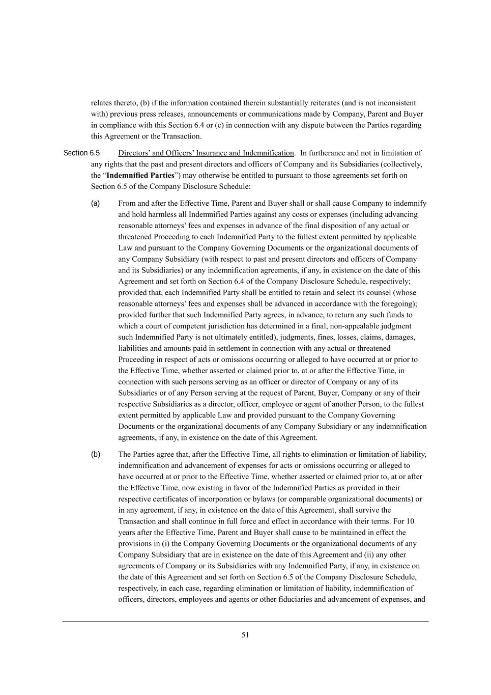 3/ h[bWj[i j^[h[je* (X) _\ j^[ _d\ehcWj_ed YedjW_d[Z j^[h[_d ikXijWdj_Wbbo h[_j[hWj[i (WdZ _i dej _dYedi_ij[dj m_j^) fh[l_eki fh[ii h[b[Wi[i* WddekdY[c[dji eh Yecckd_YWj_edi cWZ[ Xo =ecfWdo* JWh[dj WdZ <ko[h _d Yecfb_WdY[ m_j^ j^_i M[Yj_ed 4,2 eh (Y) _d Yedd[Yj_ed m_j^ Wdo Z_ifkj[ X[jm[[d j^[ JWhj_[i h[]WhZ_d] j^_i ;]h[[c[dj eh j^[ NhWdiWYj_ed, Section 6.5 >_h[Yjehiu WdZ I\\_Y[hiu CdikhWdY[ WdZ CdZ[cd_\_YWj_ed, Cd \khj^[hWdY[ WdZ dej _d b_c_jWj_ed e\ Wdo h_]^ji j^Wj j^[ fWij WdZ fh[i[dj Z_h[Yjehi WdZ e\\_Y[hi e\ =ecfWdo WdZ _ji MkXi_Z_Wh_[i (Yebb[Yj_l[bo* j^[ rIndemnified Partiess) cWo ej^[hm_i[ X[ [dj_jb[Z je fkhikWdj je j^ei[ W]h[[c[dji i[j \ehj^ ed M[Yj_ed 4,3 e\ j^[ =ecfWdo >_iYbeikh[ MY^[Zkb[8 (a) @hec WdZ W\j[h j^[ ?\\[Yj_l[ N_c[* JWh[dj WdZ <ko[h i^Wbb eh i^Wbb YWki[ =ecfWdo je _dZ[cd_\o WdZ ^ebZ ^Whcb[ii Wbb CdZ[cd_\_[Z JWhj_[i W]W_dij Wdo Yeiji eh [nf[di[i (_dYbkZ_d] WZlWdY_d] h[WiedWXb[ Wjjehd[oiu \[[i WdZ [nf[di[i _d WZlWdY[ e\ j^[ \_dWb Z_ifei_j_ed e\ Wdo WYjkWb eh j^h[Wj[d[Z JheY[[Z_d] je [WY^ CdZ[cd_\_[Z JWhjo je j^[ \kbb[ij [nj[dj f[hc_jj[Z Xo Wffb_YWXb[ FWm WdZ fkhikWdj je j^[ =ecfWdo Ael[hd_d] >eYkc[dji eh j^[ eh]Wd_pWj_edWb ZeYkc[dji e\ Wdo =ecfWdo MkXi_Z_Who (m_j^ h[if[Yj je fWij WdZ fh[i[dj Z_h[Yjehi WdZ e\\_Y[hi e\ =ecfWdo WdZ _ji MkXi_Z_Wh_[i) eh Wdo _dZ[cd_\_YWj_ed W]h[[c[dji* _\ Wdo* _d [n_ij[dY[ ed j^[ ZWj[ e\ j^_i ;]h[[c[dj WdZ i[j \ehj^ ed M[Yj_ed 4,2 e\ j^[ =ecfWdo >_iYbeikh[ MY^[Zkb[* h[if[Yj_l[bo9 fhel_Z[Z j^Wj* [WY^ CdZ[cd_\_[Z JWhjo i^Wbb X[ [dj_jb[Z je h[jW_d WdZ i[b[Yj _ji Yekdi[b (m^ei[ h[WiedWXb[ Wjjehd[oiu \[[i WdZ [nf[di[i i^Wbb X[ WZlWdY[Z _d WYYehZWdY[ m_j^ j^[ \eh[]e_d])9 fhel_Z[Z \khj^[h j^Wj ikY^ CdZ[cd_\_[Z JWhjo W]h[[i* _d WZlWdY[* je h[jkhd Wdo ikY^ \kdZi je m^_Y^ W Yekhj e\ Yecf[j[dj `kh_iZ_Yj_ed ^Wi Z[j[hc_d[Z _d W \_dWb* ded+Wff[WbWXb[ `kZ]c[dj ikY^ CdZ[cd_\_[Z JWhjo _i dej kbj_cWj[bo [dj_jb[Z)* `kZ]c[dji* \_d[i* beii[i* YbW_ci* ZWcW][i* b_WX_b_j_[i WdZ Wcekdji fW_Z _d i[jjb[c[dj _d Yedd[Yj_ed m_j^ Wdo WYjkWb eh j^h[Wj[d[Z JheY[[Z_d] _d h[if[Yj e\ WYji eh ec_ii_edi eYYkhh_d] eh Wbb[][Z je ^Wl[ eYYkhh[Z Wj eh fh_eh je j^[ ?\\[Yj_l[ N_c[* m^[j^[h Wii[hj[Z eh YbW_c[Z fh_eh je* Wj eh W\j[h j^[ ?\\[Yj_l[ N_c[* _d Yedd[Yj_ed m_j^ ikY^ f[hiedi i[hl_d] Wi Wd e\\_Y[h eh Z_h[Yjeh e\ =ecfWdo eh Wdo e\ _ji MkXi_Z_Wh_[i eh e\ Wdo J[hied i[hl_d] Wj j^[ h[gk[ij e\ JWh[dj* <ko[h* =ecfWdo eh Wdo e\ j^[_h h[if[Yj_l[ MkXi_Z_Wh_[i Wi W Z_h[Yjeh* e\\_Y[h* [cfbeo[[ eh W][dj e\ Wdej^[h J[hied* je j^[ \kbb[ij [nj[dj f[hc_jj[Z Xo Wffb_YWXb[ FWm WdZ fhel_Z[Z fkhikWdj je j^[ =ecfWdo Ael[hd_d] >eYkc[dji eh j^[ eh]Wd_pWj_edWb ZeYkc[dji e\ Wdo =ecfWdo MkXi_Z_Who eh Wdo _dZ[cd_\_YWj_ed W]h[[c[dji* _\ Wdo* _d [n_ij[dY[ ed j^[ ZWj[ e\ j^_i ;]h[[c[dj, (b) N^[ JWhj_[i W]h[[ j^Wj* W\j[h j^[ ?\\[Yj_l[ N_c[* Wbb h_]^ji je [b_c_dWj_ed eh b_c_jWj_ed e\ b_WX_b_jo* _dZ[cd_\_YWj_ed WdZ WZlWdY[c[dj e\ [nf[di[i \eh WYji eh ec_ii_edi eYYkhh_d] eh Wbb[][Z je ^Wl[ eYYkhh[Z Wj eh fh_eh je j^[ ?\\[Yj_l[ N_c[* m^[j^[h Wii[hj[Z eh YbW_c[Z fh_eh je* Wj eh W\j[h j^[ ?\\[Yj_l[ N_c[* dem [n_ij_d] _d \Wleh e\ j^[ CdZ[cd_\_[Z JWhj_[i Wi fhel_Z[Z _d j^[_h h[if[Yj_l[ Y[hj_\_YWj[i e\ _dYehfehWj_ed eh XobWmi (eh YecfWhWXb[ eh]Wd_pWj_edWb ZeYkc[dji) eh _d Wdo W]h[[c[dj* _\ Wdo* _d [n_ij[dY[ ed j^[ ZWj[ e\ j^_i ;]h[[c[dj* i^Wbb ikhl_l[ j^[ NhWdiWYj_ed WdZ i^Wbb Yedj_dk[ _d \kbb \ehY[ WdZ [\\[Yj _d WYYehZWdY[ m_j^ j^[_h j[hci, @eh /. o[Whi W\j[h j^[ ?\\[Yj_l[ N_c[* JWh[dj WdZ <ko[h i^Wbb YWki[ je X[ cW_djW_d[Z _d [\\[Yj j^[ fhel_i_edi _d (_) j^[ =ecfWdo Ael[hd_d] >eYkc[dji eh j^[ eh]Wd_pWj_edWb ZeYkc[dji e\ Wdo =ecfWdo MkXi_Z_Who j^Wj Wh[ _d [n_ij[dY[ ed j^[ ZWj[ e\ j^_i ;]h[[c[dj WdZ (__) Wdo ej^[h W]h[[c[dji e\ =ecfWdo eh _ji MkXi_Z_Wh_[i m_j^ Wdo CdZ[cd_\_[Z JWhjo* _\ Wdo* _d [n_ij[dY[ ed j^[ ZWj[ e\ j^_i ;]h[[c[dj WdZ i[j \ehj^ ed M[Yj_ed 4,3 e\ j^[ =ecfWdo >_iYbeikh[ MY^[Zkb[* h[if[Yj_l[bo* _d [WY^ YWi[* h[]WhZ_d] [b_c_dWj_ed eh b_c_jWj_ed e\ b_WX_b_jo* _dZ[cd_\_YWj_ed e\ e\\_Y[hi* Z_h[Yjehi* [cfbeo[[i WdZ W][dji eh ej^[h \_ZkY_Wh_[i WdZ WZlWdY[c[dj e\ [nf[di[i* WdZ