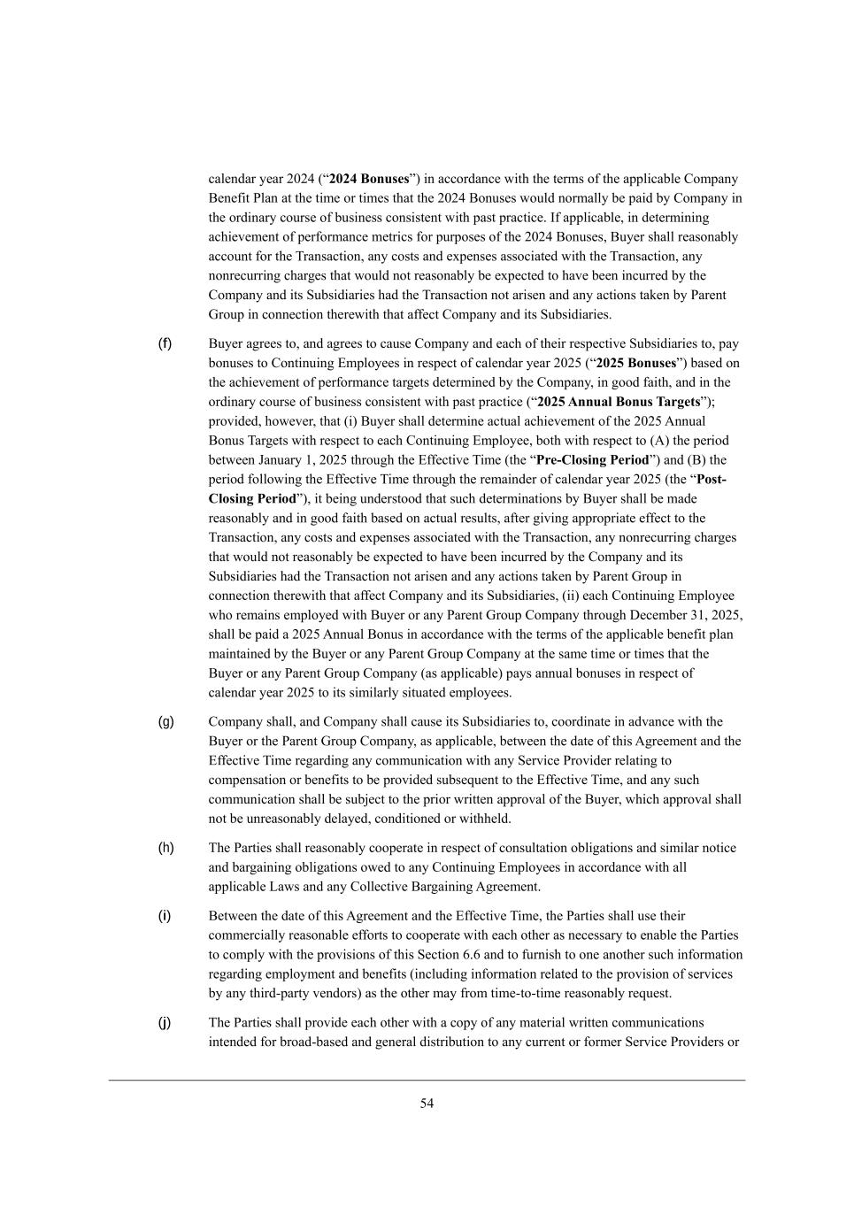 32 YWb[dZWh o[Wh 0.02 (r2024 Bonusess) _d WYYehZWdY[ m_j^ j^[ j[hci e\ j^[ Wffb_YWXb[ =ecfWdo <[d[\_j JbWd Wj j^[ j_c[ eh j_c[i j^Wj j^[ 0.02 <edki[i mekbZ dehcWbbo X[ fW_Z Xo =ecfWdo _d j^[ ehZ_dWho Yekhi[ e\ Xki_d[ii Yedi_ij[dj m_j^ fWij fhWYj_Y[, C\ Wffb_YWXb[* _d Z[j[hc_d_d] WY^_[l[c[dj e\ f[h\ehcWdY[ c[jh_Yi \eh fkhfei[i e\ j^[ 0.02 <edki[i* <ko[h i^Wbb h[WiedWXbo WYYekdj \eh j^[ NhWdiWYj_ed* Wdo Yeiji WdZ [nf[di[i WiieY_Wj[Z m_j^ j^[ NhWdiWYj_ed* Wdo dedh[Ykhh_d] Y^Wh][i j^Wj mekbZ dej h[WiedWXbo X[ [nf[Yj[Z je ^Wl[ X[[d _dYkhh[Z Xo j^[ =ecfWdo WdZ _ji MkXi_Z_Wh_[i ^WZ j^[ NhWdiWYj_ed dej Wh_i[d WdZ Wdo WYj_edi jWa[d Xo JWh[dj Ahekf _d Yedd[Yj_ed j^[h[m_j^ j^Wj W\\[Yj =ecfWdo WdZ _ji MkXi_Z_Wh_[i, (f) <ko[h W]h[[i je* WdZ W]h[[i je YWki[ =ecfWdo WdZ [WY^ e\ j^[_h h[if[Yj_l[ MkXi_Z_Wh_[i je* fWo Xedki[i je =edj_dk_d] ?cfbeo[[i _d h[if[Yj e\ YWb[dZWh o[Wh 0.03 (r2025 Bonusess) XWi[Z ed j^[ WY^_[l[c[dj e\ f[h\ehcWdY[ jWh][ji Z[j[hc_d[Z Xo j^[ =ecfWdo* _d ]eeZ \W_j^* WdZ _d j^[ ehZ_dWho Yekhi[ e\ Xki_d[ii Yedi_ij[dj m_j^ fWij fhWYj_Y[ (r2025 Annual Bonus Targetss)9 fhel_Z[Z* ^em[l[h* j^Wj (_) <ko[h i^Wbb Z[j[hc_d[ WYjkWb WY^_[l[c[dj e\ j^[ 0.03 ;ddkWb <edki NWh][ji m_j^ h[if[Yj je [WY^ =edj_dk_d] ?cfbeo[[* Xej^ m_j^ h[if[Yj je (;) j^[ f[h_eZ X[jm[[d DWdkWho /* 0.03 j^hek]^ j^[ ?\\[Yj_l[ N_c[ (j^[ rPre-Closing Periods) WdZ (<) j^[ f[h_eZ \ebbem_d] j^[ ?\\[Yj_l[ N_c[ j^hek]^ j^[ h[cW_dZ[h e\ YWb[dZWh o[Wh 0.03 (j^[ rPost- Closing Periods)* _j X[_d] kdZ[hijeeZ j^Wj ikY^ Z[j[hc_dWj_edi Xo <ko[h i^Wbb X[ cWZ[ h[WiedWXbo WdZ _d ]eeZ \W_j^ XWi[Z ed WYjkWb h[ikbji* W\j[h ]_l_d] Wffhefh_Wj[ [\\[Yj je j^[ NhWdiWYj_ed* Wdo Yeiji WdZ [nf[di[i WiieY_Wj[Z m_j^ j^[ NhWdiWYj_ed* Wdo dedh[Ykhh_d] Y^Wh][i j^Wj mekbZ dej h[WiedWXbo X[ [nf[Yj[Z je ^Wl[ X[[d _dYkhh[Z Xo j^[ =ecfWdo WdZ _ji MkXi_Z_Wh_[i ^WZ j^[ NhWdiWYj_ed dej Wh_i[d WdZ Wdo WYj_edi jWa[d Xo JWh[dj Ahekf _d Yedd[Yj_ed j^[h[m_j^ j^Wj W\\[Yj =ecfWdo WdZ _ji MkXi_Z_Wh_[i* (__) [WY^ =edj_dk_d] ?cfbeo[[ m^e h[cW_di [cfbeo[Z m_j^ <ko[h eh Wdo JWh[dj Ahekf =ecfWdo j^hek]^ >[Y[cX[h 1/* 0.03* i^Wbb X[ fW_Z W 0.03 ;ddkWb <edki _d WYYehZWdY[ m_j^ j^[ j[hci e\ j^[ Wffb_YWXb[ X[d[\_j fbWd cW_djW_d[Z Xo j^[ <ko[h eh Wdo JWh[dj Ahekf =ecfWdo Wj j^[ iWc[ j_c[ eh j_c[i j^Wj j^[ <ko[h eh Wdo JWh[dj Ahekf =ecfWdo (Wi Wffb_YWXb[) fWoi WddkWb Xedki[i _d h[if[Yj e\ YWb[dZWh o[Wh 0.03 je _ji i_c_bWhbo i_jkWj[Z [cfbeo[[i, (g) =ecfWdo i^Wbb* WdZ =ecfWdo i^Wbb YWki[ _ji MkXi_Z_Wh_[i je* YeehZ_dWj[ _d WZlWdY[ m_j^ j^[ <ko[h eh j^[ JWh[dj Ahekf =ecfWdo* Wi Wffb_YWXb[* X[jm[[d j^[ ZWj[ e\ j^_i ;]h[[c[dj WdZ j^[ ?\\[Yj_l[ N_c[ h[]WhZ_d] Wdo Yecckd_YWj_ed m_j^ Wdo M[hl_Y[ Jhel_Z[h h[bWj_d] je Yecf[diWj_ed eh X[d[\_ji je X[ fhel_Z[Z ikXi[gk[dj je j^[ ?\\[Yj_l[ N_c[* WdZ Wdo ikY^ Yecckd_YWj_ed i^Wbb X[ ikX`[Yj je j^[ fh_eh mh_jj[d WffhelWb e\ j^[ <ko[h* m^_Y^ WffhelWb i^Wbb dej X[ kdh[WiedWXbo Z[bWo[Z* YedZ_j_ed[Z eh m_j^^[bZ, (h) N^[ JWhj_[i i^Wbb h[WiedWXbo Yeef[hWj[ _d h[if[Yj e\ YedikbjWj_ed eXb_]Wj_edi WdZ i_c_bWh dej_Y[ WdZ XWh]W_d_d] eXb_]Wj_edi em[Z je Wdo =edj_dk_d] ?cfbeo[[i _d WYYehZWdY[ m_j^ Wbb Wffb_YWXb[ FWmi WdZ Wdo =ebb[Yj_l[ <Wh]W_d_d] ;]h[[c[dj, (i) <[jm[[d j^[ ZWj[ e\ j^_i ;]h[[c[dj WdZ j^[ ?\\[Yj_l[ N_c[* j^[ JWhj_[i i^Wbb ki[ j^[_h Yecc[hY_Wbbo h[WiedWXb[ [\\ehji je Yeef[hWj[ m_j^ [WY^ ej^[h Wi d[Y[iiWho je [dWXb[ j^[ JWhj_[i je Yecfbo m_j^ j^[ fhel_i_edi e\ j^_i M[Yj_ed 4,4 WdZ je \khd_i^ je ed[ Wdej^[h ikY^ _d\ehcWj_ed h[]WhZ_d] [cfbeoc[dj WdZ X[d[\_ji (_dYbkZ_d] _d\ehcWj_ed h[bWj[Z je j^[ fhel_i_ed e\ i[hl_Y[i Xo Wdo j^_hZ+fWhjo l[dZehi) Wi j^[ ej^[h cWo \hec j_c[+je+j_c[ h[WiedWXbo h[gk[ij, (j) N^[ JWhj_[i i^Wbb fhel_Z[ [WY^ ej^[h m_j^ W Yefo e\ Wdo cWj[h_Wb mh_jj[d Yecckd_YWj_edi _dj[dZ[Z \eh XheWZ+XWi[Z WdZ ][d[hWb Z_ijh_Xkj_ed je Wdo Ykhh[dj eh \ehc[h M[hl_Y[ Jhel_Z[hi eh
