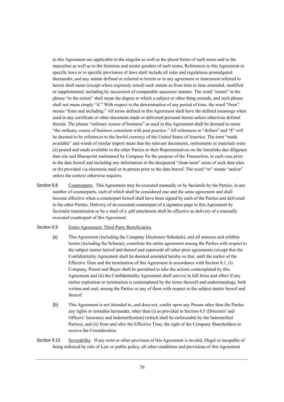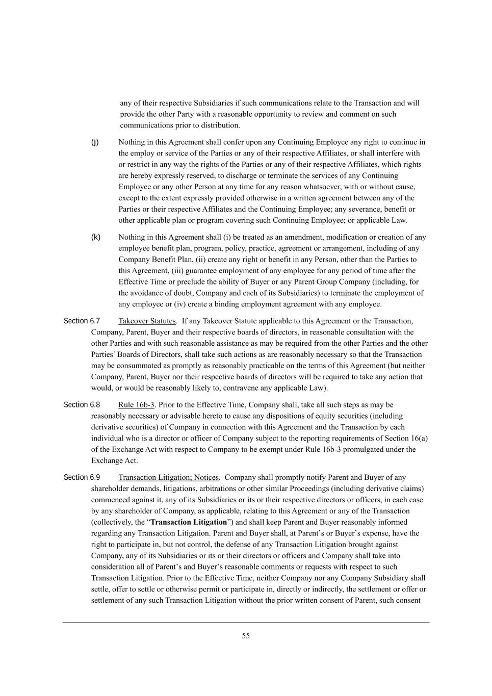 33 Wdo e\ j^[_h h[if[Yj_l[ MkXi_Z_Wh_[i _\ ikY^ Yecckd_YWj_edi h[bWj[ je j^[ NhWdiWYj_ed WdZ m_bb fhel_Z[ j^[ ej^[h JWhjo m_j^ W h[WiedWXb[ effehjkd_jo je h[l_[m WdZ Yecc[dj ed ikY^ Yecckd_YWj_edi fh_eh je Z_ijh_Xkj_ed, (j) Hej^_d] _d j^_i ;]h[[c[dj i^Wbb Yed\[h kfed Wdo =edj_dk_d] ?cfbeo[[ Wdo h_]^j je Yedj_dk[ _d j^[ [cfbeo eh i[hl_Y[ e\ j^[ JWhj_[i eh Wdo e\ j^[_h h[if[Yj_l[ ;\\_b_Wj[i* eh i^Wbb _dj[h\[h[ m_j^ eh h[ijh_Yj _d Wdo mWo j^[ h_]^ji e\ j^[ JWhj_[i eh Wdo e\ j^[_h h[if[Yj_l[ ;\\_b_Wj[i* m^_Y^ h_]^ji Wh[ ^[h[Xo [nfh[iibo h[i[hl[Z* je Z_iY^Wh][ eh j[hc_dWj[ j^[ i[hl_Y[i e\ Wdo =edj_dk_d] ?cfbeo[[ eh Wdo ej^[h J[hied Wj Wdo j_c[ \eh Wdo h[Wied m^Wjie[l[h* m_j^ eh m_j^ekj YWki[* [nY[fj je j^[ [nj[dj [nfh[iibo fhel_Z[Z ej^[hm_i[ _d W mh_jj[d W]h[[c[dj X[jm[[d Wdo e\ j^[ JWhj_[i eh j^[_h h[if[Yj_l[ ;\\_b_Wj[i WdZ j^[ =edj_dk_d] ?cfbeo[[9 Wdo i[l[hWdY[* X[d[\_j eh ej^[h Wffb_YWXb[ fbWd eh fhe]hWc Yel[h_d] ikY^ =edj_dk_d] ?cfbeo[[9 eh Wffb_YWXb[ FWm, (k) Hej^_d] _d j^_i ;]h[[c[dj i^Wbb (_) X[ jh[Wj[Z Wi Wd Wc[dZc[dj* ceZ_\_YWj_ed eh Yh[Wj_ed e\ Wdo [cfbeo[[ X[d[\_j fbWd* fhe]hWc* feb_Yo* fhWYj_Y[* W]h[[c[dj eh WhhWd][c[dj* _dYbkZ_d] e\ Wdo =ecfWdo <[d[\_j JbWd* (__) Yh[Wj[ Wdo h_]^j eh X[d[\_j _d Wdo J[hied* ej^[h j^Wd j^[ JWhj_[i je j^_i ;]h[[c[dj* (___) ]kWhWdj[[ [cfbeoc[dj e\ Wdo [cfbeo[[ \eh Wdo f[h_eZ e\ j_c[ W\j[h j^[ ?\\[Yj_l[ N_c[ eh fh[YbkZ[ j^[ WX_b_jo e\ <ko[h eh Wdo JWh[dj Ahekf =ecfWdo (_dYbkZ_d]* \eh j^[ Wle_ZWdY[ e\ ZekXj* =ecfWdo WdZ [WY^ e\ _ji MkXi_Z_Wh_[i) je j[hc_dWj[ j^[ [cfbeoc[dj e\ Wdo [cfbeo[[ eh (_l) Yh[Wj[ W X_dZ_d] [cfbeoc[dj W]h[[c[dj m_j^ Wdo [cfbeo[[, Section 6.7 NWa[el[h MjWjkj[i, C\ Wdo NWa[el[h MjWjkj[ Wffb_YWXb[ je j^_i ;]h[[c[dj eh j^[ NhWdiWYj_ed* =ecfWdo* JWh[dj* <ko[h WdZ j^[_h h[if[Yj_l[ XeWhZi e\ Z_h[Yjehi* _d h[WiedWXb[ YedikbjWj_ed m_j^ j^[ ej^[h JWhj_[i WdZ m_j^ ikY^ h[WiedWXb[ Wii_ijWdY[ Wi cWo X[ h[gk_h[Z \hec j^[ ej^[h JWhj_[i WdZ j^[ ej^[h JWhj_[iu <eWhZi e\ >_h[Yjehi* i^Wbb jWa[ ikY^ WYj_edi Wi Wh[ h[WiedWXbo d[Y[iiWho ie j^Wj j^[ NhWdiWYj_ed cWo X[ YedikccWj[Z Wi fhecfjbo Wi h[WiedWXbo fhWYj_YWXb[ ed j^[ j[hci e\ j^_i ;]h[[c[dj (Xkj d[_j^[h =ecfWdo* JWh[dj* <ko[h deh j^[_h h[if[Yj_l[ XeWhZi e\ Z_h[Yjehi m_bb X[ h[gk_h[Z je jWa[ Wdo WYj_ed j^Wj mekbZ* eh mekbZ X[ h[WiedWXbo b_a[bo je* YedjhWl[d[ Wdo Wffb_YWXb[ FWm), Section 6.8 Lkb[ /4X+1, Jh_eh je j^[ ?\\[Yj_l[ N_c[* =ecfWdo i^Wbb* jWa[ Wbb ikY^ ij[fi Wi cWo X[ h[WiedWXbo d[Y[iiWho eh WZl_iWXb[ ^[h[je je YWki[ Wdo Z_ifei_j_edi e\ [gk_jo i[Ykh_j_[i (_dYbkZ_d] Z[h_lWj_l[ i[Ykh_j_[i) e\ =ecfWdo _d Yedd[Yj_ed m_j^ j^_i ;]h[[c[dj WdZ j^[ NhWdiWYj_ed Xo [WY^ _dZ_l_ZkWb m^e _i W Z_h[Yjeh eh e\\_Y[h e\ =ecfWdo ikX`[Yj je j^[ h[fehj_d] h[gk_h[c[dji e\ M[Yj_ed /4(W) e\ j^[ ?nY^Wd][ ;Yj m_j^ h[if[Yj je =ecfWdo je X[ [n[cfj kdZ[h Lkb[ /4X+1 fheckb]Wj[Z kdZ[h j^[ ?nY^Wd][ ;Yj, Section 6.9 NhWdiWYj_ed F_j_]Wj_ed9 Hej_Y[i, =ecfWdo i^Wbb fhecfjbo dej_\o JWh[dj WdZ <ko[h e\ Wdo i^Wh[^ebZ[h Z[cWdZi* b_j_]Wj_edi* WhX_jhWj_edi eh ej^[h i_c_bWh JheY[[Z_d]i (_dYbkZ_d] Z[h_lWj_l[ YbW_ci) Yecc[dY[Z W]W_dij _j* Wdo e\ _ji MkXi_Z_Wh_[i eh _ji eh j^[_h h[if[Yj_l[ Z_h[Yjehi eh e\\_Y[hi* _d [WY^ YWi[ Xo Wdo i^Wh[^ebZ[h e\ =ecfWdo* Wi Wffb_YWXb[* h[bWj_d] je j^_i ;]h[[c[dj eh Wdo e\ j^[ NhWdiWYj_ed (Yebb[Yj_l[bo* j^[ rTransaction Litigations) WdZ i^Wbb a[[f JWh[dj WdZ <ko[h h[WiedWXbo _d\ehc[Z h[]WhZ_d] Wdo NhWdiWYj_ed F_j_]Wj_ed, JWh[dj WdZ <ko[h i^Wbb* Wj JWh[djui eh <ko[hui [nf[di[* ^Wl[ j^[ h_]^j je fWhj_Y_fWj[ _d* Xkj dej Yedjheb* j^[ Z[\[di[ e\ Wdo NhWdiWYj_ed F_j_]Wj_ed Xhek]^j W]W_dij =ecfWdo* Wdo e\ _ji MkXi_Z_Wh_[i eh _ji eh j^[_h Z_h[Yjehi eh e\\_Y[hi WdZ =ecfWdo i^Wbb jWa[ _dje Yedi_Z[hWj_ed Wbb e\ JWh[djui WdZ <ko[hui h[WiedWXb[ Yecc[dji eh h[gk[iji m_j^ h[if[Yj je ikY^ NhWdiWYj_ed F_j_]Wj_ed, Jh_eh je j^[ ?\\[Yj_l[ N_c[* d[_j^[h =ecfWdo deh Wdo =ecfWdo MkXi_Z_Who i^Wbb i[jjb[* e\\[h je i[jjb[ eh ej^[hm_i[ f[hc_j eh fWhj_Y_fWj[ _d* Z_h[Yjbo eh _dZ_h[Yjbo* j^[ i[jjb[c[dj eh e\\[h eh i[jjb[c[dj e\ Wdo ikY^ NhWdiWYj_ed F_j_]Wj_ed m_j^ekj j^[ fh_eh mh_jj[d Yedi[dj e\ JWh[dj* ikY^ Yedi[dj