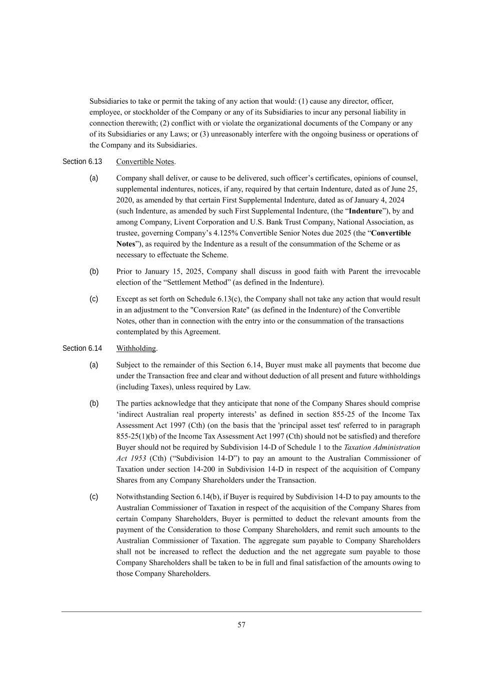 35 MkXi_Z_Wh_[i je jWa[ eh f[hc_j j^[ jWa_d] e\ Wdo WYj_ed j^Wj mekbZ8 (/) YWki[ Wdo Z_h[Yjeh* e\\_Y[h* [cfbeo[[* eh ijeYa^ebZ[h e\ j^[ =ecfWdo eh Wdo e\ _ji MkXi_Z_Wh_[i je _dYkh Wdo f[hiedWb b_WX_b_jo _d Yedd[Yj_ed j^[h[m_j^9 (0) Yed\b_Yj m_j^ eh l_ebWj[ j^[ eh]Wd_pWj_edWb ZeYkc[dji e\ j^[ =ecfWdo eh Wdo e\ _ji MkXi_Z_Wh_[i eh Wdo FWmi9 eh (1) kdh[WiedWXbo _dj[h\[h[ m_j^ j^[ ed]e_d] Xki_d[ii eh ef[hWj_edi e\ j^[ =ecfWdo WdZ _ji MkXi_Z_Wh_[i, Section 6.13 =edl[hj_Xb[ Hej[i, (a) =ecfWdo i^Wbb Z[b_l[h* eh YWki[ je X[ Z[b_l[h[Z* ikY^ e\\_Y[hui Y[hj_\_YWj[i* ef_d_edi e\ Yekdi[b* ikffb[c[djWb _dZ[djkh[i* dej_Y[i* _\ Wdo* h[gk_h[Z Xo j^Wj Y[hjW_d CdZ[djkh[* ZWj[Z Wi e\ Dkd[ 03* 0.0.* Wi Wc[dZ[Z Xo j^Wj Y[hjW_d @_hij Mkffb[c[djWb CdZ[djkh[* ZWj[Z Wi e\ DWdkWho 2* 0.02 (ikY^ CdZ[djkh[* Wi Wc[dZ[Z Xo ikY^ @_hij Mkffb[c[djWb CdZ[djkh[* (j^[ rIndentures)* Xo WdZ Wced] =ecfWdo* F_l[dj =ehfehWj_ed WdZ O,M, <Wda Nhkij =ecfWdo* HWj_edWb ;iieY_Wj_ed* Wi jhkij[[* ]el[hd_d] =ecfWdoui 2,/03% =edl[hj_Xb[ M[d_eh Hej[i Zk[ 0.03 (j^[ rConvertible Notess)* Wi h[gk_h[Z Xo j^[ CdZ[djkh[ Wi W h[ikbj e\ j^[ YedikccWj_ed e\ j^[ MY^[c[ eh Wi d[Y[iiWho je [\\[YjkWj[ j^[ MY^[c[, (b) Jh_eh je DWdkWho /3* 0.03* =ecfWdo i^Wbb Z_iYkii _d ]eeZ \W_j^ m_j^ JWh[dj j^[ _hh[leYWXb[ [b[Yj_ed e\ j^[ rM[jjb[c[dj G[j^eZs (Wi Z[\_d[Z _d j^[ CdZ[djkh[), (c) ?nY[fj Wi i[j \ehj^ ed MY^[Zkb[ 4,/1(Y)* j^[ =ecfWdo i^Wbb dej jWa[ Wdo WYj_ed j^Wj mekbZ h[ikbj _d Wd WZ`kijc[dj je j^[ #=edl[hi_ed LWj[# (Wi Z[\_d[Z _d j^[ CdZ[djkh[) e\ j^[ =edl[hj_Xb[ Hej[i* ej^[h j^Wd _d Yedd[Yj_ed m_j^ j^[ [djho _dje eh j^[ YedikccWj_ed e\ j^[ jhWdiWYj_edi Yedj[cfbWj[Z Xo j^_i ;]h[[c[dj, Section 6.14 Q_j^^ebZ_d], (a) MkX`[Yj je j^[ h[cW_dZ[h e\ j^_i M[Yj_ed 4,/2* <ko[h ckij cWa[ Wbb fWoc[dji j^Wj X[Yec[ Zk[ kdZ[h j^[ NhWdiWYj_ed \h[[ WdZ Yb[Wh WdZ m_j^ekj Z[ZkYj_ed e\ Wbb fh[i[dj WdZ \kjkh[ m_j^^ebZ_d]i (_dYbkZ_d] NWn[i)* kdb[ii h[gk_h[Z Xo FWm, (b) N^[ fWhj_[i WYademb[Z][ j^Wj j^[o Wdj_Y_fWj[ j^Wj ded[ e\ j^[ =ecfWdo M^Wh[i i^ekbZ Yecfh_i[ t_dZ_h[Yj ;kijhWb_Wd h[Wb fhef[hjo _dj[h[ijiu Wi Z[\_d[Z _d i[Yj_ed 633+03 e\ j^[ CdYec[ NWn ;ii[iic[dj ;Yj /775 (=j^) (ed j^[ XWi_i j^Wj j^[ 'fh_dY_fWb Wii[j j[ij' h[\[hh[Z je _d fWhW]hWf^ 633+03(/)(X) e\ j^[ CdYec[ NWn ;ii[iic[dj ;Yj /775 (=j^) i^ekbZ dej X[ iWj_i\_[Z) WdZ j^[h[\eh[ <ko[h i^ekbZ dej X[ h[gk_h[Z Xo MkXZ_l_i_ed /2+> e\ MY^[Zkb[ / je j^[ Taxation Administration Act 1953 (=j^) (rMkXZ_l_i_ed /2+>s) je fWo Wd Wcekdj je j^[ ;kijhWb_Wd =ecc_ii_ed[h e\ NWnWj_ed kdZ[h i[Yj_ed /2+0.. _d MkXZ_l_i_ed /2+> _d h[if[Yj e\ j^[ WYgk_i_j_ed e\ =ecfWdo M^Wh[i \hec Wdo =ecfWdo M^Wh[^ebZ[hi kdZ[h j^[ NhWdiWYj_ed, (c) Hejm_j^ijWdZ_d] M[Yj_ed 4,/2(X)* _\ <ko[h _i h[gk_h[Z Xo MkXZ_l_i_ed /2+> je fWo Wcekdji je j^[ ;kijhWb_Wd =ecc_ii_ed[h e\ NWnWj_ed _d h[if[Yj e\ j^[ WYgk_i_j_ed e\ j^[ =ecfWdo M^Wh[i \hec Y[hjW_d =ecfWdo M^Wh[^ebZ[hi* <ko[h _i f[hc_jj[Z je Z[ZkYj j^[ h[b[lWdj Wcekdji \hec j^[ fWoc[dj e\ j^[ =edi_Z[hWj_ed je j^ei[ =ecfWdo M^Wh[^ebZ[hi* WdZ h[c_j ikY^ Wcekdji je j^[ ;kijhWb_Wd =ecc_ii_ed[h e\ NWnWj_ed, N^[ W]]h[]Wj[ ikc fWoWXb[ je =ecfWdo M^Wh[^ebZ[hi i^Wbb dej X[ _dYh[Wi[Z je h[\b[Yj j^[ Z[ZkYj_ed WdZ j^[ d[j W]]h[]Wj[ ikc fWoWXb[ je j^ei[ =ecfWdo M^Wh[^ebZ[hi i^Wbb X[ jWa[d je X[ _d \kbb WdZ \_dWb iWj_i\WYj_ed e\ j^[ Wcekdji em_d] je j^ei[ =ecfWdo M^Wh[^ebZ[hi,