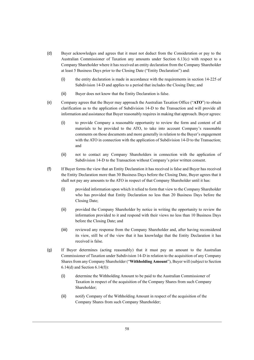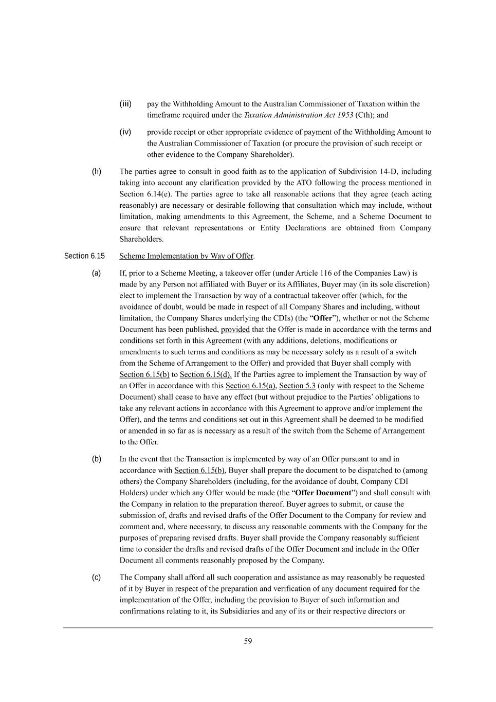 37 (iii) fWo j^[ Q_j^^ebZ_d] ;cekdj je j^[ ;kijhWb_Wd =ecc_ii_ed[h e\ NWnWj_ed m_j^_d j^[ j_c[\hWc[ h[gk_h[Z kdZ[h j^[ Taxation Administration Act 1953 (=j^)9 WdZ (iv) fhel_Z[ h[Y[_fj eh ej^[h Wffhefh_Wj[ [l_Z[dY[ e\ fWoc[dj e\ j^[ Q_j^^ebZ_d] ;cekdj je j^[ ;kijhWb_Wd =ecc_ii_ed[h e\ NWnWj_ed (eh fheYkh[ j^[ fhel_i_ed e\ ikY^ h[Y[_fj eh ej^[h [l_Z[dY[ je j^[ =ecfWdo M^Wh[^ebZ[h), (h) N^[ fWhj_[i W]h[[ je Yedikbj _d ]eeZ \W_j^ Wi je j^[ Wffb_YWj_ed e\ MkXZ_l_i_ed /2+>* _dYbkZ_d] jWa_d] _dje WYYekdj Wdo YbWh_\_YWj_ed fhel_Z[Z Xo j^[ ;NI \ebbem_d] j^[ fheY[ii c[dj_ed[Z _d M[Yj_ed 4,/2([), N^[ fWhj_[i W]h[[ je jWa[ Wbb h[WiedWXb[ WYj_edi j^Wj j^[o W]h[[ ([WY^ WYj_d] h[WiedWXbo) Wh[ d[Y[iiWho eh Z[i_hWXb[ \ebbem_d] j^Wj YedikbjWj_ed m^_Y^ cWo _dYbkZ[* m_j^ekj b_c_jWj_ed* cWa_d] Wc[dZc[dji je j^_i ;]h[[c[dj* j^[ MY^[c[* WdZ W MY^[c[ >eYkc[dj je [dikh[ j^Wj h[b[lWdj h[fh[i[djWj_edi eh ?dj_jo >[YbWhWj_edi Wh[ eXjW_d[Z \hec =ecfWdo M^Wh[^ebZ[hi, Section 6.15 MY^[c[ Ccfb[c[djWj_ed Xo QWo e\ I\\[h, (a) C\* fh_eh je W MY^[c[ G[[j_d]* W jWa[el[h e\\[h (kdZ[h ;hj_Yb[ //4 e\ j^[ =ecfWd_[i FWm) _i cWZ[ Xo Wdo J[hied dej W\\_b_Wj[Z m_j^ <ko[h eh _ji ;\\_b_Wj[i* <ko[h cWo (_d _ji ieb[ Z_iYh[j_ed) [b[Yj je _cfb[c[dj j^[ NhWdiWYj_ed Xo mWo e\ W YedjhWYjkWb jWa[el[h e\\[h (m^_Y^* \eh j^[ Wle_ZWdY[ e\ ZekXj* mekbZ X[ cWZ[ _d h[if[Yj e\ Wbb =ecfWdo M^Wh[i WdZ _dYbkZ_d]* m_j^ekj b_c_jWj_ed* j^[ =ecfWdo M^Wh[i kdZ[hbo_d] j^[ =>Ci) (j^[ rOffers)* m^[j^[h eh dej j^[ MY^[c[ >eYkc[dj ^Wi X[[d fkXb_i^[Z* fhel_Z[Z j^Wj j^[ I\\[h _i cWZ[ _d WYYehZWdY[ m_j^ j^[ j[hci WdZ YedZ_j_edi i[j \ehj^ _d j^_i ;]h[[c[dj (m_j^ Wdo WZZ_j_edi* Z[b[j_edi* ceZ_\_YWj_edi eh Wc[dZc[dji je ikY^ j[hci WdZ YedZ_j_edi Wi cWo X[ d[Y[iiWho ieb[bo Wi W h[ikbj e\ W im_jY^ \hec j^[ MY^[c[ e\ ;hhWd][c[dj je j^[ I\\[h) WdZ fhel_Z[Z j^Wj <ko[h i^Wbb Yecfbo m_j^ M[Yj_ed 4,/3(X) je M[Yj_ed 4,/3(Z), C\ j^[ JWhj_[i W]h[[ je _cfb[c[dj j^[ NhWdiWYj_ed Xo mWo e\ Wd I\\[h _d WYYehZWdY[ m_j^ j^_i M[Yj_ed 4,/3(W)* M[Yj_ed 3,1 (edbo m_j^ h[if[Yj je j^[ MY^[c[ >eYkc[dj) i^Wbb Y[Wi[ je ^Wl[ Wdo [\\[Yj (Xkj m_j^ekj fh[`kZ_Y[ je j^[ JWhj_[iu eXb_]Wj_edi je jWa[ Wdo h[b[lWdj WYj_edi _d WYYehZWdY[ m_j^ j^_i ;]h[[c[dj je Wffhel[ WdZ-eh _cfb[c[dj j^[ I\\[h)* WdZ j^[ j[hci WdZ YedZ_j_edi i[j ekj _d j^_i ;]h[[c[dj i^Wbb X[ Z[[c[Z je X[ ceZ_\_[Z eh Wc[dZ[Z _d ie \Wh Wi _i d[Y[iiWho Wi W h[ikbj e\ j^[ im_jY^ \hec j^[ MY^[c[ e\ ;hhWd][c[dj je j^[ I\\[h, (b) Cd j^[ [l[dj j^Wj j^[ NhWdiWYj_ed _i _cfb[c[dj[Z Xo mWo e\ Wd I\\[h fkhikWdj je WdZ _d WYYehZWdY[ m_j^ M[Yj_ed 4,/3(X)* <ko[h i^Wbb fh[fWh[ j^[ ZeYkc[dj je X[ Z_ifWjY^[Z je (Wced] ej^[hi) j^[ =ecfWdo M^Wh[^ebZ[hi (_dYbkZ_d]* \eh j^[ Wle_ZWdY[ e\ ZekXj* =ecfWdo =>C BebZ[hi) kdZ[h m^_Y^ Wdo I\\[h mekbZ X[ cWZ[ (j^[ rOffer Documents) WdZ i^Wbb Yedikbj m_j^ j^[ =ecfWdo _d h[bWj_ed je j^[ fh[fWhWj_ed j^[h[e\, <ko[h W]h[[i je ikXc_j* eh YWki[ j^[ ikXc_ii_ed e\* ZhW\ji WdZ h[l_i[Z ZhW\ji e\ j^[ I\\[h >eYkc[dj je j^[ =ecfWdo \eh h[l_[m WdZ Yecc[dj WdZ* m^[h[ d[Y[iiWho* je Z_iYkii Wdo h[WiedWXb[ Yecc[dji m_j^ j^[ =ecfWdo \eh j^[ fkhfei[i e\ fh[fWh_d] h[l_i[Z ZhW\ji, <ko[h i^Wbb fhel_Z[ j^[ =ecfWdo h[WiedWXbo ik\\_Y_[dj j_c[ je Yedi_Z[h j^[ ZhW\ji WdZ h[l_i[Z ZhW\ji e\ j^[ I\\[h >eYkc[dj WdZ _dYbkZ[ _d j^[ I\\[h >eYkc[dj Wbb Yecc[dji h[WiedWXbo fhefei[Z Xo j^[ =ecfWdo, (c) N^[ =ecfWdo i^Wbb W\\ehZ Wbb ikY^ Yeef[hWj_ed WdZ Wii_ijWdY[ Wi cWo h[WiedWXbo X[ h[gk[ij[Z e\ _j Xo <ko[h _d h[if[Yj e\ j^[ fh[fWhWj_ed WdZ l[h_\_YWj_ed e\ Wdo ZeYkc[dj h[gk_h[Z \eh j^[ _cfb[c[djWj_ed e\ j^[ I\\[h* _dYbkZ_d] j^[ fhel_i_ed je <ko[h e\ ikY^ _d\ehcWj_ed WdZ Yed\_hcWj_edi h[bWj_d] je _j* _ji MkXi_Z_Wh_[i WdZ Wdo e\ _ji eh j^[_h h[if[Yj_l[ Z_h[Yjehi eh