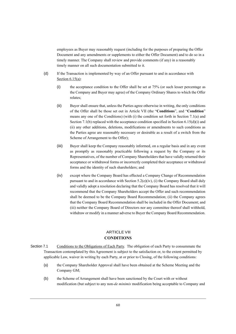 4. [cfbeo[[i Wi <ko[h cWo h[WiedWXbo h[gk[ij (_dYbkZ_d] \eh j^[ fkhfei[i e\ fh[fWh_d] j^[ I\\[h >eYkc[dj WdZ Wdo Wc[dZc[dji eh ikffb[c[dji je [_j^[h j^[ I\\[h >eYkc[dj) WdZ je Ze ie _d W j_c[bo cWdd[h, N^[ =ecfWdo i^Wbb h[l_[m WdZ fhel_Z[ Yecc[dji (_\ Wdo) _d W h[WiedWXbo j_c[bo cWdd[h ed Wbb ikY^ ZeYkc[djWj_ed ikXc_jj[Z je _j, (d) C\ j^[ NhWdiWYj_ed _i _cfb[c[dj[Z Xo mWo e\ Wd I\\[h fkhikWdj je WdZ _d WYYehZWdY[ m_j^ M[Yj_ed 4,/3(W)8 (i) j^[ WYY[fjWdY[ YedZ_j_ed je j^[ I\\[h i^Wbb X[ i[j Wj 53% (eh ikY^ b[ii[h f[hY[djW][ Wi j^[ =ecfWdo WdZ <ko[h cWo W]h[[) e\ j^[ =ecfWdo IhZ_dWho M^Wh[i je m^_Y^ j^[ I\\[h h[bWj[i9 (ii) <ko[h i^Wbb [dikh[ j^Wj* kdb[ii j^[ JWhj_[i W]h[[ ej^[hm_i[ _d mh_j_d]* j^[ edbo YedZ_j_edi e\ j^[ I\\[h i^Wbb X[ j^ei[ i[j ekj _d ;hj_Yb[ PCC (j^[ rConditionss* WdZ rConditions c[Wdi Wdo ed[ e\ j^[ =edZ_j_edi) (m_j^ (_) j^[ YedZ_j_ed i[j \ehj^ _d M[Yj_ed 5,/(W) WdZ M[Yj_ed 5,/(X) h[fbWY[Z m_j^ j^[ WYY[fjWdY[ YedZ_j_ed if[Y_\_[Z _d M[Yj_ed 4,/3(Z)(_) WdZ (__) Wdo ej^[h WZZ_j_edi* Z[b[j_edi* ceZ_\_YWj_edi eh Wc[dZc[dji je ikY^ YedZ_j_edi Wi j^[ JWhj_[i W]h[[ Wh[ h[WiedWXbo d[Y[iiWho eh Z[i_hWXb[ Wi W h[ikbj e\ W im_jY^ \hec j^[ MY^[c[ e\ ;hhWd][c[dj je j^[ I\\[h)9 (iii) <ko[h i^Wbb a[[f j^[ =ecfWdo h[WiedWXbo _d\ehc[Z* ed W h[]kbWh XWi_i WdZ _d Wdo [l[dj Wi fhecfjbo Wi h[WiedWXbo fhWYj_YWXb[ \ebbem_d] W h[gk[ij Xo j^[ =ecfWdo eh _ji L[fh[i[djWj_l[i* e\ j^[ dkcX[h e\ =ecfWdo M^Wh[^ebZ[hi j^Wj ^Wl[ lWb_Zbo h[jkhd[Z j^[_h WYY[fjWdY[ eh m_j^ZhWmWb \ehci eh _dYehh[Yjbo Yecfb[j[Z j^[_h WYY[fjWdY[ eh m_j^ZhWmWb \ehci WdZ j^[ _Z[dj_jo e\ ikY^ i^Wh[^ebZ[hi9 WdZ (iv) [nY[fj m^[h[ j^[ =ecfWdo <eWhZ ^Wi [\\[Yj[Z W =ecfWdo =^Wd][ e\ L[Yecc[dZWj_ed fkhikWdj je WdZ _d WYYehZWdY[ m_j^ M[Yj_ed 3,0([)(_l)* (_) j^[ =ecfWdo <eWhZ i^Wbb Zkbo WdZ lWb_Zbo WZefj W h[iebkj_ed Z[YbWh_d] j^Wj j^[ =ecfWdo <eWhZ ^Wi h[iebl[Z j^Wj _j m_bb h[Yecc[dZ j^Wj j^[ =ecfWdo M^Wh[^ebZ[hi WYY[fj j^[ I\\[h WdZ ikY^ h[Yecc[dZWj_ed i^Wbb X[ Z[[c[Z je X[ j^[ =ecfWdo <eWhZ L[Yecc[dZWj_ed9 (__) j^[ =ecfWdo W]h[[i j^Wj j^[ =ecfWdo <eWhZ L[Yecc[dZWj_ed i^Wbb X[ _dYbkZ[Z _d j^[ I\\[h >eYkc[dj9 WdZ (___) d[_j^[h j^[ =ecfWdo <eWhZ e\ >_h[Yjehi deh Wdo Yecc_jj[[ j^[h[e\ i^Wbb m_j^^ebZ* m_j^ZhWm eh ceZ_\o _d W cWdd[h WZl[hi[ je <ko[h j^[ =ecfWdo <eWhZ L[Yecc[dZWj_ed, ARTICLE VII CONDITIONS Section 7.1 =edZ_j_edi je j^[ IXb_]Wj_edi e\ ?WY^ JWhjo, N^[ eXb_]Wj_ed e\ [WY^ JWhjo je YedikccWj[ j^[ NhWdiWYj_ed Yedj[cfbWj[Z Xo j^_i ;]h[[c[dj _i ikX`[Yj je j^[ iWj_i\WYj_ed eh* je j^[ [nj[dj f[hc_jj[Z Xo Wffb_YWXb[ FWm* mW_l[h _d mh_j_d] Xo [WY^ JWhjo* Wj eh fh_eh je =bei_d]* e\ j^[ \ebbem_d] YedZ_j_edi8 (a) j^[ =ecfWdo M^Wh[^ebZ[h ;ffhelWb i^Wbb ^Wl[ X[[d eXjW_d[Z Wj j^[ MY^[c[ G[[j_d] WdZ j^[ =ecfWdo AG9 (b) j^[ MY^[c[ e\ ;hhWd][c[dj i^Wbb ^Wl[ X[[d iWdYj_ed[Z Xo j^[ =ekhj m_j^ eh m_j^ekj ceZ_\_YWj_ed (Xkj ikX`[Yj je Wdo ded+de minimis ceZ_\_YWj_ed X[_d] WYY[fjWXb[ je =ecfWdo WdZ