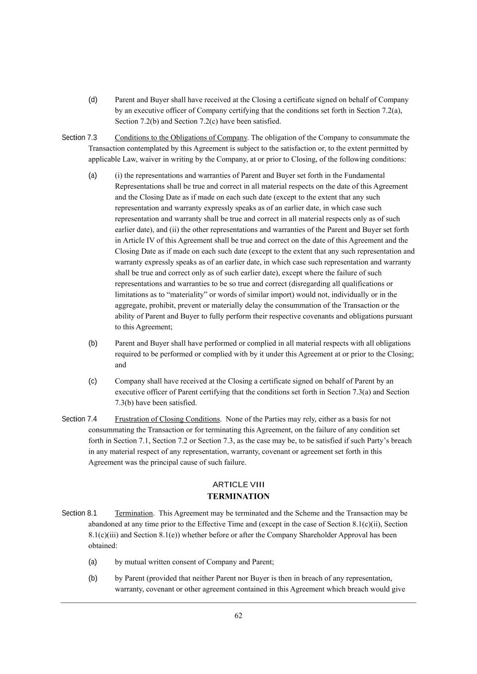 40 (d) JWh[dj WdZ <ko[h i^Wbb ^Wl[ h[Y[_l[Z Wj j^[ =bei_d] W Y[hj_\_YWj[ i_]d[Z ed X[^Wb\ e\ =ecfWdo Xo Wd [n[Ykj_l[ e\\_Y[h e\ =ecfWdo Y[hj_\o_d] j^Wj j^[ YedZ_j_edi i[j \ehj^ _d M[Yj_ed 5,0(W)* M[Yj_ed 5,0(X) WdZ M[Yj_ed 5,0(Y) ^Wl[ X[[d iWj_i\_[Z, Section 7.3 =edZ_j_edi je j^[ IXb_]Wj_edi e\ =ecfWdo, N^[ eXb_]Wj_ed e\ j^[ =ecfWdo je YedikccWj[ j^[ NhWdiWYj_ed Yedj[cfbWj[Z Xo j^_i ;]h[[c[dj _i ikX`[Yj je j^[ iWj_i\WYj_ed eh* je j^[ [nj[dj f[hc_jj[Z Xo Wffb_YWXb[ FWm* mW_l[h _d mh_j_d] Xo j^[ =ecfWdo* Wj eh fh_eh je =bei_d]* e\ j^[ \ebbem_d] YedZ_j_edi8 (a) (_) j^[ h[fh[i[djWj_edi WdZ mWhhWdj_[i e\ JWh[dj WdZ <ko[h i[j \ehj^ _d j^[ @kdZWc[djWb L[fh[i[djWj_edi i^Wbb X[ jhk[ WdZ Yehh[Yj _d Wbb cWj[h_Wb h[if[Yji ed j^[ ZWj[ e\ j^_i ;]h[[c[dj WdZ j^[ =bei_d] >Wj[ Wi _\ cWZ[ ed [WY^ ikY^ ZWj[ ([nY[fj je j^[ [nj[dj j^Wj Wdo ikY^ h[fh[i[djWj_ed WdZ mWhhWdjo [nfh[iibo if[Wai Wi e\ Wd [Whb_[h ZWj[* _d m^_Y^ YWi[ ikY^ h[fh[i[djWj_ed WdZ mWhhWdjo i^Wbb X[ jhk[ WdZ Yehh[Yj _d Wbb cWj[h_Wb h[if[Yji edbo Wi e\ ikY^ [Whb_[h ZWj[)* WdZ (__) j^[ ej^[h h[fh[i[djWj_edi WdZ mWhhWdj_[i e\ j^[ JWh[dj WdZ <ko[h i[j \ehj^ _d ;hj_Yb[ CP e\ j^_i ;]h[[c[dj i^Wbb X[ jhk[ WdZ Yehh[Yj ed j^[ ZWj[ e\ j^_i ;]h[[c[dj WdZ j^[ =bei_d] >Wj[ Wi _\ cWZ[ ed [WY^ ikY^ ZWj[ ([nY[fj je j^[ [nj[dj j^Wj Wdo ikY^ h[fh[i[djWj_ed WdZ mWhhWdjo [nfh[iibo if[Wai Wi e\ Wd [Whb_[h ZWj[* _d m^_Y^ YWi[ ikY^ h[fh[i[djWj_ed WdZ mWhhWdjo i^Wbb X[ jhk[ WdZ Yehh[Yj edbo Wi e\ ikY^ [Whb_[h ZWj[)* [nY[fj m^[h[ j^[ \W_bkh[ e\ ikY^ h[fh[i[djWj_edi WdZ mWhhWdj_[i je X[ ie jhk[ WdZ Yehh[Yj (Z_ih[]WhZ_d] Wbb gkWb_\_YWj_edi eh b_c_jWj_edi Wi je rcWj[h_Wb_jos eh mehZi e\ i_c_bWh _cfehj) mekbZ dej* _dZ_l_ZkWbbo eh _d j^[ W]]h[]Wj[* fhe^_X_j* fh[l[dj eh cWj[h_Wbbo Z[bWo j^[ YedikccWj_ed e\ j^[ NhWdiWYj_ed eh j^[ WX_b_jo e\ JWh[dj WdZ <ko[h je \kbbo f[h\ehc j^[_h h[if[Yj_l[ Yel[dWdji WdZ eXb_]Wj_edi fkhikWdj je j^_i ;]h[[c[dj9 (b) JWh[dj WdZ <ko[h i^Wbb ^Wl[ f[h\ehc[Z eh Yecfb_[Z _d Wbb cWj[h_Wb h[if[Yji m_j^ Wbb eXb_]Wj_edi h[gk_h[Z je X[ f[h\ehc[Z eh Yecfb_[Z m_j^ Xo _j kdZ[h j^_i ;]h[[c[dj Wj eh fh_eh je j^[ =bei_d]9 WdZ (c) =ecfWdo i^Wbb ^Wl[ h[Y[_l[Z Wj j^[ =bei_d] W Y[hj_\_YWj[ i_]d[Z ed X[^Wb\ e\ JWh[dj Xo Wd [n[Ykj_l[ e\\_Y[h e\ JWh[dj Y[hj_\o_d] j^Wj j^[ YedZ_j_edi i[j \ehj^ _d M[Yj_ed 5,1(W) WdZ M[Yj_ed 5,1(X) ^Wl[ X[[d iWj_i\_[Z, Section 7.4 @hkijhWj_ed e\ =bei_d] =edZ_j_edi, Hed[ e\ j^[ JWhj_[i cWo h[bo* [_j^[h Wi W XWi_i \eh dej YedikccWj_d] j^[ NhWdiWYj_ed eh \eh j[hc_dWj_d] j^_i ;]h[[c[dj* ed j^[ \W_bkh[ e\ Wdo YedZ_j_ed i[j \ehj^ _d M[Yj_ed 5,/* M[Yj_ed 5,0 eh M[Yj_ed 5,1* Wi j^[ YWi[ cWo X[* je X[ iWj_i\_[Z _\ ikY^ JWhjoui Xh[WY^ _d Wdo cWj[h_Wb h[if[Yj e\ Wdo h[fh[i[djWj_ed* mWhhWdjo* Yel[dWdj eh W]h[[c[dj i[j \ehj^ _d j^_i ;]h[[c[dj mWi j^[ fh_dY_fWb YWki[ e\ ikY^ \W_bkh[, ARTICLE VIII TERMINATION Section 8.1 N[hc_dWj_ed, N^_i ;]h[[c[dj cWo X[ j[hc_dWj[Z WdZ j^[ MY^[c[ WdZ j^[ NhWdiWYj_ed cWo X[ WXWdZed[Z Wj Wdo j_c[ fh_eh je j^[ ?\\[Yj_l[ N_c[ WdZ ([nY[fj _d j^[ YWi[ e\ M[Yj_ed 6,/(Y)(__)* M[Yj_ed 6,/(Y)(___) WdZ M[Yj_ed 6,/([)) m^[j^[h X[\eh[ eh W\j[h j^[ =ecfWdo M^Wh[^ebZ[h ;ffhelWb ^Wi X[[d eXjW_d[Z8 (a) Xo ckjkWb mh_jj[d Yedi[dj e\ =ecfWdo WdZ JWh[dj9 (b) Xo JWh[dj (fhel_Z[Z j^Wj d[_j^[h JWh[dj deh <ko[h _i j^[d _d Xh[WY^ e\ Wdo h[fh[i[djWj_ed* mWhhWdjo* Yel[dWdj eh ej^[h W]h[[c[dj YedjW_d[Z _d j^_i ;]h[[c[dj m^_Y^ Xh[WY^ mekbZ ]_l[