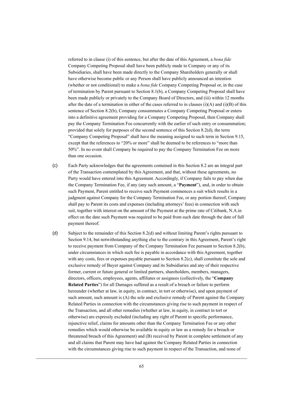 42 eh ej^[hm_i[ fhe^_X_ji j^[ YedikccWj_ed e\ j^[ MY^[c[ eh (__) Wdo Ael[hdc[djWb ?dj_jo ^Wl_d] `kh_iZ_Yj_ed el[h W JWhjo i^Wbb ^Wl[ WZefj[Z W FWm j^Wj _i _d [\\[Yj j^Wj f[hcWd[djbo cWa[i _bb[]Wb eh ej^[hm_i[ f[hcWd[djbo fhe^_X_ji j^[ YedikccWj_ed e\ j^[ MY^[c[ (fhel_Z[Z j^Wj _\ Wdo ikY^ FWm Wh_i[i ekj e\ eh h[bWj[i je ;dj_jhkij FWmi eh Cdl[ijc[dj MYh[[d_d] FWmi* ikY^ FWm m_bb edbo h[ikbj _d W h_]^j je j[hc_dWj[ j^_i ;]h[[c[dj fkhikWdj je j^_i M[Yj_ed 6,/(\)(__) je j^[ [nj[dj _j mekbZ Yedij_jkj[ W rGWj[h_Wb L[ijhW_djs9 fhel_Z[Z* \khj^[h* j^Wj* \eh YbWh_jo* dejm_j^ijWdZ_d] Wdoj^_d] je j^[ YedjhWho _d j^[ Z[\_d_j_ed e\ GWj[h_Wb L[ijhW_dj* ikY^ FWm ckij f[hcWd[djbo fhe^_X_j eh f[hcWd[djbo cWa[ _bb[]Wb j^[ YedikccWj_ed e\ j^[ NhWdiWYj_ed eh j^[ MY^[c[)9 fhel_Z[Z j^Wj j^[ h_]^j je j[hc_dWj[ j^_i ;]h[[c[dj fkhikWdj je j^_i M[Yj_ed 6,/(\) i^Wbb dej X[ WlW_bWXb[ je Wdo JWhjo m^ei[ cWj[h_Wb Xh[WY^ e\ Wdo h[fh[i[djWj_ed* mWhhWdjo* Yel[dWdj eh W]h[[c[dj i[j \ehj^ _d j^_i ;]h[[c[dj ^Wi X[[d j^[ fh_dY_fWb YWki[ e\ ikY^ IhZ[h eh FWm9 (g) Xo [_j^[h JWh[dj eh =ecfWdo* _\ j^[ =ecfWdo M^Wh[^ebZ[h ;ffhelWb i^Wbb dej ^Wl[ X[[d eXjW_d[Z Wj j^[ MY^[c[ G[[j_d] eh Wj Wdo WZ`ekhdc[dj eh feijfed[c[dj j^[h[e\* _d [WY^ YWi[ Wj m^_Y^ W lej[ ed ikY^ WffhelWb mWi jWa[d9 eh (h) Xo [_j^[h =ecfWdo eh JWh[dj* _\ j^[ =ekhj (eh Wdo Yecf[j[dj Yekhj e\ Wff[Wb j^[h[\hec) Z[\_d_j_l[bo Z[Yb_d[i eh h[\ki[i je cWa[ Wdo ehZ[hi Z_h[Yj_d] =ecfWdo je Yedl[d[ j^[ MY^[c[ G[[j_d] eh W\\_hcWj_l[bo Z[\_d_j_l[bo Z[Yb_d[i eh h[\ki[i je Wffhel[ j^[ MY^[c[9 fhel_Z[Z j^Wj j^[ h_]^j je j[hc_dWj[ j^_i ;]h[[c[dj fkhikWdj je j^_i M[Yj_ed 6,/(Y)(_) i^Wbb dej X[ WlW_bWXb[* (_) _d j^[ [l[dj JWh[dj WdZ <ko[h W]h[[ _d mh_j_d] je _cfb[c[dj j^[ NhWdiWYj_ed Xo mWo e\ j^[ I\\[h9 eh (__) je Wdo JWhjo m^ei[ cWj[h_Wb Xh[WY^ e\ Wdo h[fh[i[djWj_ed* mWhhWdjo* Yel[dWdj eh W]h[[c[dj i[j \ehj^ _d j^_i ;]h[[c[dj ^Wi X[[d j^[ fh_dY_fWb YWki[ e\ ikY^ Z[Yb_dWj_ed eh h[\kiWb, Section 8.2 ?\\[Yj e\ N[hc_dWj_ed, (a) Cd j^[ [l[dj j^_i ;]h[[c[dj _i j[hc_dWj[Z fkhikWdj je M[Yj_ed 6,/* mh_jj[d dej_Y[ j^[h[e\ i^Wbb X[ ]_l[d je j^[ ej^[h JWhj_[i* if[Y_\o_d] j^[ fhel_i_edi ^[h[e\ fkhikWdj je m^_Y^ ikY^ j[hc_dWj_ed _i cWZ[ WdZ j^[ XWi_i j^[h[\eh Z[iYh_X[Z _d h[WiedWXb[ Z[jW_b* WdZ* [nY[fj Wi i[j \ehj^ _d j^_i M[Yj_ed 6,0 WdZ Wi i[j \ehj^ _d M[Yj_ed 7,0* j^_i ;]h[[c[dj i^Wbb X[Yec[ le_Z WdZ e\ de [\\[Yj m_j^ de b_WX_b_jo ed j^[ fWhj e\ Wdo JWhjo (eh e\ Wdo e\ _ji h[if[Yj_l[ L[fh[i[djWj_l[i)9 fhel_Z[Z j^Wj de ikY^ j[hc_dWj_ed i^Wbb h[b_[l[ =ecfWdo \hec Wdo eXb_]Wj_ed je fWo* _\ Wffb_YWXb[* j^[ =ecfWdo N[hc_dWj_ed @[[ fkhikWdj je M[Yj_ed 6,0(X)9 fhel_Z[Z \khj^[h j^Wj de ikY^ j[hc_dWj_ed i^Wbb h[b_[l[ eh ej^[hm_i[ W\\[Yj j^[ b_WX_b_jo e\ Wdo JWhjo \eh \hWkZ eh Wdo Cdj[dj_edWb <h[WY^ e\ j^_i ;]h[[c[dj Xo ikY^ JWhjo fh_eh je j[hc_dWj_ed (m^_Y^ j^[ JWhj_[i WYademb[Z][ WdZ W]h[[ i^Wbb dej X[ b_c_j[Z je h[_cXkhi[c[dj e\ [nf[di[i eh ekj+e\+feYa[j Yeiji* WdZ i^Wbb _dYbkZ[ >WcW][i XWi[Z ed j^[ X[d[\_j e\ j^[ XWh]W_d beij Xo W fWhjoui i^Wh[^ebZ[hi* m^_Y^ i^Wbb X[ Z[[c[Z _d ikY^ [l[dj je X[ >WcW][i e\ ikY^ fWhjo), (b) C\ j^_i ;]h[[c[dj _i j[hc_dWj[Z (n) Xo JWh[dj fkhikWdj je M[Yj_ed 6,/([) eh (o) Xo =ecfWdo fkhikWdj je M[Yj_ed 6,/(Y)(__) eh M[Yj_ed 6,/(Y)(___)* j^[d =ecfWdo i^Wbb* m_j^_d jme <ki_d[ii >Woi W\j[h ikY^ j[hc_dWj_ed _d j^[ YWi[ e\ YbWki[ (n) WXel[ eh fh_eh je eh YedYkhh[djbo m_j^ ikY^ j[hc_dWj_ed _d j^[ YWi[ e\ YbWki[ (o) WXel[* fWo <ko[h W \[[ [gkWb je $0..*...*... (j^[ rCompany Termination Fees), Cd WZZ_j_ed* _\ (_) j^_i ;]h[[c[dj _i j[hc_dWj[Z (;) Xo =ecfWdo eh JWh[dj fkhikWdj je M[Yj_ed 6,/(Z) eh M[Yj_ed 6,/(^) eh (<) Xo JWh[dj fkhikWdj je M[Yj_ed 6,/(X) _d h[if[Yj e\ Wd _dj[dj_edWb WdZ cWj[h_Wb Xh[WY^* (__) fh_eh je ikY^ j[hc_dWj_ed