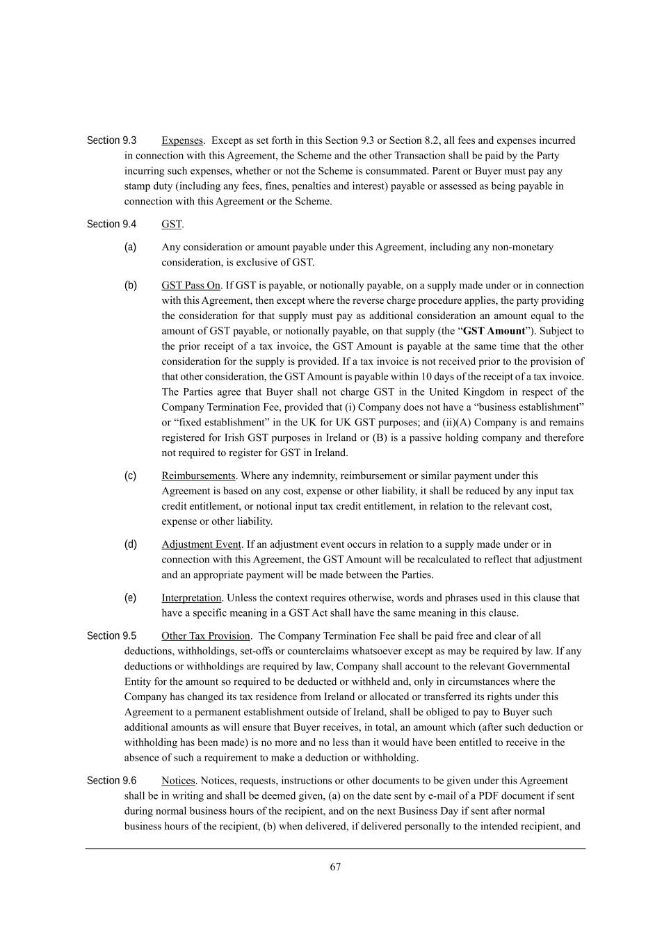 45 Section 9.3 ?nf[di[i, ?nY[fj Wi i[j \ehj^ _d j^_i M[Yj_ed 7,1 eh M[Yj_ed 6,0* Wbb \[[i WdZ [nf[di[i _dYkhh[Z _d Yedd[Yj_ed m_j^ j^_i ;]h[[c[dj* j^[ MY^[c[ WdZ j^[ ej^[h NhWdiWYj_ed i^Wbb X[ fW_Z Xo j^[ JWhjo _dYkhh_d] ikY^ [nf[di[i* m^[j^[h eh dej j^[ MY^[c[ _i YedikccWj[Z, JWh[dj eh <ko[h ckij fWo Wdo ijWcf Zkjo (_dYbkZ_d] Wdo \[[i* \_d[i* f[dWbj_[i WdZ _dj[h[ij) fWoWXb[ eh Wii[ii[Z Wi X[_d] fWoWXb[ _d Yedd[Yj_ed m_j^ j^_i ;]h[[c[dj eh j^[ MY^[c[, Section 9.4 AMN, (a) ;do Yedi_Z[hWj_ed eh Wcekdj fWoWXb[ kdZ[h j^_i ;]h[[c[dj* _dYbkZ_d] Wdo ded+ced[jWho Yedi_Z[hWj_ed* _i [nYbki_l[ e\ AMN, (b) AMN JWii Id, C\ AMN _i fWoWXb[* eh dej_edWbbo fWoWXb[* ed W ikffbo cWZ[ kdZ[h eh _d Yedd[Yj_ed m_j^ j^_i ;]h[[c[dj* j^[d [nY[fj m^[h[ j^[ h[l[hi[ Y^Wh][ fheY[Zkh[ Wffb_[i* j^[ fWhjo fhel_Z_d] j^[ Yedi_Z[hWj_ed \eh j^Wj ikffbo ckij fWo Wi WZZ_j_edWb Yedi_Z[hWj_ed Wd Wcekdj [gkWb je j^[ Wcekdj e\ AMN fWoWXb[* eh dej_edWbbo fWoWXb[* ed j^Wj ikffbo (j^[ rGST Amounts), MkX`[Yj je j^[ fh_eh h[Y[_fj e\ W jWn _dle_Y[* j^[ AMN ;cekdj _i fWoWXb[ Wj j^[ iWc[ j_c[ j^Wj j^[ ej^[h Yedi_Z[hWj_ed \eh j^[ ikffbo _i fhel_Z[Z, C\ W jWn _dle_Y[ _i dej h[Y[_l[Z fh_eh je j^[ fhel_i_ed e\ j^Wj ej^[h Yedi_Z[hWj_ed* j^[ AMN ;cekdj _i fWoWXb[ m_j^_d /. ZWoi e\ j^[ h[Y[_fj e\ W jWn _dle_Y[, N^[ JWhj_[i W]h[[ j^Wj <ko[h i^Wbb dej Y^Wh][ AMN _d j^[ Od_j[Z E_d]Zec _d h[if[Yj e\ j^[ =ecfWdo N[hc_dWj_ed @[[* fhel_Z[Z j^Wj (_) =ecfWdo Ze[i dej ^Wl[ W rXki_d[ii [ijWXb_i^c[djs eh r\_n[Z [ijWXb_i^c[djs _d j^[ OE \eh OE AMN fkhfei[i9 WdZ (__)(;) =ecfWdo _i WdZ h[cW_di h[]_ij[h[Z \eh Ch_i^ AMN fkhfei[i _d Ch[bWdZ eh (<) _i W fWii_l[ ^ebZ_d] YecfWdo WdZ j^[h[\eh[ dej h[gk_h[Z je h[]_ij[h \eh AMN _d Ch[bWdZ, (c) L[_cXkhi[c[dji, Q^[h[ Wdo _dZ[cd_jo* h[_cXkhi[c[dj eh i_c_bWh fWoc[dj kdZ[h j^_i ;]h[[c[dj _i XWi[Z ed Wdo Yeij* [nf[di[ eh ej^[h b_WX_b_jo* _j i^Wbb X[ h[ZkY[Z Xo Wdo _dfkj jWn Yh[Z_j [dj_jb[c[dj* eh dej_edWb _dfkj jWn Yh[Z_j [dj_jb[c[dj* _d h[bWj_ed je j^[ h[b[lWdj Yeij* [nf[di[ eh ej^[h b_WX_b_jo, (d) ;Z`kijc[dj ?l[dj, C\ Wd WZ`kijc[dj [l[dj eYYkhi _d h[bWj_ed je W ikffbo cWZ[ kdZ[h eh _d Yedd[Yj_ed m_j^ j^_i ;]h[[c[dj* j^[ AMN ;cekdj m_bb X[ h[YWbYkbWj[Z je h[\b[Yj j^Wj WZ`kijc[dj WdZ Wd Wffhefh_Wj[ fWoc[dj m_bb X[ cWZ[ X[jm[[d j^[ JWhj_[i, (e) Cdj[hfh[jWj_ed, Odb[ii j^[ Yedj[nj h[gk_h[i ej^[hm_i[* mehZi WdZ f^hWi[i ki[Z _d j^_i YbWki[ j^Wj ^Wl[ W if[Y_\_Y c[Wd_d] _d W AMN ;Yj i^Wbb ^Wl[ j^[ iWc[ c[Wd_d] _d j^_i YbWki[, Section 9.5 Ij^[h NWn Jhel_i_ed, N^[ =ecfWdo N[hc_dWj_ed @[[ i^Wbb X[ fW_Z \h[[ WdZ Yb[Wh e\ Wbb Z[ZkYj_edi* m_j^^ebZ_d]i* i[j+e\\i eh Yekdj[hYbW_ci m^Wjie[l[h [nY[fj Wi cWo X[ h[gk_h[Z Xo bWm, C\ Wdo Z[ZkYj_edi eh m_j^^ebZ_d]i Wh[ h[gk_h[Z Xo bWm* =ecfWdo i^Wbb WYYekdj je j^[ h[b[lWdj Ael[hdc[djWb ?dj_jo \eh j^[ Wcekdj ie h[gk_h[Z je X[ Z[ZkYj[Z eh m_j^^[bZ WdZ* edbo _d Y_hYkcijWdY[i m^[h[ j^[ =ecfWdo ^Wi Y^Wd][Z _ji jWn h[i_Z[dY[ \hec Ch[bWdZ eh WbbeYWj[Z eh jhWdi\[hh[Z _ji h_]^ji kdZ[h j^_i ;]h[[c[dj je W f[hcWd[dj [ijWXb_i^c[dj ekji_Z[ e\ Ch[bWdZ* i^Wbb X[ eXb_][Z je fWo je <ko[h ikY^ WZZ_j_edWb Wcekdji Wi m_bb [dikh[ j^Wj <ko[h h[Y[_l[i* _d jejWb* Wd Wcekdj m^_Y^ (W\j[h ikY^ Z[ZkYj_ed eh m_j^^ebZ_d] ^Wi X[[d cWZ[) _i de ceh[ WdZ de b[ii j^Wd _j mekbZ ^Wl[ X[[d [dj_jb[Z je h[Y[_l[ _d j^[ WXi[dY[ e\ ikY^ W h[gk_h[c[dj je cWa[ W Z[ZkYj_ed eh m_j^^ebZ_d], Section 9.6 Hej_Y[i, Hej_Y[i* h[gk[iji* _dijhkYj_edi eh ej^[h ZeYkc[dji je X[ ]_l[d kdZ[h j^_i ;]h[[c[dj i^Wbb X[ _d mh_j_d] WdZ i^Wbb X[ Z[[c[Z ]_l[d* (W) ed j^[ ZWj[ i[dj Xo [+cW_b e\ W J>@ ZeYkc[dj _\ i[dj Zkh_d] dehcWb Xki_d[ii ^ekhi e\ j^[ h[Y_f_[dj* WdZ ed j^[ d[nj <ki_d[ii >Wo _\ i[dj W\j[h dehcWb Xki_d[ii ^ekhi e\ j^[ h[Y_f_[dj* (X) m^[d Z[b_l[h[Z* _\ Z[b_l[h[Z f[hiedWbbo je j^[ _dj[dZ[Z h[Y_f_[dj* WdZ