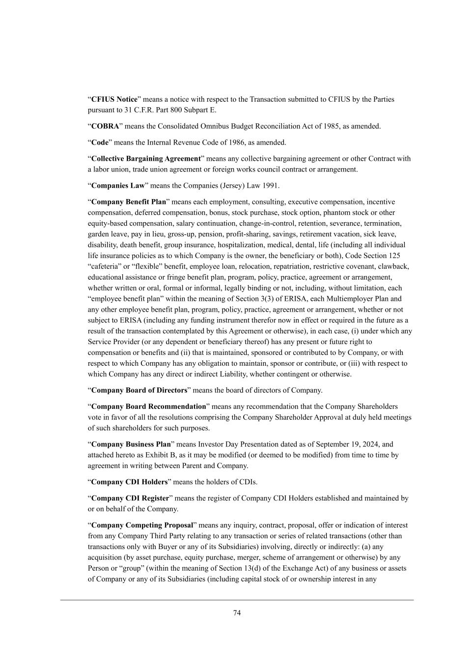 52 rCFIUS Notices c[Wdi W dej_Y[ m_j^ h[if[Yj je j^[ NhWdiWYj_ed ikXc_jj[Z je =@COM Xo j^[ JWhj_[i fkhikWdj je 1/ =,@,L, JWhj 6.. MkXfWhj ?, rCOBRAs c[Wdi j^[ =edieb_ZWj[Z Icd_Xki <kZ][j L[YedY_b_Wj_ed ;Yj e\ /763* Wi Wc[dZ[Z, rCodes c[Wdi j^[ Cdj[hdWb L[l[dk[ =eZ[ e\ /764* Wi Wc[dZ[Z, rCollective Bargaining Agreements c[Wdi Wdo Yebb[Yj_l[ XWh]W_d_d] W]h[[c[dj eh ej^[h =edjhWYj m_j^ W bWXeh kd_ed* jhWZ[ kd_ed W]h[[c[dj eh \eh[_]d mehai YekdY_b YedjhWYj eh WhhWd][c[dj, rCompanies Laws c[Wdi j^[ =ecfWd_[i (D[hi[o) FWm /77/, rCompany Benefit Plans c[Wdi [WY^ [cfbeoc[dj* Yedikbj_d]* [n[Ykj_l[ Yecf[diWj_ed* _dY[dj_l[ Yecf[diWj_ed* Z[\[hh[Z Yecf[diWj_ed* Xedki* ijeYa fkhY^Wi[* ijeYa efj_ed* f^Wdjec ijeYa eh ej^[h [gk_jo+XWi[Z Yecf[diWj_ed* iWbWho Yedj_dkWj_ed* Y^Wd][+_d+Yedjheb* h[j[dj_ed* i[l[hWdY[* j[hc_dWj_ed* ]WhZ[d b[Wl[* fWo _d b_[k* ]heii+kf* f[di_ed* fhe\_j+i^Wh_d]* iWl_d]i* h[j_h[c[dj lWYWj_ed* i_Ya b[Wl[* Z_iWX_b_jo* Z[Wj^ X[d[\_j* ]hekf _dikhWdY[* ^eif_jWb_pWj_ed* c[Z_YWb* Z[djWb* b_\[ (_dYbkZ_d] Wbb _dZ_l_ZkWb b_\[ _dikhWdY[ feb_Y_[i Wi je m^_Y^ =ecfWdo _i j^[ emd[h* j^[ X[d[\_Y_Who eh Xej^)* =eZ[ M[Yj_ed /03 rYW\[j[h_Ws eh r\b[n_Xb[s X[d[\_j* [cfbeo[[ beWd* h[beYWj_ed* h[fWjh_Wj_ed* h[ijh_Yj_l[ Yel[dWdj* YbWmXWYa* [ZkYWj_edWb Wii_ijWdY[ eh \h_d][ X[d[\_j fbWd* fhe]hWc* feb_Yo* fhWYj_Y[* W]h[[c[dj eh WhhWd][c[dj* m^[j^[h mh_jj[d eh ehWb* \ehcWb eh _d\ehcWb* b[]Wbbo X_dZ_d] eh dej* _dYbkZ_d]* m_j^ekj b_c_jWj_ed* [WY^ r[cfbeo[[ X[d[\_j fbWds m_j^_d j^[ c[Wd_d] e\ M[Yj_ed 1(1) e\ ?LCM;* [WY^ Gkbj_[cfbeo[h JbWd WdZ Wdo ej^[h [cfbeo[[ X[d[\_j fbWd* fhe]hWc* feb_Yo* fhWYj_Y[* W]h[[c[dj eh WhhWd][c[dj* m^[j^[h eh dej ikX`[Yj je ?LCM; (_dYbkZ_d] Wdo \kdZ_d] _dijhkc[dj j^[h[\eh dem _d [\\[Yj eh h[gk_h[Z _d j^[ \kjkh[ Wi W h[ikbj e\ j^[ jhWdiWYj_ed Yedj[cfbWj[Z Xo j^_i ;]h[[c[dj eh ej^[hm_i[)* _d [WY^ YWi[* (_) kdZ[h m^_Y^ Wdo M[hl_Y[ Jhel_Z[h (eh Wdo Z[f[dZ[dj eh X[d[\_Y_Who j^[h[e\) ^Wi Wdo fh[i[dj eh \kjkh[ h_]^j je Yecf[diWj_ed eh X[d[\_ji WdZ (__) j^Wj _i cW_djW_d[Z* ifedieh[Z eh Yedjh_Xkj[Z je Xo =ecfWdo* eh m_j^ h[if[Yj je m^_Y^ =ecfWdo ^Wi Wdo eXb_]Wj_ed je cW_djW_d* ifedieh eh Yedjh_Xkj[* eh (___) m_j^ h[if[Yj je m^_Y^ =ecfWdo ^Wi Wdo Z_h[Yj eh _dZ_h[Yj F_WX_b_jo* m^[j^[h Yedj_d][dj eh ej^[hm_i[, rCompany Board of Directorss c[Wdi j^[ XeWhZ e\ Z_h[Yjehi e\ =ecfWdo, rCompany Board Recommendations c[Wdi Wdo h[Yecc[dZWj_ed j^Wj j^[ =ecfWdo M^Wh[^ebZ[hi lej[ _d \Wleh e\ Wbb j^[ h[iebkj_edi Yecfh_i_d] j^[ =ecfWdo M^Wh[^ebZ[h ;ffhelWb Wj Zkbo ^[bZ c[[j_d]i e\ ikY^ i^Wh[^ebZ[hi \eh ikY^ fkhfei[i, rCompany Business Plans c[Wdi Cdl[ijeh >Wo Jh[i[djWj_ed ZWj[Z Wi e\ M[fj[cX[h /7* 0.02* WdZ WjjWY^[Z ^[h[je Wi ?n^_X_j <* Wi _j cWo X[ ceZ_\_[Z (eh Z[[c[Z je X[ ceZ_\_[Z) \hec j_c[ je j_c[ Xo W]h[[c[dj _d mh_j_d] X[jm[[d JWh[dj WdZ =ecfWdo, rCompany CDI Holderss c[Wdi j^[ ^ebZ[hi e\ =>Ci, rCompany CDI Registers c[Wdi j^[ h[]_ij[h e\ =ecfWdo =>C BebZ[hi [ijWXb_i^[Z WdZ cW_djW_d[Z Xo eh ed X[^Wb\ e\ j^[ =ecfWdo, rCompany Competing Proposals c[Wdi Wdo _dgk_ho* YedjhWYj* fhefeiWb* e\\[h eh _dZ_YWj_ed e\ _dj[h[ij \hec Wdo =ecfWdo N^_hZ JWhjo h[bWj_d] je Wdo jhWdiWYj_ed eh i[h_[i e\ h[bWj[Z jhWdiWYj_edi (ej^[h j^Wd jhWdiWYj_edi edbo m_j^ <ko[h eh Wdo e\ _ji MkXi_Z_Wh_[i) _dlebl_d]* Z_h[Yjbo eh _dZ_h[Yjbo8 (W) Wdo WYgk_i_j_ed (Xo Wii[j fkhY^Wi[* [gk_jo fkhY^Wi[* c[h][h* iY^[c[ e\ WhhWd][c[dj eh ej^[hm_i[) Xo Wdo J[hied eh r]hekfs (m_j^_d j^[ c[Wd_d] e\ M[Yj_ed /1(Z) e\ j^[ ?nY^Wd][ ;Yj) e\ Wdo Xki_d[ii eh Wii[ji e\ =ecfWdo eh Wdo e\ _ji MkXi_Z_Wh_[i (_dYbkZ_d] YWf_jWb ijeYa e\ eh emd[hi^_f _dj[h[ij _d Wdo