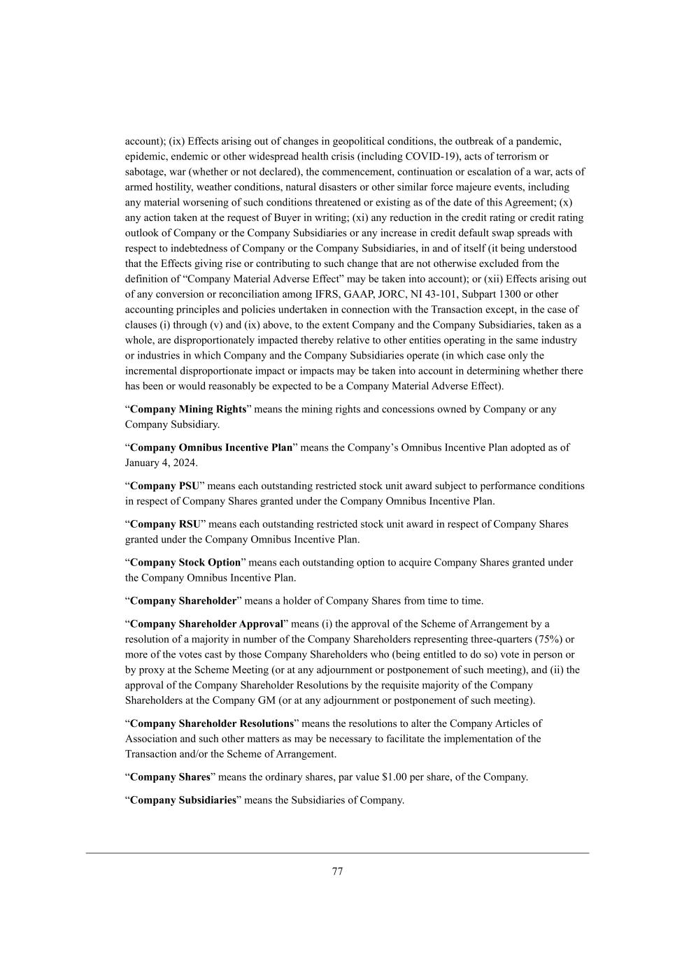 55 WYYekdj)9 (_n) ?\\[Yji Wh_i_d] ekj e\ Y^Wd][i _d ][efeb_j_YWb YedZ_j_edi* j^[ ekjXh[Wa e\ W fWdZ[c_Y* [f_Z[c_Y* [dZ[c_Y eh ej^[h m_Z[ifh[WZ ^[Wbj^ Yh_i_i (_dYbkZ_d] =IPC>+/7)* WYji e\ j[hheh_ic eh iWXejW][* mWh (m^[j^[h eh dej Z[YbWh[Z)* j^[ Yecc[dY[c[dj* Yedj_dkWj_ed eh [iYWbWj_ed e\ W mWh* WYji e\ Whc[Z ^eij_b_jo* m[Wj^[h YedZ_j_edi* dWjkhWb Z_iWij[hi eh ej^[h i_c_bWh \ehY[ cW`[kh[ [l[dji* _dYbkZ_d] Wdo cWj[h_Wb mehi[d_d] e\ ikY^ YedZ_j_edi j^h[Wj[d[Z eh [n_ij_d] Wi e\ j^[ ZWj[ e\ j^_i ;]h[[c[dj9 (n) Wdo WYj_ed jWa[d Wj j^[ h[gk[ij e\ <ko[h _d mh_j_d]9 (n_) Wdo h[ZkYj_ed _d j^[ Yh[Z_j hWj_d] eh Yh[Z_j hWj_d] ekjbeea e\ =ecfWdo eh j^[ =ecfWdo MkXi_Z_Wh_[i eh Wdo _dYh[Wi[ _d Yh[Z_j Z[\Wkbj imWf ifh[WZi m_j^ h[if[Yj je _dZ[Xj[Zd[ii e\ =ecfWdo eh j^[ =ecfWdo MkXi_Z_Wh_[i* _d WdZ e\ _ji[b\ (_j X[_d] kdZ[hijeeZ j^Wj j^[ ?\\[Yji ]_l_d] h_i[ eh Yedjh_Xkj_d] je ikY^ Y^Wd][ j^Wj Wh[ dej ej^[hm_i[ [nYbkZ[Z \hec j^[ Z[\_d_j_ed e\ r=ecfWdo GWj[h_Wb ;Zl[hi[ ?\\[Yjs cWo X[ jWa[d _dje WYYekdj)9 eh (n__) ?\\[Yji Wh_i_d] ekj e\ Wdo Yedl[hi_ed eh h[YedY_b_Wj_ed Wced] C@LM* A;;J* DIL=* HC 21+/./* MkXfWhj /1.. eh ej^[h WYYekdj_d] fh_dY_fb[i WdZ feb_Y_[i kdZ[hjWa[d _d Yedd[Yj_ed m_j^ j^[ NhWdiWYj_ed [nY[fj* _d j^[ YWi[ e\ YbWki[i (_) j^hek]^ (l) WdZ (_n) WXel[* je j^[ [nj[dj =ecfWdo WdZ j^[ =ecfWdo MkXi_Z_Wh_[i* jWa[d Wi W m^eb[* Wh[ Z_ifhefehj_edWj[bo _cfWYj[Z j^[h[Xo h[bWj_l[ je ej^[h [dj_j_[i ef[hWj_d] _d j^[ iWc[ _dZkijho eh _dZkijh_[i _d m^_Y^ =ecfWdo WdZ j^[ =ecfWdo MkXi_Z_Wh_[i ef[hWj[ (_d m^_Y^ YWi[ edbo j^[ _dYh[c[djWb Z_ifhefehj_edWj[ _cfWYj eh _cfWYji cWo X[ jWa[d _dje WYYekdj _d Z[j[hc_d_d] m^[j^[h j^[h[ ^Wi X[[d eh mekbZ h[WiedWXbo X[ [nf[Yj[Z je X[ W =ecfWdo GWj[h_Wb ;Zl[hi[ ?\\[Yj), rCompany Mining Rightss c[Wdi j^[ c_d_d] h_]^ji WdZ YedY[ii_edi emd[Z Xo =ecfWdo eh Wdo =ecfWdo MkXi_Z_Who, rCompany Omnibus Incentive Plans c[Wdi j^[ =ecfWdoui Icd_Xki CdY[dj_l[ JbWd WZefj[Z Wi e\ DWdkWho 2* 0.02, rCompany PSUs c[Wdi [WY^ ekjijWdZ_d] h[ijh_Yj[Z ijeYa kd_j WmWhZ ikX`[Yj je f[h\ehcWdY[ YedZ_j_edi _d h[if[Yj e\ =ecfWdo M^Wh[i ]hWdj[Z kdZ[h j^[ =ecfWdo Icd_Xki CdY[dj_l[ JbWd, rCompany RSUs c[Wdi [WY^ ekjijWdZ_d] h[ijh_Yj[Z ijeYa kd_j WmWhZ _d h[if[Yj e\ =ecfWdo M^Wh[i ]hWdj[Z kdZ[h j^[ =ecfWdo Icd_Xki CdY[dj_l[ JbWd, rCompany Stock Options c[Wdi [WY^ ekjijWdZ_d] efj_ed je WYgk_h[ =ecfWdo M^Wh[i ]hWdj[Z kdZ[h j^[ =ecfWdo Icd_Xki CdY[dj_l[ JbWd, rCompany Shareholders c[Wdi W ^ebZ[h e\ =ecfWdo M^Wh[i \hec j_c[ je j_c[, rCompany Shareholder Approvals c[Wdi (_) j^[ WffhelWb e\ j^[ MY^[c[ e\ ;hhWd][c[dj Xo W h[iebkj_ed e\ W cW`eh_jo _d dkcX[h e\ j^[ =ecfWdo M^Wh[^ebZ[hi h[fh[i[dj_d] j^h[[+gkWhj[hi (53%) eh ceh[ e\ j^[ lej[i YWij Xo j^ei[ =ecfWdo M^Wh[^ebZ[hi m^e (X[_d] [dj_jb[Z je Ze ie) lej[ _d f[hied eh Xo fheno Wj j^[ MY^[c[ G[[j_d] (eh Wj Wdo WZ`ekhdc[dj eh feijfed[c[dj e\ ikY^ c[[j_d])* WdZ (__) j^[ WffhelWb e\ j^[ =ecfWdo M^Wh[^ebZ[h L[iebkj_edi Xo j^[ h[gk_i_j[ cW`eh_jo e\ j^[ =ecfWdo M^Wh[^ebZ[hi Wj j^[ =ecfWdo AG (eh Wj Wdo WZ`ekhdc[dj eh feijfed[c[dj e\ ikY^ c[[j_d]), rCompany Shareholder Resolutionss c[Wdi j^[ h[iebkj_edi je Wbj[h j^[ =ecfWdo ;hj_Yb[i e\ ;iieY_Wj_ed WdZ ikY^ ej^[h cWjj[hi Wi cWo X[ d[Y[iiWho je \WY_b_jWj[ j^[ _cfb[c[djWj_ed e\ j^[ NhWdiWYj_ed WdZ-eh j^[ MY^[c[ e\ ;hhWd][c[dj, rCompany Sharess c[Wdi j^[ ehZ_dWho i^Wh[i* fWh lWbk[ $/,.. f[h i^Wh[* e\ j^[ =ecfWdo, rCompany Subsidiariess c[Wdi j^[ MkXi_Z_Wh_[i e\ =ecfWdo,