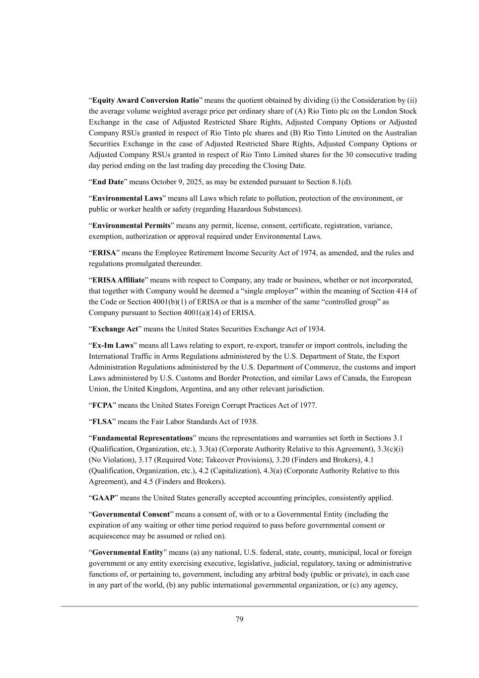 57 rEquity Award Conversion Ratios c[Wdi j^[ gkej_[dj eXjW_d[Z Xo Z_l_Z_d] (_) j^[ =edi_Z[hWj_ed Xo (__) j^[ Wl[hW][ lebkc[ m[_]^j[Z Wl[hW][ fh_Y[ f[h ehZ_dWho i^Wh[ e\ (;) L_e N_dje fbY ed j^[ FedZed MjeYa ?nY^Wd][ _d j^[ YWi[ e\ ;Z`kij[Z L[ijh_Yj[Z M^Wh[ L_]^ji* ;Z`kij[Z =ecfWdo Ifj_edi eh ;Z`kij[Z =ecfWdo LMOi ]hWdj[Z _d h[if[Yj e\ L_e N_dje fbY i^Wh[i WdZ (<) L_e N_dje F_c_j[Z ed j^[ ;kijhWb_Wd M[Ykh_j_[i ?nY^Wd][ _d j^[ YWi[ e\ ;Z`kij[Z L[ijh_Yj[Z M^Wh[ L_]^ji* ;Z`kij[Z =ecfWdo Ifj_edi eh ;Z`kij[Z =ecfWdo LMOi ]hWdj[Z _d h[if[Yj e\ L_e N_dje F_c_j[Z i^Wh[i \eh j^[ 1. Yedi[Ykj_l[ jhWZ_d] ZWo f[h_eZ [dZ_d] ed j^[ bWij jhWZ_d] ZWo fh[Y[Z_d] j^[ =bei_d] >Wj[, rEnd Dates c[Wdi IYjeX[h 7* 0.03* Wi cWo X[ [nj[dZ[Z fkhikWdj je M[Yj_ed 6,/(Z), rEnvironmental Lawss c[Wdi Wbb FWmi m^_Y^ h[bWj[ je febbkj_ed* fhej[Yj_ed e\ j^[ [dl_hedc[dj* eh fkXb_Y eh meha[h ^[Wbj^ eh iW\[jo (h[]WhZ_d] BWpWhZeki MkXijWdY[i), rEnvironmental Permitss c[Wdi Wdo f[hc_j* b_Y[di[* Yedi[dj* Y[hj_\_YWj[* h[]_ijhWj_ed* lWh_WdY[* [n[cfj_ed* Wkj^eh_pWj_ed eh WffhelWb h[gk_h[Z kdZ[h ?dl_hedc[djWb FWmi, rERISAs c[Wdi j^[ ?cfbeo[[ L[j_h[c[dj CdYec[ M[Ykh_jo ;Yj e\ /752* Wi Wc[dZ[Z* WdZ j^[ hkb[i WdZ h[]kbWj_edi fheckb]Wj[Z j^[h[kdZ[h, rERISA Affiliates c[Wdi m_j^ h[if[Yj je =ecfWdo* Wdo jhWZ[ eh Xki_d[ii* m^[j^[h eh dej _dYehfehWj[Z* j^Wj je][j^[h m_j^ =ecfWdo mekbZ X[ Z[[c[Z W ri_d]b[ [cfbeo[hs m_j^_d j^[ c[Wd_d] e\ M[Yj_ed 2/2 e\ j^[ =eZ[ eh M[Yj_ed 2../(X)(/) e\ ?LCM; eh j^Wj _i W c[cX[h e\ j^[ iWc[ rYedjhebb[Z ]hekfs Wi =ecfWdo fkhikWdj je M[Yj_ed 2../(W)(/2) e\ ?LCM;, rExchange Acts c[Wdi j^[ Od_j[Z MjWj[i M[Ykh_j_[i ?nY^Wd][ ;Yj e\ /712, rEx-Im Lawss c[Wdi Wbb FWmi h[bWj_d] je [nfehj* h[+[nfehj* jhWdi\[h eh _cfehj Yedjhebi* _dYbkZ_d] j^[ Cdj[hdWj_edWb NhW\\_Y _d ;hci L[]kbWj_edi WZc_d_ij[h[Z Xo j^[ O,M, >[fWhjc[dj e\ MjWj[* j^[ ?nfehj ;Zc_d_ijhWj_ed L[]kbWj_edi WZc_d_ij[h[Z Xo j^[ O,M, >[fWhjc[dj e\ =ecc[hY[* j^[ Ykijeci WdZ _cfehj FWmi WZc_d_ij[h[Z Xo O,M, =kijeci WdZ <ehZ[h Jhej[Yj_ed* WdZ i_c_bWh FWmi e\ =WdWZW* j^[ ?khef[Wd Od_ed* j^[ Od_j[Z E_d]Zec* ;h][dj_dW* WdZ Wdo ej^[h h[b[lWdj `kh_iZ_Yj_ed, rFCPAs c[Wdi j^[ Od_j[Z MjWj[i @eh[_]d =ehhkfj JhWYj_Y[i ;Yj e\ /755, rFLSAs c[Wdi j^[ @W_h FWXeh MjWdZWhZi ;Yj e\ /716, rFundamental Representationss c[Wdi j^[ h[fh[i[djWj_edi WdZ mWhhWdj_[i i[j \ehj^ _d M[Yj_edi 1,/ (KkWb_\_YWj_ed* Ih]Wd_pWj_ed* [jY,)* 1,1(W) (=ehfehWj[ ;kj^eh_jo L[bWj_l[ je j^_i ;]h[[c[dj)* 1,1(Y)(_) (He P_ebWj_ed)* 1,/5 (L[gk_h[Z Pej[9 NWa[el[h Jhel_i_edi)* 1,0. (@_dZ[hi WdZ <hea[hi)* 2,/ (KkWb_\_YWj_ed* Ih]Wd_pWj_ed* [jY,)* 2,0 (=Wf_jWb_pWj_ed)* 2,1(W) (=ehfehWj[ ;kj^eh_jo L[bWj_l[ je j^_i ;]h[[c[dj)* WdZ 2,3 (@_dZ[hi WdZ <hea[hi), rGAAPs c[Wdi j^[ Od_j[Z MjWj[i ][d[hWbbo WYY[fj[Z WYYekdj_d] fh_dY_fb[i* Yedi_ij[djbo Wffb_[Z, rGovernmental Consents c[Wdi W Yedi[dj e\* m_j^ eh je W Ael[hdc[djWb ?dj_jo (_dYbkZ_d] j^[ [nf_hWj_ed e\ Wdo mW_j_d] eh ej^[h j_c[ f[h_eZ h[gk_h[Z je fWii X[\eh[ ]el[hdc[djWb Yedi[dj eh WYgk_[iY[dY[ cWo X[ Wiikc[Z eh h[b_[Z ed), rGovernmental Entitys c[Wdi (W) Wdo dWj_edWb* O,M, \[Z[hWb* ijWj[* Yekdjo* ckd_Y_fWb* beYWb eh \eh[_]d ]el[hdc[dj eh Wdo [dj_jo [n[hY_i_d] [n[Ykj_l[* b[]_ibWj_l[* `kZ_Y_Wb* h[]kbWjeho* jWn_d] eh WZc_d_ijhWj_l[ \kdYj_edi e\* eh f[hjW_d_d] je* ]el[hdc[dj* _dYbkZ_d] Wdo WhX_jhWb XeZo (fkXb_Y eh fh_lWj[)* _d [WY^ YWi[ _d Wdo fWhj e\ j^[ mehbZ* (X) Wdo fkXb_Y _dj[hdWj_edWb ]el[hdc[djWb eh]Wd_pWj_ed* eh (Y) Wdo W][dYo*
