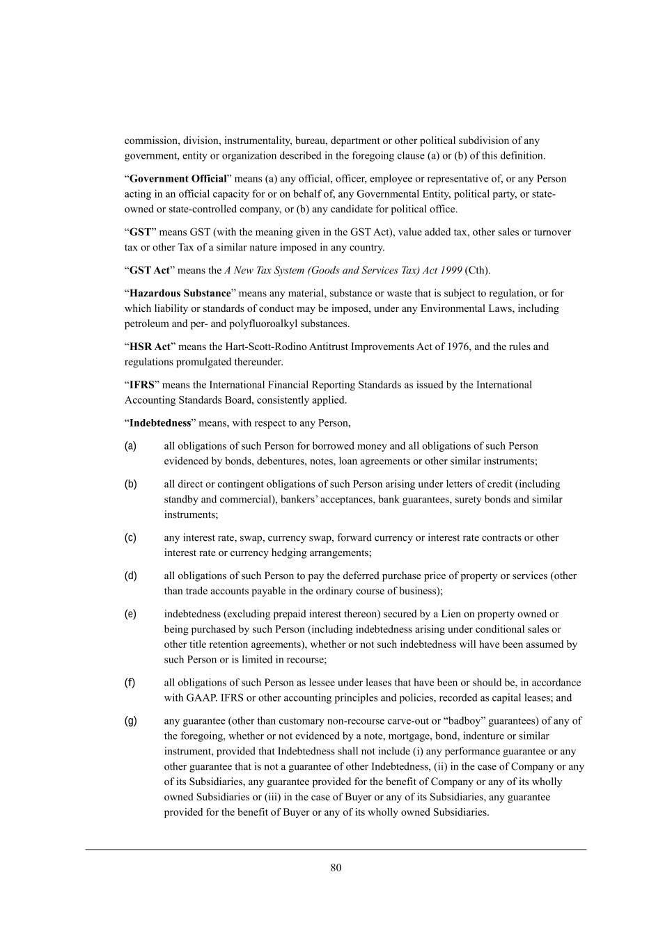 6. Yecc_ii_ed* Z_l_i_ed* _dijhkc[djWb_jo* Xkh[Wk* Z[fWhjc[dj eh ej^[h feb_j_YWb ikXZ_l_i_ed e\ Wdo ]el[hdc[dj* [dj_jo eh eh]Wd_pWj_ed Z[iYh_X[Z _d j^[ \eh[]e_d] YbWki[ (W) eh (X) e\ j^_i Z[\_d_j_ed, rGovernment Officials c[Wdi (W) Wdo e\\_Y_Wb* e\\_Y[h* [cfbeo[[ eh h[fh[i[djWj_l[ e\* eh Wdo J[hied WYj_d] _d Wd e\\_Y_Wb YWfWY_jo \eh eh ed X[^Wb\ e\* Wdo Ael[hdc[djWb ?dj_jo* feb_j_YWb fWhjo* eh ijWj[+ emd[Z eh ijWj[+Yedjhebb[Z YecfWdo* eh (X) Wdo YWdZ_ZWj[ \eh feb_j_YWb e\\_Y[, rGSTs c[Wdi AMN (m_j^ j^[ c[Wd_d] ]_l[d _d j^[ AMN ;Yj)* lWbk[ WZZ[Z jWn* ej^[h iWb[i eh jkhdel[h jWn eh ej^[h NWn e\ W i_c_bWh dWjkh[ _cfei[Z _d Wdo Yekdjho, rGST Acts c[Wdi j^[ A New Tax System (Goods and Services Tax) Act 1999 (=j^), rHazardous Substances c[Wdi Wdo cWj[h_Wb* ikXijWdY[ eh mWij[ j^Wj _i ikX`[Yj je h[]kbWj_ed* eh \eh m^_Y^ b_WX_b_jo eh ijWdZWhZi e\ YedZkYj cWo X[ _cfei[Z* kdZ[h Wdo ?dl_hedc[djWb FWmi* _dYbkZ_d] f[jheb[kc WdZ f[h+ WdZ febo\bkeheWbaob ikXijWdY[i, rHSR Acts c[Wdi j^[ BWhj+MYejj+LeZ_de ;dj_jhkij Ccfhel[c[dji ;Yj e\ /754* WdZ j^[ hkb[i WdZ h[]kbWj_edi fheckb]Wj[Z j^[h[kdZ[h, rIFRSs c[Wdi j^[ Cdj[hdWj_edWb @_dWdY_Wb L[fehj_d] MjWdZWhZi Wi _iik[Z Xo j^[ Cdj[hdWj_edWb ;YYekdj_d] MjWdZWhZi <eWhZ* Yedi_ij[djbo Wffb_[Z, rIndebtednesss c[Wdi* m_j^ h[if[Yj je Wdo J[hied* (a) Wbb eXb_]Wj_edi e\ ikY^ J[hied \eh Xehhem[Z ced[o WdZ Wbb eXb_]Wj_edi e\ ikY^ J[hied [l_Z[dY[Z Xo XedZi* Z[X[djkh[i* dej[i* beWd W]h[[c[dji eh ej^[h i_c_bWh _dijhkc[dji9 (b) Wbb Z_h[Yj eh Yedj_d][dj eXb_]Wj_edi e\ ikY^ J[hied Wh_i_d] kdZ[h b[jj[hi e\ Yh[Z_j (_dYbkZ_d] ijWdZXo WdZ Yecc[hY_Wb)* XWda[hiu WYY[fjWdY[i* XWda ]kWhWdj[[i* ikh[jo XedZi WdZ i_c_bWh _dijhkc[dji9 (c) Wdo _dj[h[ij hWj[* imWf* Ykhh[dYo imWf* \ehmWhZ Ykhh[dYo eh _dj[h[ij hWj[ YedjhWYji eh ej^[h _dj[h[ij hWj[ eh Ykhh[dYo ^[Z]_d] WhhWd][c[dji9 (d) Wbb eXb_]Wj_edi e\ ikY^ J[hied je fWo j^[ Z[\[hh[Z fkhY^Wi[ fh_Y[ e\ fhef[hjo eh i[hl_Y[i (ej^[h j^Wd jhWZ[ WYYekdji fWoWXb[ _d j^[ ehZ_dWho Yekhi[ e\ Xki_d[ii)9 (e) _dZ[Xj[Zd[ii ([nYbkZ_d] fh[fW_Z _dj[h[ij j^[h[ed) i[Ykh[Z Xo W F_[d ed fhef[hjo emd[Z eh X[_d] fkhY^Wi[Z Xo ikY^ J[hied (_dYbkZ_d] _dZ[Xj[Zd[ii Wh_i_d] kdZ[h YedZ_j_edWb iWb[i eh ej^[h j_jb[ h[j[dj_ed W]h[[c[dji)* m^[j^[h eh dej ikY^ _dZ[Xj[Zd[ii m_bb ^Wl[ X[[d Wiikc[Z Xo ikY^ J[hied eh _i b_c_j[Z _d h[Yekhi[9 (f) Wbb eXb_]Wj_edi e\ ikY^ J[hied Wi b[ii[[ kdZ[h b[Wi[i j^Wj ^Wl[ X[[d eh i^ekbZ X[* _d WYYehZWdY[ m_j^ A;;J, C@LM eh ej^[h WYYekdj_d] fh_dY_fb[i WdZ feb_Y_[i* h[YehZ[Z Wi YWf_jWb b[Wi[i9 WdZ (g) Wdo ]kWhWdj[[ (ej^[h j^Wd YkijecWho ded+h[Yekhi[ YWhl[+ekj eh rXWZXeos ]kWhWdj[[i) e\ Wdo e\ j^[ \eh[]e_d]* m^[j^[h eh dej [l_Z[dY[Z Xo W dej[* cehj]W][* XedZ* _dZ[djkh[ eh i_c_bWh _dijhkc[dj* fhel_Z[Z j^Wj CdZ[Xj[Zd[ii i^Wbb dej _dYbkZ[ (_) Wdo f[h\ehcWdY[ ]kWhWdj[[ eh Wdo ej^[h ]kWhWdj[[ j^Wj _i dej W ]kWhWdj[[ e\ ej^[h CdZ[Xj[Zd[ii* (__) _d j^[ YWi[ e\ =ecfWdo eh Wdo e\ _ji MkXi_Z_Wh_[i* Wdo ]kWhWdj[[ fhel_Z[Z \eh j^[ X[d[\_j e\ =ecfWdo eh Wdo e\ _ji m^ebbo emd[Z MkXi_Z_Wh_[i eh (___) _d j^[ YWi[ e\ <ko[h eh Wdo e\ _ji MkXi_Z_Wh_[i* Wdo ]kWhWdj[[ fhel_Z[Z \eh j^[ X[d[\_j e\ <ko[h eh Wdo e\ _ji m^ebbo emd[Z MkXi_Z_Wh_[i,