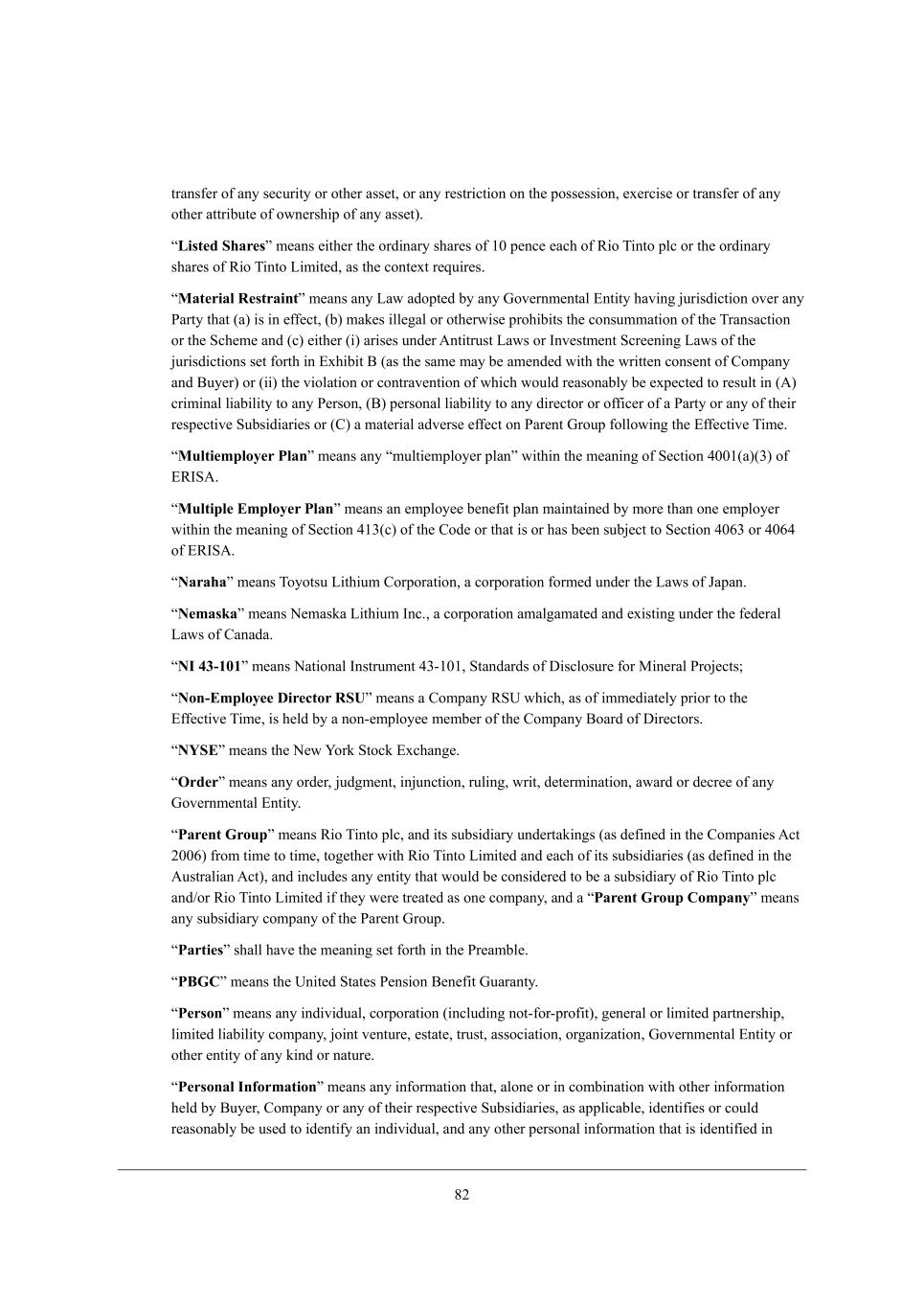 60 jhWdi\[h e\ Wdo i[Ykh_jo eh ej^[h Wii[j* eh Wdo h[ijh_Yj_ed ed j^[ feii[ii_ed* [n[hY_i[ eh jhWdi\[h e\ Wdo ej^[h Wjjh_Xkj[ e\ emd[hi^_f e\ Wdo Wii[j), rListed Sharess c[Wdi [_j^[h j^[ ehZ_dWho i^Wh[i e\ /. f[dY[ [WY^ e\ L_e N_dje fbY eh j^[ ehZ_dWho i^Wh[i e\ L_e N_dje F_c_j[Z* Wi j^[ Yedj[nj h[gk_h[i, rMaterial Restraints c[Wdi Wdo FWm WZefj[Z Xo Wdo Ael[hdc[djWb ?dj_jo ^Wl_d] `kh_iZ_Yj_ed el[h Wdo JWhjo j^Wj (W) _i _d [\\[Yj* (X) cWa[i _bb[]Wb eh ej^[hm_i[ fhe^_X_ji j^[ YedikccWj_ed e\ j^[ NhWdiWYj_ed eh j^[ MY^[c[ WdZ (Y) [_j^[h (_) Wh_i[i kdZ[h ;dj_jhkij FWmi eh Cdl[ijc[dj MYh[[d_d] FWmi e\ j^[ `kh_iZ_Yj_edi i[j \ehj^ _d ?n^_X_j < (Wi j^[ iWc[ cWo X[ Wc[dZ[Z m_j^ j^[ mh_jj[d Yedi[dj e\ =ecfWdo WdZ <ko[h) eh (__) j^[ l_ebWj_ed eh YedjhWl[dj_ed e\ m^_Y^ mekbZ h[WiedWXbo X[ [nf[Yj[Z je h[ikbj _d (;) Yh_c_dWb b_WX_b_jo je Wdo J[hied* (<) f[hiedWb b_WX_b_jo je Wdo Z_h[Yjeh eh e\\_Y[h e\ W JWhjo eh Wdo e\ j^[_h h[if[Yj_l[ MkXi_Z_Wh_[i eh (=) W cWj[h_Wb WZl[hi[ [\\[Yj ed JWh[dj Ahekf \ebbem_d] j^[ ?\\[Yj_l[ N_c[, rMultiemployer Plans c[Wdi Wdo rckbj_[cfbeo[h fbWds m_j^_d j^[ c[Wd_d] e\ M[Yj_ed 2../(W)(1) e\ ?LCM;, rMultiple Employer Plans c[Wdi Wd [cfbeo[[ X[d[\_j fbWd cW_djW_d[Z Xo ceh[ j^Wd ed[ [cfbeo[h m_j^_d j^[ c[Wd_d] e\ M[Yj_ed 2/1(Y) e\ j^[ =eZ[ eh j^Wj _i eh ^Wi X[[d ikX`[Yj je M[Yj_ed 2.41 eh 2.42 e\ ?LCM;, rNarahas c[Wdi Neoejik F_j^_kc =ehfehWj_ed* W YehfehWj_ed \ehc[Z kdZ[h j^[ FWmi e\ DWfWd, rNemaskas c[Wdi H[cWiaW F_j^_kc CdY,* W YehfehWj_ed WcWb]WcWj[Z WdZ [n_ij_d] kdZ[h j^[ \[Z[hWb FWmi e\ =WdWZW, rNI 43-101s c[Wdi HWj_edWb Cdijhkc[dj 21+/./* MjWdZWhZi e\ >_iYbeikh[ \eh G_d[hWb Jhe`[Yji9 rNon-Employee Director RSUs c[Wdi W =ecfWdo LMO m^_Y^* Wi e\ _cc[Z_Wj[bo fh_eh je j^[ ?\\[Yj_l[ N_c[* _i ^[bZ Xo W ded+[cfbeo[[ c[cX[h e\ j^[ =ecfWdo <eWhZ e\ >_h[Yjehi, rNYSEs c[Wdi j^[ H[m Seha MjeYa ?nY^Wd][, rOrders c[Wdi Wdo ehZ[h* `kZ]c[dj* _d`kdYj_ed* hkb_d]* mh_j* Z[j[hc_dWj_ed* WmWhZ eh Z[Yh[[ e\ Wdo Ael[hdc[djWb ?dj_jo, rParent Groups c[Wdi L_e N_dje fbY* WdZ _ji ikXi_Z_Who kdZ[hjWa_d]i (Wi Z[\_d[Z _d j^[ =ecfWd_[i ;Yj 0..4) \hec j_c[ je j_c[* je][j^[h m_j^ L_e N_dje F_c_j[Z WdZ [WY^ e\ _ji ikXi_Z_Wh_[i (Wi Z[\_d[Z _d j^[ ;kijhWb_Wd ;Yj)* WdZ _dYbkZ[i Wdo [dj_jo j^Wj mekbZ X[ Yedi_Z[h[Z je X[ W ikXi_Z_Who e\ L_e N_dje fbY WdZ-eh L_e N_dje F_c_j[Z _\ j^[o m[h[ jh[Wj[Z Wi ed[ YecfWdo* WdZ W rParent Group Companys c[Wdi Wdo ikXi_Z_Who YecfWdo e\ j^[ JWh[dj Ahekf, rPartiess i^Wbb ^Wl[ j^[ c[Wd_d] i[j \ehj^ _d j^[ Jh[WcXb[, rPBGCs c[Wdi j^[ Od_j[Z MjWj[i J[di_ed <[d[\_j AkWhWdjo, rPersons c[Wdi Wdo _dZ_l_ZkWb* YehfehWj_ed (_dYbkZ_d] dej+\eh+fhe\_j)* ][d[hWb eh b_c_j[Z fWhjd[hi^_f* b_c_j[Z b_WX_b_jo YecfWdo* `e_dj l[djkh[* [ijWj[* jhkij* WiieY_Wj_ed* eh]Wd_pWj_ed* Ael[hdc[djWb ?dj_jo eh ej^[h [dj_jo e\ Wdo a_dZ eh dWjkh[, rPersonal Informations c[Wdi Wdo _d\ehcWj_ed j^Wj* Wbed[ eh _d YecX_dWj_ed m_j^ ej^[h _d\ehcWj_ed ^[bZ Xo <ko[h* =ecfWdo eh Wdo e\ j^[_h h[if[Yj_l[ MkXi_Z_Wh_[i* Wi Wffb_YWXb[* _Z[dj_\_[i eh YekbZ h[WiedWXbo X[ ki[Z je _Z[dj_\o Wd _dZ_l_ZkWb* WdZ Wdo ej^[h f[hiedWb _d\ehcWj_ed j^Wj _i _Z[dj_\_[Z _d