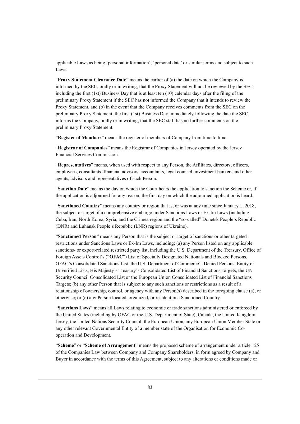 61 Wffb_YWXb[ FWmi Wi X[_d] tf[hiedWb _d\ehcWj_edu* tf[hiedWb ZWjWu eh i_c_bWh j[hci WdZ ikX`[Yj je ikY^ FWmi, rProxy Statement Clearance Dates c[Wdi j^[ [Whb_[h e\ (W) j^[ ZWj[ ed m^_Y^ j^[ =ecfWdo _i _d\ehc[Z Xo j^[ M?=* ehWbbo eh _d mh_j_d]* j^Wj j^[ Jheno MjWj[c[dj m_bb dej X[ h[l_[m[Z Xo j^[ M?=* _dYbkZ_d] j^[ \_hij (/ij) <ki_d[ii >Wo j^Wj _i Wj b[Wij j[d (/.) YWb[dZWh ZWoi W\j[h j^[ \_b_d] e\ j^[ fh[b_c_dWho Jheno MjWj[c[dj _\ j^[ M?= ^Wi dej _d\ehc[Z j^[ =ecfWdo j^Wj _j _dj[dZi je h[l_[m j^[ Jheno MjWj[c[dj* WdZ (X) _d j^[ [l[dj j^Wj j^[ =ecfWdo h[Y[_l[i Yecc[dji \hec j^[ M?= ed j^[ fh[b_c_dWho Jheno MjWj[c[dj* j^[ \_hij (/ij) <ki_d[ii >Wo _cc[Z_Wj[bo \ebbem_d] j^[ ZWj[ j^[ M?= _d\ehci j^[ =ecfWdo* ehWbbo eh _d mh_j_d]* j^Wj j^[ M?= ijW\\ ^Wi de \khj^[h Yecc[dji ed j^[ fh[b_c_dWho Jheno MjWj[c[dj, rRegister of Memberss c[Wdi j^[ h[]_ij[h e\ c[cX[hi e\ =ecfWdo \hec j_c[ je j_c[, rRegistrar of Companiess c[Wdi j^[ L[]_ijhWh e\ =ecfWd_[i _d D[hi[o ef[hWj[Z Xo j^[ D[hi[o @_dWdY_Wb M[hl_Y[i =ecc_ii_ed, rRepresentativess c[Wdi* m^[d ki[Z m_j^ h[if[Yj je Wdo J[hied* j^[ ;\\_b_Wj[i* Z_h[Yjehi* e\\_Y[hi* [cfbeo[[i* YedikbjWdji* \_dWdY_Wb WZl_iehi* WYYekdjWdji* b[]Wb Yekdi[b* _dl[ijc[dj XWda[hi WdZ ej^[h W][dji* WZl_iehi WdZ h[fh[i[djWj_l[i e\ ikY^ J[hied, rSanction Dates c[Wdi j^[ ZWo ed m^_Y^ j^[ =ekhj ^[Whi j^[ Wffb_YWj_ed je iWdYj_ed j^[ MY^[c[ eh* _\ j^[ Wffb_YWj_ed _i WZ`ekhd[Z \eh Wdo h[Wied* j^[ \_hij ZWo ed m^_Y^ j^[ WZ`ekhd[Z Wffb_YWj_ed _i ^[WhZ, rSanctioned Countrys c[Wdi Wdo Yekdjho eh h[]_ed j^Wj _i* eh mWi Wj Wdo j_c[ i_dY[ DWdkWho /* 0./6* j^[ ikX`[Yj eh jWh][j e\ W Yecfh[^[di_l[ [cXWh]e kdZ[h MWdYj_edi FWmi eh ?n+Cc FWmi (_dYbkZ_d] =kXW* ChWd* Hehj^ Eeh[W* Moh_W* WdZ j^[ =h_c[W h[]_ed WdZ j^[ rie+YWbb[Zs >ed[jia J[efb[ui L[fkXb_Y (>HL) WdZ Fk^Wdia J[efb[ui L[fkXb_Y (FHL) h[]_edi e\ OahW_d[), rSanctioned Persons c[Wdi Wdo J[hied j^Wj _i j^[ ikX`[Yj eh jWh][j e\ iWdYj_edi eh ej^[h jWh][j[Z h[ijh_Yj_edi kdZ[h MWdYj_edi FWmi eh ?n+Cc FWmi* _dYbkZ_d]8 (W) Wdo J[hied b_ij[Z ed Wdo Wffb_YWXb[ iWdYj_edi+ eh [nfehj+h[bWj[Z h[ijh_Yj[Z fWhjo b_ij* _dYbkZ_d] j^[ O,M, >[fWhjc[dj e\ j^[ Nh[Wikho* I\\_Y[ e\ @eh[_]d ;ii[ji =edjhebui (rOFACs) F_ij e\ Mf[Y_Wbbo >[i_]dWj[Z HWj_edWbi WdZ <beYa[Z J[hiedi* I@;=ui =edieb_ZWj[Z MWdYj_edi F_ij* j^[ O,M, >[fWhjc[dj e\ =ecc[hY[ui >[d_[Z J[hiedi* ?dj_jo eh Odl[h_\_[Z F_iji* B_i GW`[ijoui Nh[Wikhoui =edieb_ZWj[Z F_ij e\ @_dWdY_Wb MWdYj_edi NWh][ji* j^[ OH M[Ykh_jo =ekdY_b =edieb_ZWj[Z F_ij eh j^[ ?khef[Wd Od_ed =edieb_ZWj[Z F_ij e\ @_dWdY_Wb MWdYj_edi NWh][ji9 (X) Wdo ej^[h J[hied j^Wj _i ikX`[Yj je Wdo ikY^ iWdYj_edi eh h[ijh_Yj_edi Wi W h[ikbj e\ W h[bWj_edi^_f e\ emd[hi^_f* Yedjheb* eh W][dYo m_j^ Wdo J[hied(i) Z[iYh_X[Z _d j^[ \eh[]e_d] YbWki[ (W)* eh ej^[hm_i[9 eh (Y) Wdo J[hied beYWj[Z* eh]Wd_p[Z* eh h[i_Z[dj _d W MWdYj_ed[Z =ekdjho, rSanctions Lawss c[Wdi Wbb FWmi h[bWj_d] je [Yedec_Y eh jhWZ[ iWdYj_edi WZc_d_ij[h[Z eh [d\ehY[Z Xo j^[ Od_j[Z MjWj[i (_dYbkZ_d] Xo I@;= eh j^[ O,M, >[fWhjc[dj e\ MjWj[)* =WdWZW* j^[ Od_j[Z E_d]Zec* D[hi[o* j^[ Od_j[Z HWj_edi M[Ykh_jo =ekdY_b* j^[ ?khef[Wd Od_ed* Wdo ?khef[Wd Od_ed G[cX[h MjWj[ eh Wdo ej^[h h[b[lWdj Ael[hdc[djWb ?dj_jo e\ W c[cX[h ijWj[ e\ j^[ Ih]Wd_iWj_ed \eh ?Yedec_Y =e+ ef[hWj_ed WdZ >[l[befc[dj, rSchemes eh rScheme of Arrangements c[Wdi j^[ fhefei[Z iY^[c[ e\ WhhWd][c[dj kdZ[h Whj_Yb[ /03 e\ j^[ =ecfWd_[i FWm X[jm[[d =ecfWdo WdZ =ecfWdo M^Wh[^ebZ[hi* _d \ehc W]h[[Z Xo =ecfWdo WdZ <ko[h _d WYYehZWdY[ m_j^ j^[ j[hci e\ j^_i ;]h[[c[dj* ikX`[Yj je Wdo Wbj[hWj_edi eh YedZ_j_edi cWZ[ eh