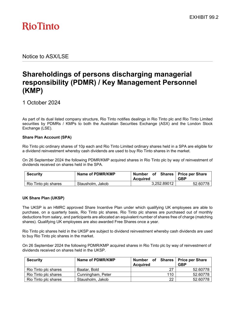 Notice to ASX/LSE Shareholdings of persons discharging managerial responsibility (PDMR) / Key Management Personnel (KMP) 1 October 2024 As part of its dual listed company structure, Rio Tinto notifies dealings in Rio Tinto plc and Rio Tinto Limited securities by PDMRs / KMPs to both the Australian Securities Exchange (ASX) and the London Stock Exchange (LSE). Share Plan Account (SPA) Rio Tinto plc ordinary shares of 10p each and Rio Tinto Limited ordinary shares held in a SPA are eligible for a dividend reinvestment whereby cash dividends are used to buy Rio Tinto shares in the market. On 26 September 2024 the following PDMR/KMP acquired shares in Rio Tinto plc by way of reinvestment of dividends received on shares held in the SPA. Security Name of PDMR/KMP Number of Shares Acquired Price per Share GBP Rio Tinto plc shares Stausholm, Jakob 3,252.89012 52.60778 UK Share Plan (UKSP) The UKSP is an HMRC approved Share Incentive Plan under which qualifying UK employees are able to purchase, on a quarterly basis, Rio Tinto plc shares. Rio Tinto plc shares are purchased out of monthly deductions from salary, and participants are allocated an equivalent number of shares free of charge (matching shares). Qualifying UK employees are also awarded Free Shares once a year. Rio Tinto plc shares held in the UKSP are subject to dividend reinvestment whereby cash dividends are used to buy Rio Tinto plc shares in the market. On 26 September 2024 the following PDMR/KMP acquired shares in Rio Tinto plc by way of reinvestment of dividends received on shares held in the UKSP. Security Name of PDMR/KMP Number of Shares Acquired Price per Share GBP Rio Tinto plc shares Baatar, Bold 27 52.60778 Rio Tinto plc shares Cunningham, Peter 110 52.60778 Rio Tinto plc shares Stausholm, Jakob 22 52.60778 EXHIBIT 99.2