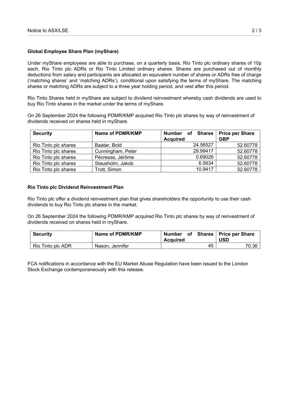 Notice to ASX/LSE 2 / 3 Global Employee Share Plan (myShare) Under myShare employees are able to purchase, on a quarterly basis, Rio Tinto plc ordinary shares of 10p each, Rio Tinto plc ADRs or Rio Tinto Limited ordinary shares. Shares are purchased out of monthly deductions from salary and participants are allocated an equivalent number of shares or ADRs free of charge (‘matching shares’ and ‘matching ADRs’), conditional upon satisfying the terms of myShare. The matching shares or matching ADRs are subject to a three year holding period, and vest after this period. Rio Tinto Shares held in myShare are subject to dividend reinvestment whereby cash dividends are used to buy Rio Tinto shares in the market under the terms of myShare. On 26 September 2024 the following PDMR/KMP acquired Rio Tinto plc shares by way of reinvestment of dividends received on shares held in myShare. Security Name of PDMR/KMP Number of Shares Acquired Price per Share GBP Rio Tinto plc shares Baatar, Bold 24.56527 52.60778 Rio Tinto plc shares Cunningham, Peter 29.99417 52.60778 Rio Tinto plc shares Pécresse, Jérôme 0.69026 52.60778 Rio Tinto plc shares Stausholm, Jakob 6.5634 52.60778 Rio Tinto plc shares Trott, Simon 10.9417 52.60778 Rio Tinto plc Dividend Reinvestment Plan Rio Tinto plc offer a dividend reinvestment plan that gives shareholders the opportunity to use their cash dividends to buy Rio Tinto plc shares in the market. On 26 September 2024 the following PDMR/KMP acquired Rio Tinto plc shares by way of reinvestment of dividends received on shares held in myShare. Security Name of PDMR/KMP Number of Shares Acquired Price per Share USD Rio Tinto plc ADR Nason, Jennifer 45 70.36 FCA notifications in accordance with the EU Market Abuse Regulation have been issued to the London Stock Exchange contemporaneously with this release.