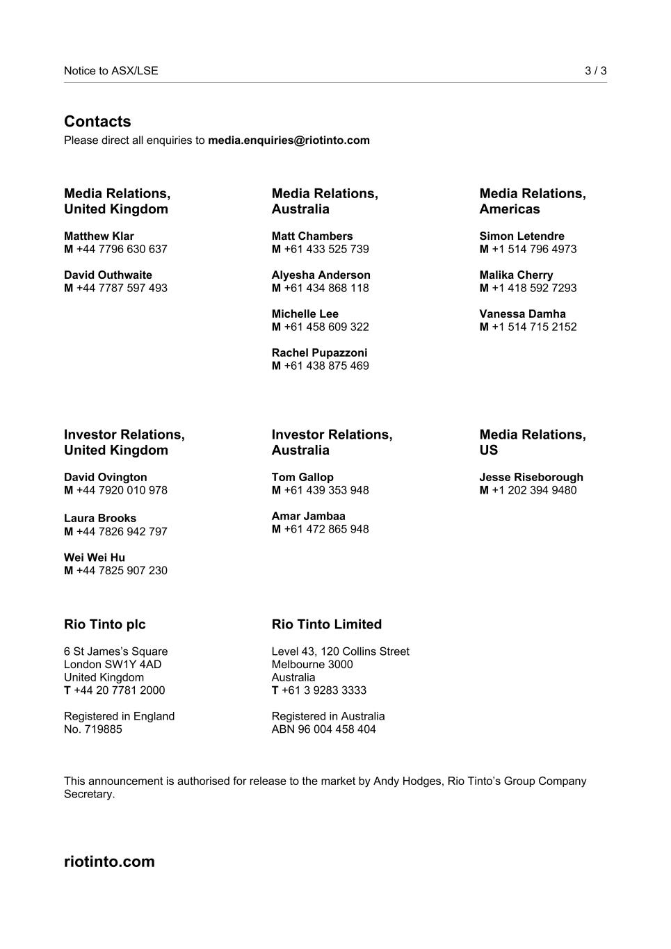Notice to ASX/LSE 3 / 3 Contacts Please direct all enquiries to media.enquiries@riotinto.com Media Relations, United Kingdom Matthew Klar M +44 7796 630 637 David Outhwaite M +44 7787 597 493 Media Relations, Australia Matt Chambers M +61 433 525 739 Alyesha Anderson M +61 434 868 118 Michelle Lee M +61 458 609 322 Rachel Pupazzoni M +61 438 875 469 Media Relations, Americas Simon Letendre M +1 514 796 4973 Malika Cherry M +1 418 592 7293 Vanessa Damha M +1 514 715 2152 Investor Relations, United Kingdom David Ovington M +44 7920 010 978 Laura Brooks M +44 7826 942 797 Wei Wei Hu M +44 7825 907 230 Investor Relations, Australia Tom Gallop M +61 439 353 948 Amar Jambaa M +61 472 865 948 Media Relations, US Jesse Riseborough M +1 202 394 9480 Rio Tinto plc 6 St James’s Square London SW1Y 4AD United Kingdom T +44 20 7781 2000 Registered in England No. 719885 Rio Tinto Limited Level 43, 120 Collins Street Melbourne 3000 Australia T +61 3 9283 3333 Registered in Australia ABN 96 004 458 404 This announcement is authorised for release to the market by Andy Hodges, Rio Tinto’s Group Company Secretary. riotinto.com