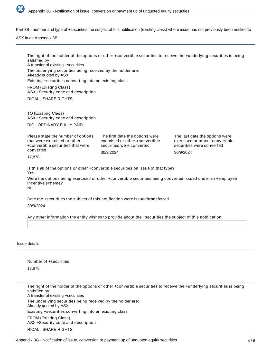 Appendix 3G - Notification of issue, conversion or payment up of unquoted equity securities Appendix 3G - Notification of issue, conversion or payment up of unquoted equity securities 4 / 6 Part 3B - number and type of +securities the subject of this notification (existing class) where issue has not previously been notified to ASX in an Appendix 3B The right of the holder of the options or other +convertible securities to receive the +underlying securities is being satisfied by: The underlying securities being received by the holder are: Existing +securities converting into an existing class FROM (Existing Class) ASX +Security code and description RIOAL : SHARE RIGHTS TO (Existing Class) ASX +Security code and description RIO : ORDINARY FULLY PAID Please state the number of options that were exercised or other +convertible securities that were converted 17,878 The first date the options were exercised or other +convertible securities were converted 30/9/2024 The last date the options were exercised or other +convertible securities were converted 30/9/2024 Is this all of the options or other +convertible securities on issue of that type? Were the options being exercised or other +convertible securities being converted issued under an +employee incentive scheme? Date the +securities the subject of this notification were issued/transferred 30/9/2024 Any other information the entity wishes to provide about the +securities the subject of this notification Issue details Number of +securities 17,878 The right of the holder of the options or other +convertible securities to receive the +underlying securities is being satisfied by: The underlying securities being received by the holder are: Existing +securities converting into an existing class FROM (Existing Class) ASX +Security code and description RIOAL : SHARE RIGHTS Already quoted by ASX A transfer of existing +securities No Yes Already quoted by ASX A transfer of existing +securities