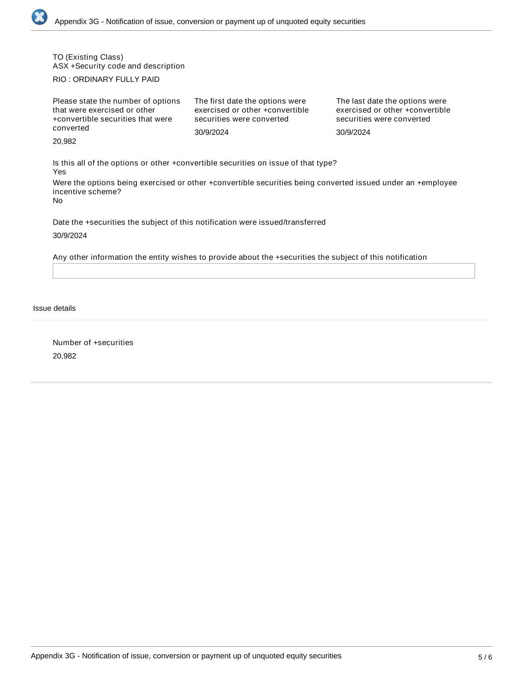 Appendix 3G - Notification of issue, conversion or payment up of unquoted equity securities Appendix 3G - Notification of issue, conversion or payment up of unquoted equity securities 5 / 6 TO (Existing Class) ASX +Security code and description RIO : ORDINARY FULLY PAID Please state the number of options that were exercised or other +convertible securities that were converted 20,982 The first date the options were exercised or other +convertible securities were converted 30/9/2024 The last date the options were exercised or other +convertible securities were converted 30/9/2024 Is this all of the options or other +convertible securities on issue of that type? Were the options being exercised or other +convertible securities being converted issued under an +employee incentive scheme? Date the +securities the subject of this notification were issued/transferred 30/9/2024 Any other information the entity wishes to provide about the +securities the subject of this notification Issue details Number of +securities 20,982 No Yes