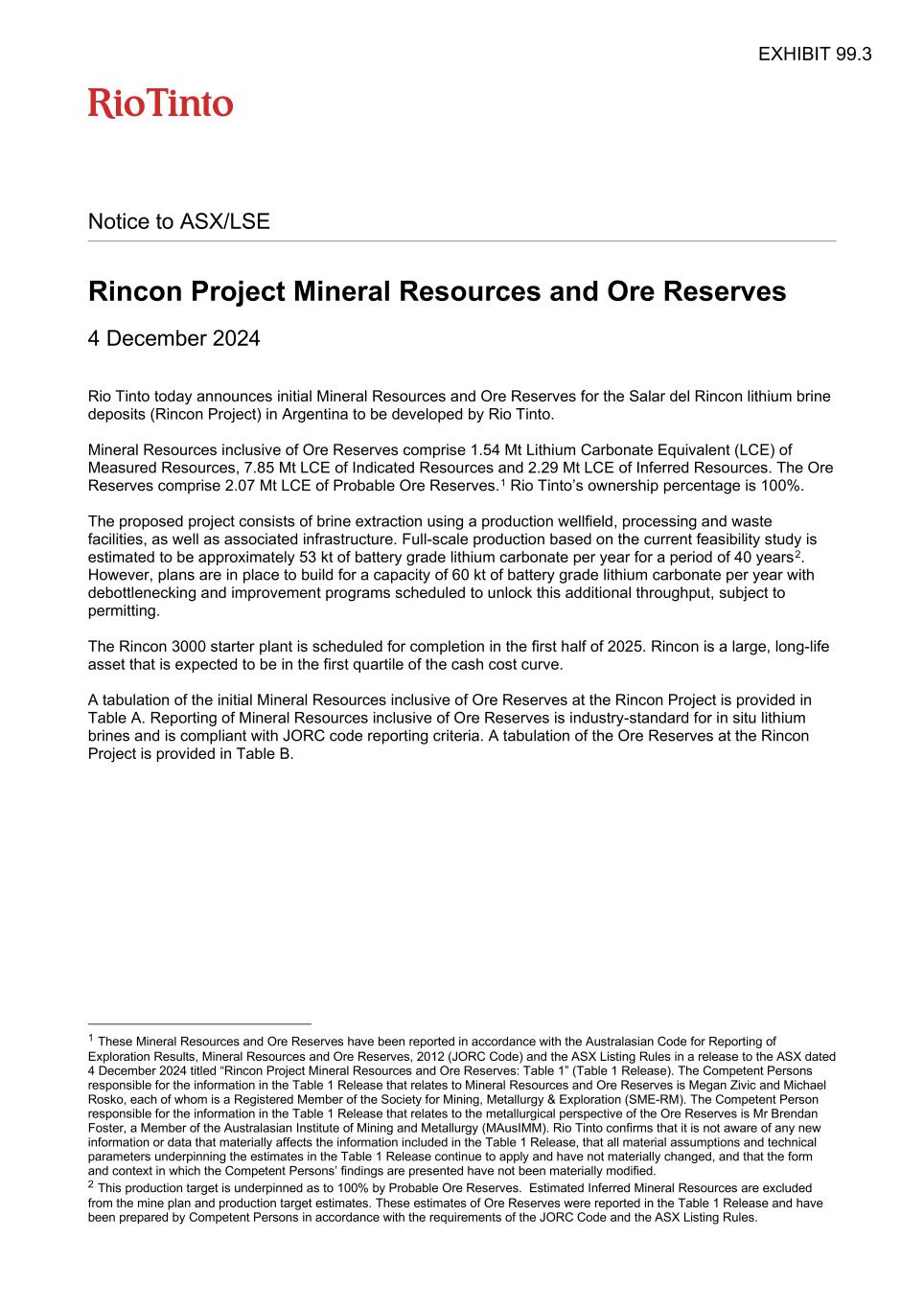 Notice to ASX/LSE Rincon Project Mineral Resources and Ore Reserves 4 December 2024 Rio Tinto today announces initial Mineral Resources and Ore Reserves for the Salar del Rincon lithium brine deposits (Rincon Project) in Argentina to be developed by Rio Tinto. Mineral Resources inclusive of Ore Reserves comprise 1.54 Mt Lithium Carbonate Equivalent (LCE) of Measured Resources, 7.85 Mt LCE of Indicated Resources and 2.29 Mt LCE of Inferred Resources. The Ore Reserves comprise 2.07 Mt LCE of Probable Ore Reserves.1 Rio Tinto’s ownership percentage is 100%. The proposed project consists of brine extraction using a production wellfield, processing and waste facilities, as well as associated infrastructure. Full-scale production based on the current feasibility study is estimated to be approximately 53 kt of battery grade lithium carbonate per year for a period of 40 years2. However, plans are in place to build for a capacity of 60 kt of battery grade lithium carbonate per year with debottlenecking and improvement programs scheduled to unlock this additional throughput, subject to permitting. The Rincon 3000 starter plant is scheduled for completion in the first half of 2025. Rincon is a large, long-life asset that is expected to be in the first quartile of the cash cost curve. A tabulation of the initial Mineral Resources inclusive of Ore Reserves at the Rincon Project is provided in Table A. Reporting of Mineral Resources inclusive of Ore Reserves is industry-standard for in situ lithium brines and is compliant with JORC code reporting criteria. A tabulation of the Ore Reserves at the Rincon Project is provided in Table B. 1 These Mineral Resources and Ore Reserves have been reported in accordance with the Australasian Code for Reporting of Exploration Results, Mineral Resources and Ore Reserves, 2012 (JORC Code) and the ASX Listing Rules in a release to the ASX dated 4 December 2024 titled “Rincon Project Mineral Resources and Ore Reserves: Table 1” (Table 1 Release). The Competent Persons responsible for the information in the Table 1 Release that relates to Mineral Resources and Ore Reserves is Megan Zivic and Michael Rosko, each of whom is a Registered Member of the Society for Mining, Metallurgy & Exploration (SME-RM). The Competent Person responsible for the information in the Table 1 Release that relates to the metallurgical perspective of the Ore Reserves is Mr Brendan Foster, a Member of the Australasian Institute of Mining and Metallurgy (MAusIMM). Rio Tinto confirms that it is not aware of any new information or data that materially affects the information included in the Table 1 Release, that all material assumptions and technical parameters underpinning the estimates in the Table 1 Release continue to apply and have not materially changed, and that the form and context in which the Competent Persons’ findings are presented have not been materially modified. 2 This production target is underpinned as to 100% by Probable Ore Reserves. Estimated Inferred Mineral Resources are excluded from the mine plan and production target estimates. These estimates of Ore Reserves were reported in the Table 1 Release and have been prepared by Competent Persons in accordance with the requirements of the JORC Code and the ASX Listing Rules. EXHIBIT 99.3