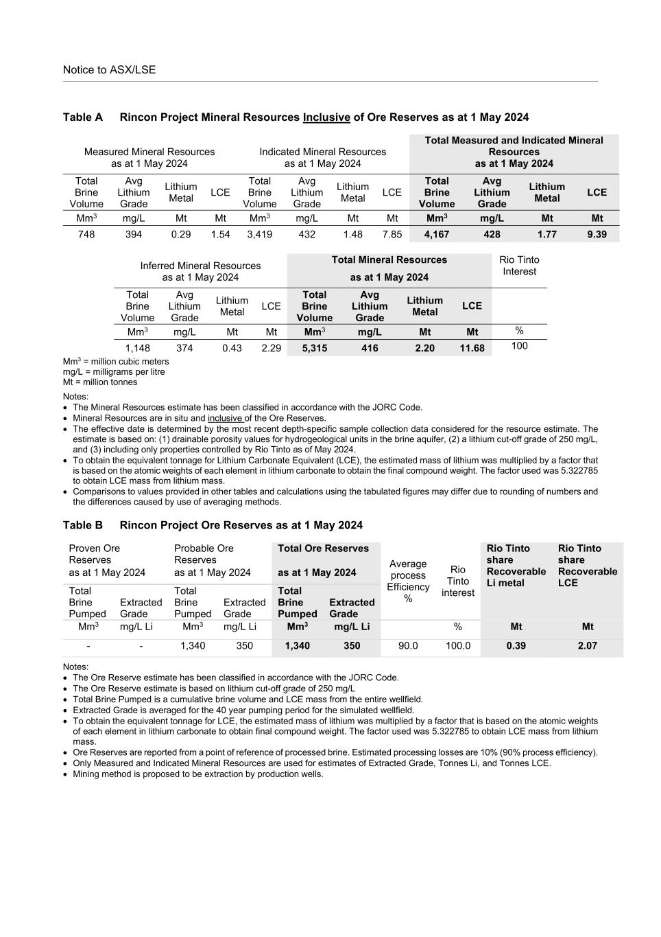 Notice to ASX/LSE Table A Rincon Project Mineral Resources Inclusive of Ore Reserves as at 1 May 2024 Measured Mineral Resources Indicated Mineral Resources Total Measured and Indicated Mineral Resources as at 1 May 2024 as at 1 May 2024 as at 1 May 2024 Total Brine Volume Avg Lithium Grade Lithium Metal LCE Total Brine Volume Avg Lithium Grade Lithium Metal LCE Total Brine Volume Avg Lithium Grade Lithium Metal LCE Mm3 mg/L Mt Mt Mm3 mg/L Mt Mt Mm3 mg/L Mt Mt 748 394 0.29 1.54 3,419 432 1.48 7.85 4,167 428 1.77 9.39 Inferred Mineral Resources Total Mineral Resources Rio Tinto Interest as at 1 May 2024 as at 1 May 2024 Total Brine Volume Avg Lithium Grade Lithium Metal LCE Total Brine Volume Avg Lithium Grade Lithium Metal LCE Mm3 mg/L Mt Mt Mm3 mg/L Mt Mt % 1,148 374 0.43 2.29 5,315 416 2.20 11.68 100 Mm3 = million cubic meters mg/L = milligrams per litre Mt = million tonnes Notes: • The Mineral Resources estimate has been classified in accordance with the JORC Code. • Mineral Resources are in situ and inclusive of the Ore Reserves. • The effective date is determined by the most recent depth-specific sample collection data considered for the resource estimate. The estimate is based on: (1) drainable porosity values for hydrogeological units in the brine aquifer, (2) a lithium cut-off grade of 250 mg/L, and (3) including only properties controlled by Rio Tinto as of May 2024. • To obtain the equivalent tonnage for Lithium Carbonate Equivalent (LCE), the estimated mass of lithium was multiplied by a factor that is based on the atomic weights of each element in lithium carbonate to obtain the final compound weight. The factor used was 5.322785 to obtain LCE mass from lithium mass. • Comparisons to values provided in other tables and calculations using the tabulated figures may differ due to rounding of numbers and the differences caused by use of averaging methods. Table B Rincon Project Ore Reserves as at 1 May 2024 Proven Ore Reserves Probable Ore Reserves Total Ore Reserves Average process Efficiency % Rio Tinto interest Rio Tinto share Recoverable Li metal Rio Tinto share Recoverable LCE as at 1 May 2024 as at 1 May 2024 as at 1 May 2024 Total Brine Pumped Extracted Grade Total Brine Pumped Extracted Grade Total Brine Pumped Extracted Grade Mm3 mg/L Li Mm3 mg/L Li Mm3 mg/L Li % Mt Mt - - 1,340 350 1,340 350 90.0 100.0 0.39 2.07 Notes: • The Ore Reserve estimate has been classified in accordance with the JORC Code. • The Ore Reserve estimate is based on lithium cut-off grade of 250 mg/L • Total Brine Pumped is a cumulative brine volume and LCE mass from the entire wellfield. • Extracted Grade is averaged for the 40 year pumping period for the simulated wellfield. • To obtain the equivalent tonnage for LCE, the estimated mass of lithium was multiplied by a factor that is based on the atomic weights of each element in lithium carbonate to obtain final compound weight. The factor used was 5.322785 to obtain LCE mass from lithium mass. • Ore Reserves are reported from a point of reference of processed brine. Estimated processing losses are 10% (90% process efficiency). • Only Measured and Indicated Mineral Resources are used for estimates of Extracted Grade, Tonnes Li, and Tonnes LCE. • Mining method is proposed to be extraction by production wells.