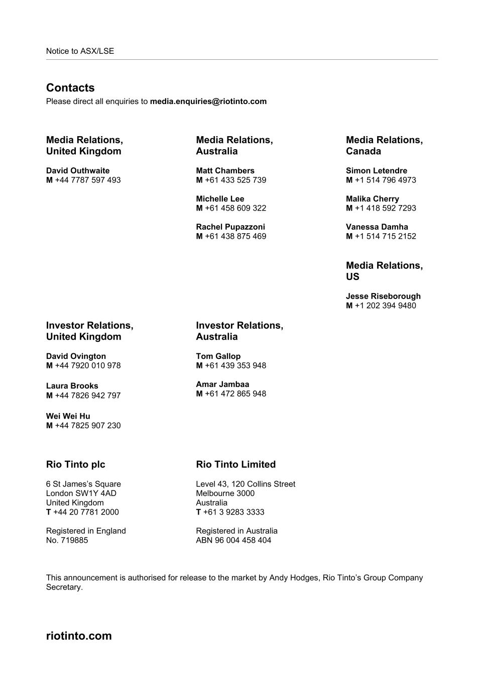 Notice to ASX/LSE Contacts Please direct all enquiries to media.enquiries@riotinto.com Media Relations, United Kingdom David Outhwaite M +44 7787 597 493 Media Relations, Australia Matt Chambers M +61 433 525 739 Michelle Lee M +61 458 609 322 Rachel Pupazzoni M +61 438 875 469 Media Relations, Canada Simon Letendre M +1 514 796 4973 Malika Cherry M +1 418 592 7293 Vanessa Damha M +1 514 715 2152 Media Relations, US Jesse Riseborough M +1 202 394 9480 Investor Relations, United Kingdom David Ovington M +44 7920 010 978 Laura Brooks M +44 7826 942 797 Wei Wei Hu M +44 7825 907 230 Investor Relations, Australia Tom Gallop M +61 439 353 948 Amar Jambaa M +61 472 865 948 Rio Tinto plc 6 St James’s Square London SW1Y 4AD United Kingdom T +44 20 7781 2000 Registered in England No. 719885 Rio Tinto Limited Level 43, 120 Collins Street Melbourne 3000 Australia T +61 3 9283 3333 Registered in Australia ABN 96 004 458 404 This announcement is authorised for release to the market by Andy Hodges, Rio Tinto’s Group Company Secretary. riotinto.com