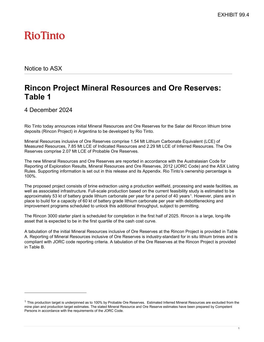 1 RioTintoNonBusiness Notice to ASX Rincon Project Mineral Resources and Ore Reserves: Table 1 4 December 2024 Rio Tinto today announces initial Mineral Resources and Ore Reserves for the Salar del Rincon lithium brine deposits (Rincon Project) in Argentina to be developed by Rio Tinto. Mineral Resources inclusive of Ore Reserves comprise 1.54 Mt Lithium Carbonate Equivalent (LCE) of Measured Resources, 7.85 Mt LCE of Indicated Resources and 2.29 Mt LCE of Inferred Resources. The Ore Reserves comprise 2.07 Mt LCE of Probable Ore Reserves. The new Mineral Resources and Ore Reserves are reported in accordance with the Australasian Code for Reporting of Exploration Results, Mineral Resources and Ore Reserves, 2012 (JORC Code) and the ASX Listing Rules. Supporting information is set out in this release and its Appendix. Rio Tinto’s ownership percentage is 100%. The proposed project consists of brine extraction using a production wellfield, processing and waste facilities, as well as associated infrastructure. Full-scale production based on the current feasibility study is estimated to be approximately 53 kt of battery grade lithium carbonate per year for a period of 40 years1. However, plans are in place to build for a capacity of 60 kt of battery grade lithium carbonate per year with debottlenecking and improvement programs scheduled to unlock this additional throughput, subject to permitting. The Rincon 3000 starter plant is scheduled for completion in the first half of 2025. Rincon is a large, long-life asset that is expected to be in the first quartile of the cash cost curve. A tabulation of the initial Mineral Resources inclusive of Ore Reserves at the Rincon Project is provided in Table A. Reporting of Mineral Resources inclusive of Ore Reserves is industry-standard for in situ lithium brines and is compliant with JORC code reporting criteria. A tabulation of the Ore Reserves at the Rincon Project is provided in Table B. 1 This production target is underpinned as to 100% by Probable Ore Reserves. Estimated Inferred Mineral Resources are excluded from the mine plan and production target estimates. The stated Mineral Resource and Ore Reserve estimates have been prepared by Competent Persons in accordance with the requirements of the JORC Code. EXHIBIT 99.4