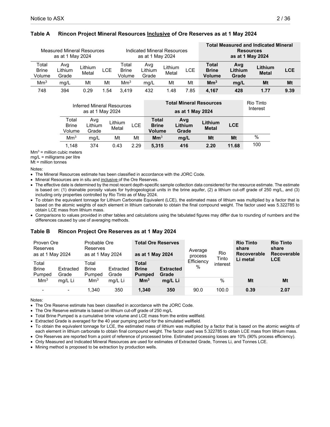 Notice to ASX 2 / 36 RioTintoNonBusiness Table A Rincon Project Mineral Resources Inclusive of Ore Reserves as at 1 May 2024 Measured Mineral Resources Indicated Mineral Resources Total Measured and Indicated Mineral Resources as at 1 May 2024 as at 1 May 2024 as at 1 May 2024 Total Brine Volume Avg Lithium Grade Lithium Metal LCE Total Brine Volume Avg Lithium Grade Lithium Metal LCE Total Brine Volume Avg Lithium Grade Lithium Metal LCE Mm3 mg/L Mt Mt Mm3 mg/L Mt Mt Mm3 mg/L Mt Mt 748 394 0.29 1.54 3,419 432 1.48 7.85 4,167 428 1.77 9.39 Inferred Mineral Resources Total Mineral Resources Rio Tinto Interest as at 1 May 2024 as at 1 May 2024 Total Brine Volume Avg Lithium Grade Lithium Metal LCE Total Brine Volume Avg Lithium Grade Lithium Metal LCE Mm3 mg/L Mt Mt Mm3 mg/L Mt Mt % 1,148 374 0.43 2.29 5,315 416 2.20 11.68 100 Mm3 = million cubic meters mg/L = milligrams per litre Mt = million tonnes Notes: • The Mineral Resources estimate has been classified in accordance with the JORC Code. • Mineral Resources are in situ and inclusive of the Ore Reserves. • The effective date is determined by the most recent depth-specific sample collection data considered for the resource estimate. The estimate is based on: (1) drainable porosity values for hydrogeological units in the brine aquifer, (2) a lithium cut-off grade of 250 mg/L, and (3) including only properties controlled by Rio Tinto as of May 2024. • To obtain the equivalent tonnage for Lithium Carbonate Equivalent (LCE), the estimated mass of lithium was multiplied by a factor that is based on the atomic weights of each element in lithium carbonate to obtain the final compound weight. The factor used was 5.322785 to obtain LCE mass from lithium mass. • Comparisons to values provided in other tables and calculations using the tabulated figures may differ due to rounding of numbers and the differences caused by use of averaging methods. Table B Rincon Project Ore Reserves as at 1 May 2024 Proven Ore Reserves Probable Ore Reserves Total Ore Reserves Average process Efficiency % Rio Tinto interest Rio Tinto share Recoverable Li metal Rio Tinto share Recoverable LCE as at 1 May 2024 as at 1 May 2024 as at 1 May 2024 Total Brine Pumped Extracted Grade Total Brine Pumped Extracted Grade Total Brine Pumped Extracted Grade Mm3 mg/L Li Mm3 mg/L Li Mm3 mg/L Li % Mt Mt - - 1,340 350 1,340 350 90.0 100.0 0.39 2.07 Notes: • The Ore Reserve estimate has been classified in accordance with the JORC Code. • The Ore Reserve estimate is based on lithium cut-off grade of 250 mg/L • Total Brine Pumped is a cumulative brine volume and LCE mass from the entire wellfield. • Extracted Grade is averaged for the 40 year pumping period for the simulated wellfield. • To obtain the equivalent tonnage for LCE, the estimated mass of lithium was multiplied by a factor that is based on the atomic weights of each element in lithium carbonate to obtain final compound weight. The factor used was 5.322785 to obtain LCE mass from lithium mass. • Ore Reserves are reported from a point of reference of processed brine. Estimated processing losses are 10% (90% process efficiency). • Only Measured and Indicated Mineral Resources are used for estimates of Extracted Grade, Tonnes Li, and Tonnes LCE. • Mining method is proposed to be extraction by production wells.