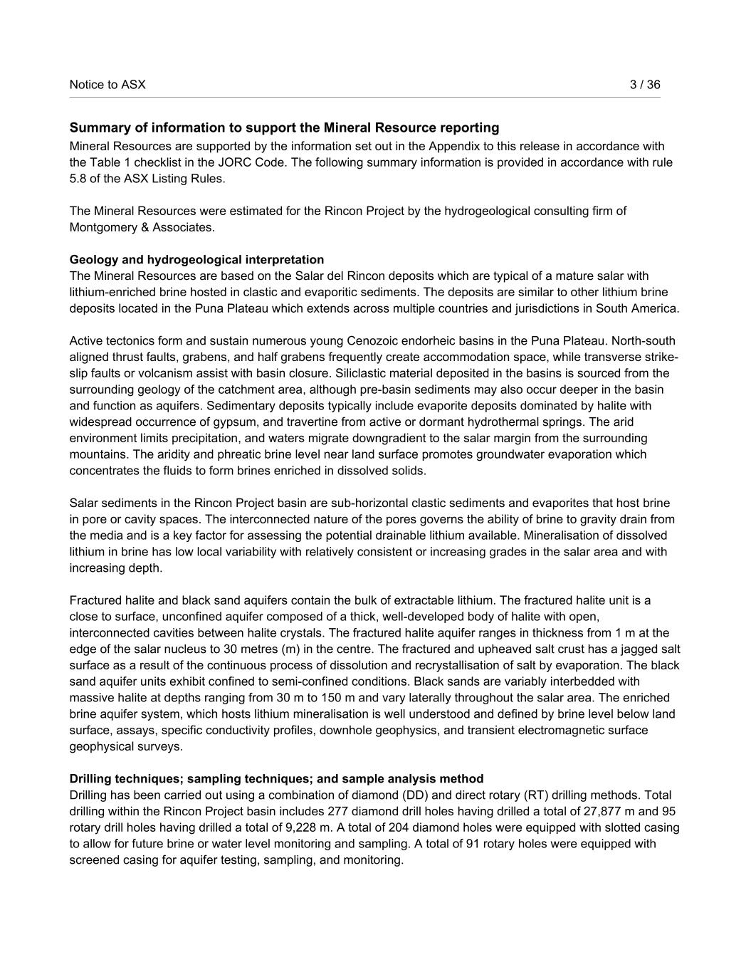 Notice to ASX 3 / 36 RioTintoNonBusiness Summary of information to support the Mineral Resource reporting Mineral Resources are supported by the information set out in the Appendix to this release in accordance with the Table 1 checklist in the JORC Code. The following summary information is provided in accordance with rule 5.8 of the ASX Listing Rules. The Mineral Resources were estimated for the Rincon Project by the hydrogeological consulting firm of Montgomery & Associates. Geology and hydrogeological interpretation The Mineral Resources are based on the Salar del Rincon deposits which are typical of a mature salar with lithium-enriched brine hosted in clastic and evaporitic sediments. The deposits are similar to other lithium brine deposits located in the Puna Plateau which extends across multiple countries and jurisdictions in South America. Active tectonics form and sustain numerous young Cenozoic endorheic basins in the Puna Plateau. North-south aligned thrust faults, grabens, and half grabens frequently create accommodation space, while transverse strike- slip faults or volcanism assist with basin closure. Siliclastic material deposited in the basins is sourced from the surrounding geology of the catchment area, although pre-basin sediments may also occur deeper in the basin and function as aquifers. Sedimentary deposits typically include evaporite deposits dominated by halite with widespread occurrence of gypsum, and travertine from active or dormant hydrothermal springs. The arid environment limits precipitation, and waters migrate downgradient to the salar margin from the surrounding mountains. The aridity and phreatic brine level near land surface promotes groundwater evaporation which concentrates the fluids to form brines enriched in dissolved solids. Salar sediments in the Rincon Project basin are sub-horizontal clastic sediments and evaporites that host brine in pore or cavity spaces. The interconnected nature of the pores governs the ability of brine to gravity drain from the media and is a key factor for assessing the potential drainable lithium available. Mineralisation of dissolved lithium in brine has low local variability with relatively consistent or increasing grades in the salar area and with increasing depth. Fractured halite and black sand aquifers contain the bulk of extractable lithium. The fractured halite unit is a close to surface, unconfined aquifer composed of a thick, well-developed body of halite with open, interconnected cavities between halite crystals. The fractured halite aquifer ranges in thickness from 1 m at the edge of the salar nucleus to 30 metres (m) in the centre. The fractured and upheaved salt crust has a jagged salt surface as a result of the continuous process of dissolution and recrystallisation of salt by evaporation. The black sand aquifer units exhibit confined to semi-confined conditions. Black sands are variably interbedded with massive halite at depths ranging from 30 m to 150 m and vary laterally throughout the salar area. The enriched brine aquifer system, which hosts lithium mineralisation is well understood and defined by brine level below land surface, assays, specific conductivity profiles, downhole geophysics, and transient electromagnetic surface geophysical surveys. Drilling techniques; sampling techniques; and sample analysis method Drilling has been carried out using a combination of diamond (DD) and direct rotary (RT) drilling methods. Total drilling within the Rincon Project basin includes 277 diamond drill holes having drilled a total of 27,877 m and 95 rotary drill holes having drilled a total of 9,228 m. A total of 204 diamond holes were equipped with slotted casing to allow for future brine or water level monitoring and sampling. A total of 91 rotary holes were equipped with screened casing for aquifer testing, sampling, and monitoring.