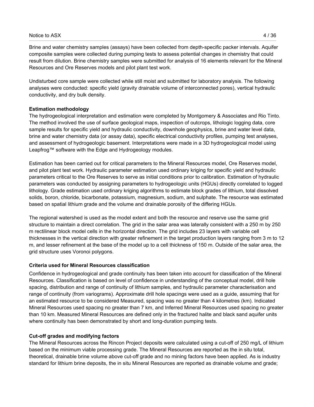 Notice to ASX 4 / 36 RioTintoNonBusiness Brine and water chemistry samples (assays) have been collected from depth-specific packer intervals. Aquifer composite samples were collected during pumping tests to assess potential changes in chemistry that could result from dilution. Brine chemistry samples were submitted for analysis of 16 elements relevant for the Mineral Resources and Ore Reserves models and pilot plant test work. Undisturbed core sample were collected while still moist and submitted for laboratory analysis. The following analyses were conducted: specific yield (gravity drainable volume of interconnected pores), vertical hydraulic conductivity, and dry bulk density. Estimation methodology The hydrogeological interpretation and estimation were completed by Montgomery & Associates and Rio Tinto. The method involved the use of surface geological maps, inspection of outcrops, lithologic logging data, core sample results for specific yield and hydraulic conductivity, downhole geophysics, brine and water level data, brine and water chemistry data (or assay data), specific electrical conductivity profiles, pumping test analyses, and assessment of hydrogeologic basement. Interpretations were made in a 3D hydrogeological model using Leapfrog™ software with the Edge and Hydrogeology modules. Estimation has been carried out for critical parameters to the Mineral Resources model, Ore Reserves model, and pilot plant test work. Hydraulic parameter estimation used ordinary kriging for specific yield and hydraulic parameters critical to the Ore Reserves to serve as initial conditions prior to calibration. Estimation of hydraulic parameters was conducted by assigning parameters to hydrogeologic units (HGUs) directly correlated to logged lithology. Grade estimation used ordinary kriging algorithms to estimate block grades of lithium, total dissolved solids, boron, chloride, bicarbonate, potassium, magnesium, sodium, and sulphate. The resource was estimated based on spatial lithium grade and the volume and drainable porosity of the differing HGUs. The regional watershed is used as the model extent and both the resource and reserve use the same grid structure to maintain a direct correlation. The grid in the salar area was laterally consistent with a 250 m by 250 m rectilinear block model cells in the horizontal direction. The grid includes 23 layers with variable cell thicknesses in the vertical direction with greater refinement in the target production layers ranging from 3 m to 12 m, and lesser refinement at the base of the model up to a cell thickness of 150 m. Outside of the salar area, the grid structure uses Voronoi polygons. Criteria used for Mineral Resources classification Confidence in hydrogeological and grade continuity has been taken into account for classification of the Mineral Resources. Classification is based on level of confidence in understanding of the conceptual model, drill hole spacing, distribution and range of continuity of lithium samples, and hydraulic parameter characterisation and range of continuity (from variograms). Approximate drill hole spacings were used as a guide, assuming that for an estimated resource to be considered Measured, spacing was no greater than 4 kilometres (km). Indicated Mineral Resources used spacing no greater than 7 km, and Inferred Mineral Resources used spacing no greater than 10 km. Measured Mineral Resources are defined only in the fractured halite and black sand aquifer units where continuity has been demonstrated by short and long-duration pumping tests. Cut-off grades and modifying factors The Mineral Resources across the Rincon Project deposits were calculated using a cut-off of 250 mg/L of lithium based on the minimum viable processing grade. The Mineral Resources are reported as the in situ total, theoretical, drainable brine volume above cut-off grade and no mining factors have been applied. As is industry standard for lithium brine deposits, the in situ Mineral Resources are reported as drainable volume and grade;