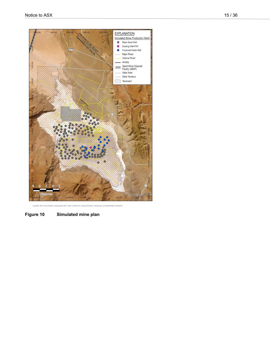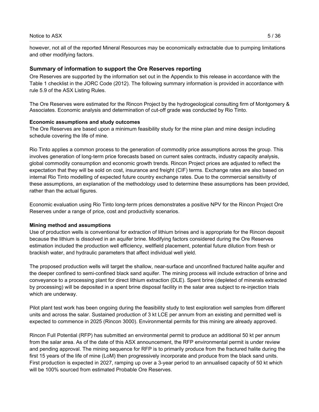Notice to ASX 5 / 36 RioTintoNonBusiness however, not all of the reported Mineral Resources may be economically extractable due to pumping limitations and other modifying factors. Summary of information to support the Ore Reserves reporting Ore Reserves are supported by the information set out in the Appendix to this release in accordance with the Table 1 checklist in the JORC Code (2012). The following summary information is provided in accordance with rule 5.9 of the ASX Listing Rules. The Ore Reserves were estimated for the Rincon Project by the hydrogeological consulting firm of Montgomery & Associates. Economic analysis and determination of cut-off grade was conducted by Rio Tinto. Economic assumptions and study outcomes The Ore Reserves are based upon a minimum feasibility study for the mine plan and mine design including schedule covering the life of mine. Rio Tinto applies a common process to the generation of commodity price assumptions across the group. This involves generation of long-term price forecasts based on current sales contracts, industry capacity analysis, global commodity consumption and economic growth trends. Rincon Project prices are adjusted to reflect the expectation that they will be sold on cost, insurance and freight (CIF) terms. Exchange rates are also based on internal Rio Tinto modelling of expected future country exchange rates. Due to the commercial sensitivity of these assumptions, an explanation of the methodology used to determine these assumptions has been provided, rather than the actual figures. Economic evaluation using Rio Tinto long-term prices demonstrates a positive NPV for the Rincon Project Ore Reserves under a range of price, cost and productivity scenarios. Mining method and assumptions Use of production wells is conventional for extraction of lithium brines and is appropriate for the Rincon deposit because the lithium is dissolved in an aquifer brine. Modifying factors considered during the Ore Reserves estimation included the production well efficiency, wellfield placement, potential future dilution from fresh or brackish water, and hydraulic parameters that affect individual well yield. The proposed production wells will target the shallow, near-surface and unconfined fractured halite aquifer and the deeper confined to semi-confined black sand aquifer. The mining process will include extraction of brine and conveyance to a processing plant for direct lithium extraction (DLE). Spent brine (depleted of minerals extracted by processing) will be deposited in a spent brine disposal facility in the salar area subject to re-injection trials which are underway. Pilot plant test work has been ongoing during the feasibility study to test exploration well samples from different units and across the salar. Sustained production of 3 kt LCE per annum from an existing and permitted well is expected to commence in 2025 (Rincon 3000). Environmental permits for this mining are already approved. Rincon Full Potential (RFP) has submitted an environmental permit to produce an additional 50 kt per annum from the salar area. As of the date of this ASX announcement, the RFP environmental permit is under review and pending approval. The mining sequence for RFP is to primarily produce from the fractured halite during the first 15 years of the life of mine (LoM) then progressively incorporate and produce from the black sand units. First production is expected in 2027, ramping up over a 3-year period to an annualised capacity of 50 kt which will be 100% sourced from estimated Probable Ore Reserves.