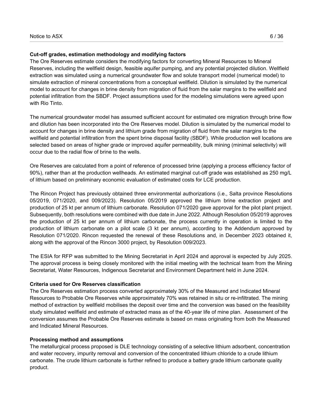 Notice to ASX 6 / 36 RioTintoNonBusiness Cut-off grades, estimation methodology and modifying factors The Ore Reserves estimate considers the modifying factors for converting Mineral Resources to Mineral Reserves, including the wellfield design, feasible aquifer pumping, and any potential projected dilution. Wellfield extraction was simulated using a numerical groundwater flow and solute transport model (numerical model) to simulate extraction of mineral concentrations from a conceptual wellfield. Dilution is simulated by the numerical model to account for changes in brine density from migration of fluid from the salar margins to the wellfield and potential infiltration from the SBDF. Project assumptions used for the modeling simulations were agreed upon with Rio Tinto. The numerical groundwater model has assumed sufficient account for estimated ore migration through brine flow and dilution has been incorporated into the Ore Reserves model. Dilution is simulated by the numerical model to account for changes in brine density and lithium grade from migration of fluid from the salar margins to the wellfield and potential infiltration from the spent brine disposal facility (SBDF). While production well locations are selected based on areas of higher grade or improved aquifer permeability, bulk mining (minimal selectivity) will occur due to the radial flow of brine to the wells. Ore Reserves are calculated from a point of reference of processed brine (applying a process efficiency factor of 90%), rather than at the production wellheads. An estimated marginal cut-off grade was established as 250 mg/L of lithium based on preliminary economic evaluation of estimated costs for LCE production. The Rincon Project has previously obtained three environmental authorizations (i.e., Salta province Resolutions 05/2019, 071/2020, and 009/2023). Resolution 05/2019 approved the lithium brine extraction project and production of 25 kt per annum of lithium carbonate. Resolution 071/2020 gave approval for the pilot plant project. Subsequently, both resolutions were combined with due date in June 2022. Although Resolution 05/2019 approves the production of 25 kt per annum of lithium carbonate, the process currently in operation is limited to the production of lithium carbonate on a pilot scale (3 kt per annum), according to the Addendum approved by Resolution 071/2020. Rincon requested the renewal of these Resolutions and, in December 2023 obtained it, along with the approval of the Rincon 3000 project, by Resolution 009/2023. The ESIA for RFP was submitted to the Mining Secretariat in April 2024 and approval is expected by July 2025. The approval process is being closely monitored with the initial meeting with the technical team from the Mining Secretariat, Water Resources, Indigenous Secretariat and Environment Department held in June 2024. Criteria used for Ore Reserves classification The Ore Reserves estimation process converted approximately 30% of the Measured and Indicated Mineral Resources to Probable Ore Reserves while approximately 70% was retained in situ or re-infiltrated. The mining method of extraction by wellfield mobilises the deposit over time and the conversion was based on the feasibility study simulated wellfield and estimate of extracted mass as of the 40-year life of mine plan. Assessment of the conversion assumes the Probable Ore Reserves estimate is based on mass originating from both the Measured and Indicated Mineral Resources. Processing method and assumptions The metallurgical process proposed is DLE technology consisting of a selective lithium adsorbent, concentration and water recovery, impurity removal and conversion of the concentrated lithium chloride to a crude lithium carbonate. The crude lithium carbonate is further refined to produce a battery grade lithium carbonate quality product.