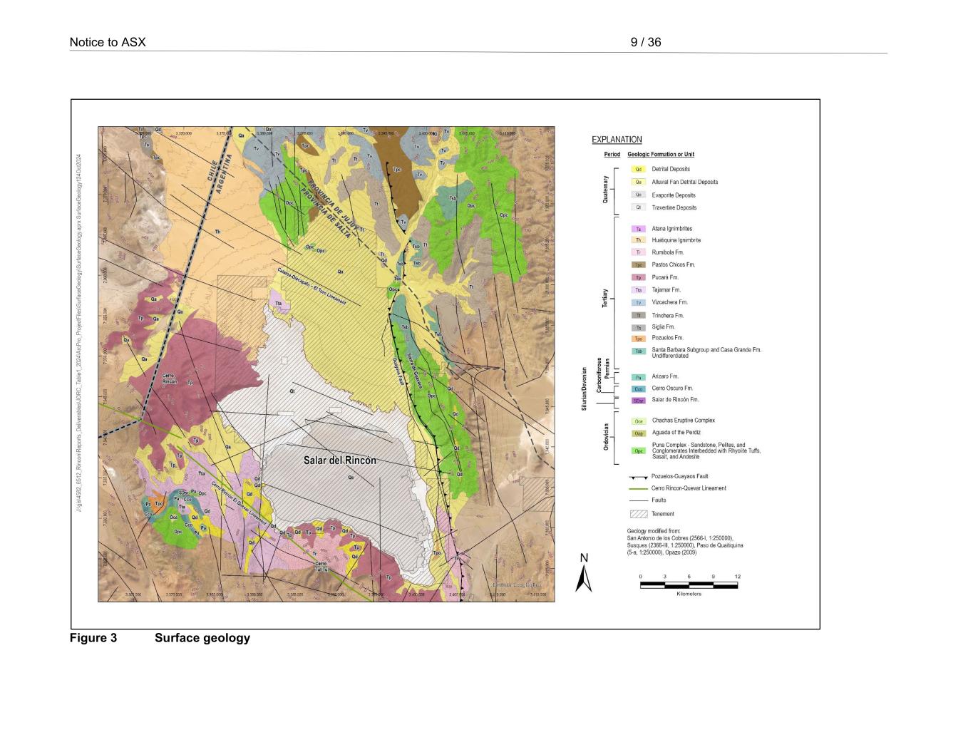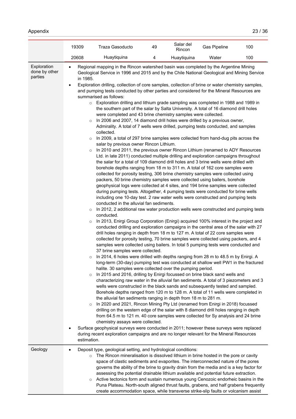 Appendix 23 / 36 RioTintoNonBusiness 19309 Traza Gasoducto 49 Salar del Rincon Gas Pipeline 100 20608 Huaytiquina 4 Huaytiquina Water 100 Exploration done by other parties • Regional mapping in the Rincon watershed basin was completed by the Argentine Mining Geological Service in 1996 and 2015 and by the Chile National Geological and Mining Service in 1985. • Exploration drilling, collection of core samples, collection of brine or water chemistry samples, and pumping tests conducted by other parties and considered for the Mineral Resources are summarised as follows: o Exploration drilling and lithium grade sampling was completed in 1988 and 1989 in the southern part of the salar by Salta University. A total of 16 diamond drill holes were completed and 43 brine chemistry samples were collected. o In 2006 and 2007, 14 diamond drill holes were drilled by a previous owner, Admirality. A total of 7 wells were drilled, pumping tests conducted, and samples collected. o In 2009, a total of 297 brine samples were collected from hand-dug pits across the salar by previous owner Rincon Lithium. o In 2010 and 2011, the previous owner Rincon Lithium (renamed to ADY Resources Ltd. in late 2011) conducted multiple drilling and exploration campaigns throughout the salar for a total of 109 diamond drill holes and 3 brine wells were drilled with borehole depths ranging from 18 m to 311 m. A total of 162 core samples were collected for porosity testing, 306 brine chemistry samples were collected using packers, 50 brine chemistry samples were collected using bailers, borehole geophysical logs were collected at 4 sites, and 194 brine samples were collected during pumping tests. Altogether, 4 pumping tests were conducted for brine wells including one 10-day test. 2 raw water wells were constructed and pumping tests conducted in the alluvial fan sediments. o In 2012, 2 additional raw water production wells were constructed and pumping tests conducted. o In 2013, Enirgi Group Corporation (Enirgi) acquired 100% interest in the project and conducted drilling and exploration campaigns in the central area of the salar with 27 drill holes ranging in depth from 18 m to 127 m. A total of 22 core samples were collected for porosity testing, 70 brine samples were collected using packers, and 4 samples were collected using bailers. In total 5 pumping tests were conducted and 37 brine samples were collected. o In 2014, 6 holes were drilled with depths ranging from 28 m to 48.5 m by Enirgi. A long-term (30-day) pumping test was conducted at shallow well PW1 in the fractured halite. 30 samples were collected over the pumping period. o In 2015 and 2016, drilling by Enirgi focussed on brine black sand wells and characterizing raw water in the alluvial fan sediments. A total of 3 piezometers and 3 wells were constructed in the black sands and subsequently tested and sampled. Borehole depths ranged from 120 m to 128 m. A total of 11 wells were completed in the alluvial fan sediments ranging in depth from 18 m to 281 m. o In 2020 and 2021, Rincon Mining Pty Ltd (renamed from Enirgi in 2018) focussed drilling on the western edge of the salar with 8 diamond drill holes ranging in depth from 64.5 m to 121 m. 40 core samples were collected for Sy analysis and 24 brine chemistry assays were collected. • Surface geophysical surveys were conducted in 2011; however these surveys were replaced during recent exploration campaigns and are no longer relevant for the Mineral Resources estimation. Geology • Deposit type, geological setting, and hydrological conditions: o The Rincon mineralisation is dissolved lithium in brine hosted in the pore or cavity space of clastic sediments and evaporites. The interconnected nature of the pores governs the ability of the brine to gravity drain from the media and is a key factor for assessing the potential drainable lithium available and potential future extraction. o Active tectonics form and sustain numerous young Cenozoic endorheic basins in the Puna Plateau. North-south aligned thrust faults, grabens, and half grabens frequently create accommodation space, while transverse strike-slip faults or volcanism assist
