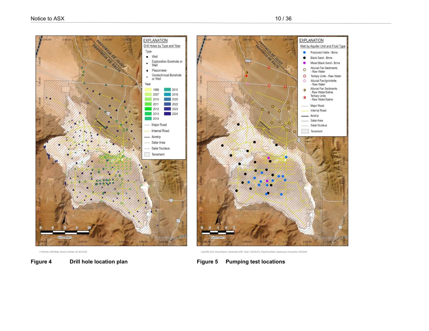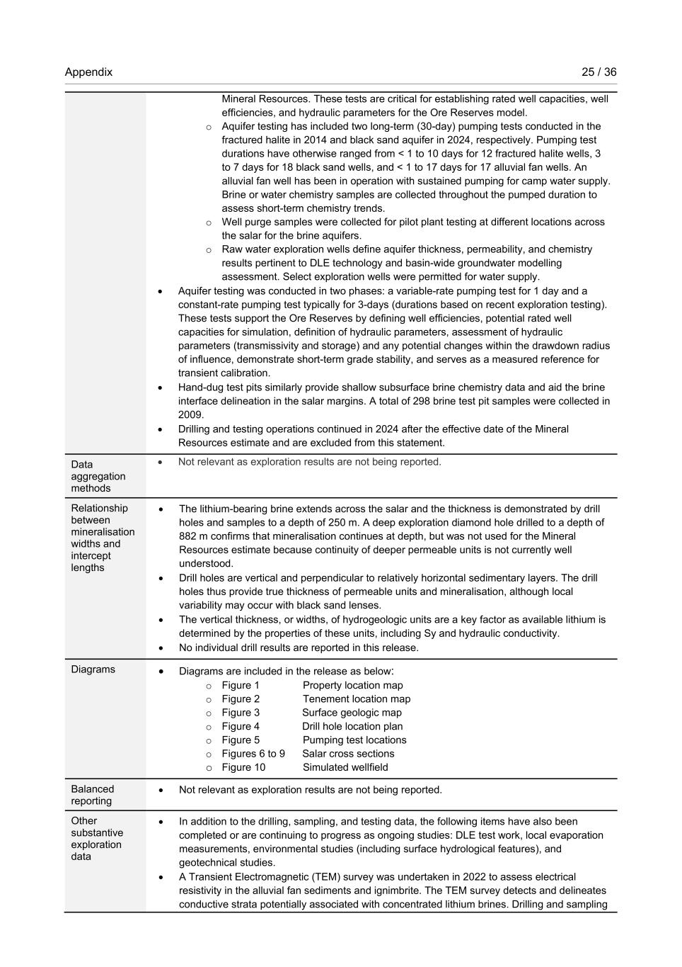 Appendix 25 / 36 RioTintoNonBusiness Mineral Resources. These tests are critical for establishing rated well capacities, well efficiencies, and hydraulic parameters for the Ore Reserves model. o Aquifer testing has included two long-term (30-day) pumping tests conducted in the fractured halite in 2014 and black sand aquifer in 2024, respectively. Pumping test durations have otherwise ranged from < 1 to 10 days for 12 fractured halite wells, 3 to 7 days for 18 black sand wells, and < 1 to 17 days for 17 alluvial fan wells. An alluvial fan well has been in operation with sustained pumping for camp water supply. Brine or water chemistry samples are collected throughout the pumped duration to assess short-term chemistry trends. o Well purge samples were collected for pilot plant testing at different locations across the salar for the brine aquifers. o Raw water exploration wells define aquifer thickness, permeability, and chemistry results pertinent to DLE technology and basin-wide groundwater modelling assessment. Select exploration wells were permitted for water supply. • Aquifer testing was conducted in two phases: a variable-rate pumping test for 1 day and a constant-rate pumping test typically for 3-days (durations based on recent exploration testing). These tests support the Ore Reserves by defining well efficiencies, potential rated well capacities for simulation, definition of hydraulic parameters, assessment of hydraulic parameters (transmissivity and storage) and any potential changes within the drawdown radius of influence, demonstrate short-term grade stability, and serves as a measured reference for transient calibration. • Hand-dug test pits similarly provide shallow subsurface brine chemistry data and aid the brine interface delineation in the salar margins. A total of 298 brine test pit samples were collected in 2009. • Drilling and testing operations continued in 2024 after the effective date of the Mineral Resources estimate and are excluded from this statement. Data aggregation methods • Not relevant as exploration results are not being reported. Relationship between mineralisation widths and intercept lengths • The lithium-bearing brine extends across the salar and the thickness is demonstrated by drill holes and samples to a depth of 250 m. A deep exploration diamond hole drilled to a depth of 882 m confirms that mineralisation continues at depth, but was not used for the Mineral Resources estimate because continuity of deeper permeable units is not currently well understood. • Drill holes are vertical and perpendicular to relatively horizontal sedimentary layers. The drill holes thus provide true thickness of permeable units and mineralisation, although local variability may occur with black sand lenses. • The vertical thickness, or widths, of hydrogeologic units are a key factor as available lithium is determined by the properties of these units, including Sy and hydraulic conductivity. • No individual drill results are reported in this release. Diagrams • Diagrams are included in the release as below: o Figure 1 Property location map o Figure 2 Tenement location map o Figure 3 Surface geologic map o Figure 4 Drill hole location plan o Figure 5 Pumping test locations o Figures 6 to 9 Salar cross sections o Figure 10 Simulated wellfield Balanced reporting • Not relevant as exploration results are not being reported. Other substantive exploration data • In addition to the drilling, sampling, and testing data, the following items have also been completed or are continuing to progress as ongoing studies: DLE test work, local evaporation measurements, environmental studies (including surface hydrological features), and geotechnical studies. • A Transient Electromagnetic (TEM) survey was undertaken in 2022 to assess electrical resistivity in the alluvial fan sediments and ignimbrite. The TEM survey detects and delineates conductive strata potentially associated with concentrated lithium brines. Drilling and sampling