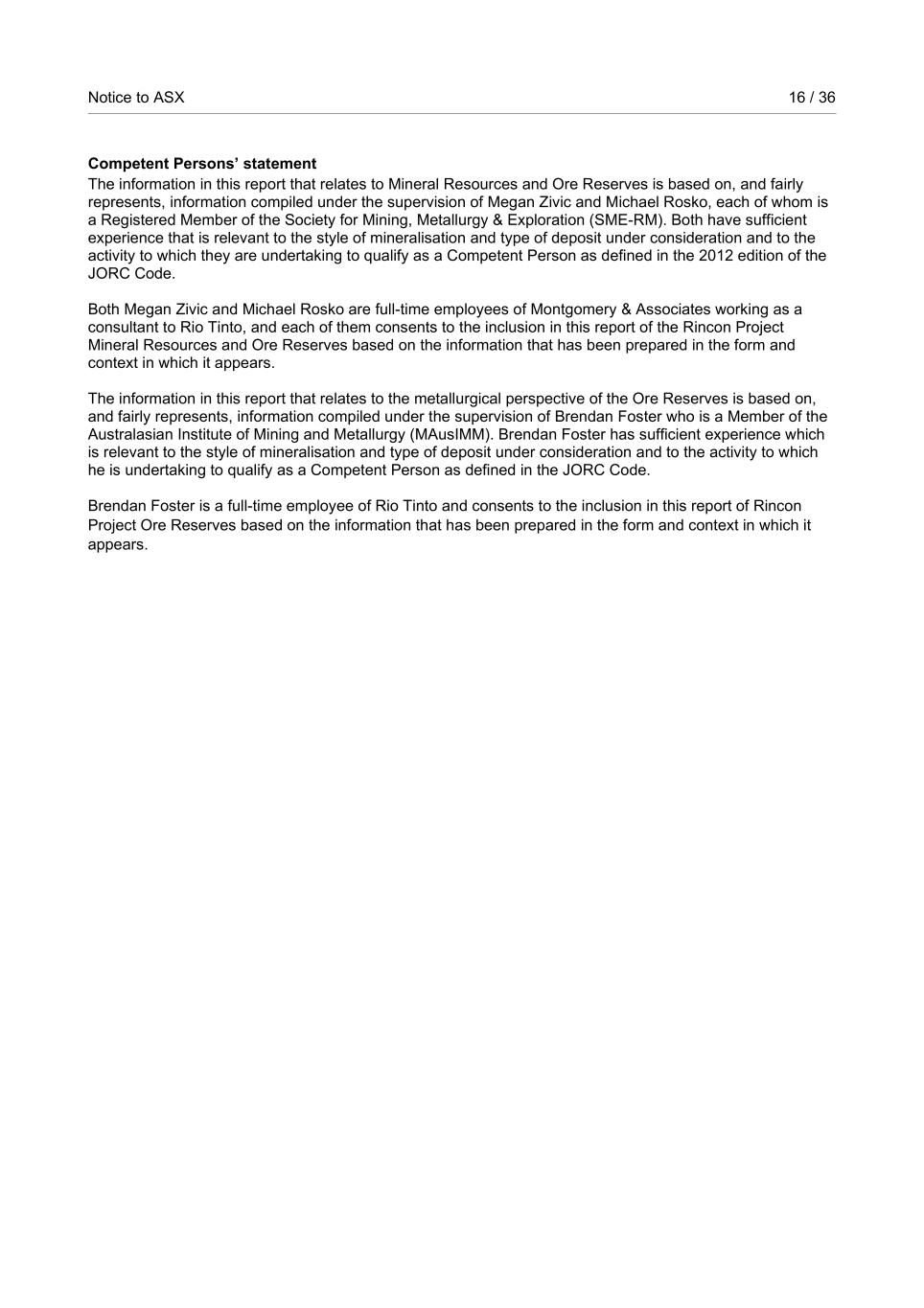 Notice to ASX 16 / 36 RioTintoNonBusiness Competent Persons’ statement The information in this report that relates to Mineral Resources and Ore Reserves is based on, and fairly represents, information compiled under the supervision of Megan Zivic and Michael Rosko, each of whom is a Registered Member of the Society for Mining, Metallurgy & Exploration (SME-RM). Both have sufficient experience that is relevant to the style of mineralisation and type of deposit under consideration and to the activity to which they are undertaking to qualify as a Competent Person as defined in the 2012 edition of the JORC Code. Both Megan Zivic and Michael Rosko are full-time employees of Montgomery & Associates working as a consultant to Rio Tinto, and each of them consents to the inclusion in this report of the Rincon Project Mineral Resources and Ore Reserves based on the information that has been prepared in the form and context in which it appears. The information in this report that relates to the metallurgical perspective of the Ore Reserves is based on, and fairly represents, information compiled under the supervision of Brendan Foster who is a Member of the Australasian Institute of Mining and Metallurgy (MAusIMM). Brendan Foster has sufficient experience which is relevant to the style of mineralisation and type of deposit under consideration and to the activity to which he is undertaking to qualify as a Competent Person as defined in the JORC Code. Brendan Foster is a full-time employee of Rio Tinto and consents to the inclusion in this report of Rincon Project Ore Reserves based on the information that has been prepared in the form and context in which it appears.