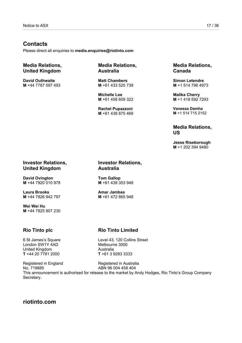 Notice to ASX 17 / 36 RioTintoNonBusiness Contacts Please direct all enquiries to media.enquiries@riotinto.com Media Relations, United Kingdom David Outhwaite M +44 7787 597 493 Media Relations, Australia Matt Chambers M +61 433 525 739 Michelle Lee M +61 458 609 322 Rachel Pupazzoni M +61 438 875 469 Media Relations, Canada Simon Letendre M +1 514 796 4973 Malika Cherry M +1 418 592 7293 Vanessa Damha M +1 514 715 2152 Media Relations, US Jesse Riseborough M +1 202 394 9480 Investor Relations, United Kingdom David Ovington M +44 7920 010 978 Laura Brooks M +44 7826 942 797 Wei Wei Hu M +44 7825 907 230 Investor Relations, Australia Tom Gallop M +61 439 353 948 Amar Jambaa M +61 472 865 948 Rio Tinto plc 6 St James’s Square London SW1Y 4AD United Kingdom T +44 20 7781 2000 Registered in England No. 719885 Rio Tinto Limited Level 43, 120 Collins Street Melbourne 3000 Australia T +61 3 9283 3333 Registered in Australia ABN 96 004 458 404 This announcement is authorised for release to the market by Andy Hodges, Rio Tinto’s Group Company Secretary. riotinto.com