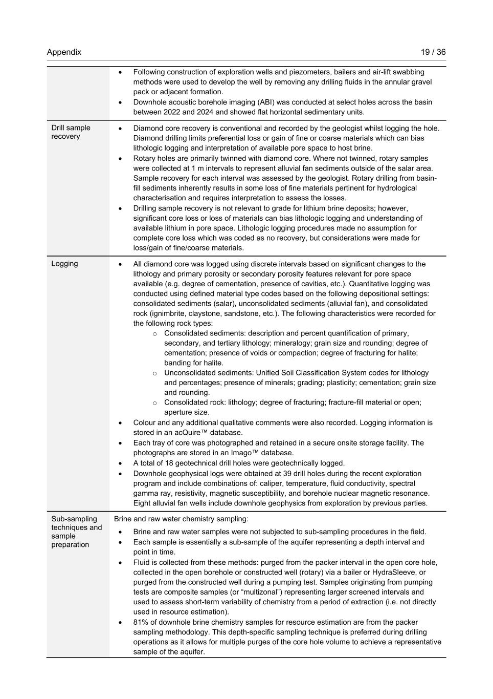Appendix 19 / 36 RioTintoNonBusiness • Following construction of exploration wells and piezometers, bailers and air-lift swabbing methods were used to develop the well by removing any drilling fluids in the annular gravel pack or adjacent formation. • Downhole acoustic borehole imaging (ABI) was conducted at select holes across the basin between 2022 and 2024 and showed flat horizontal sedimentary units. Drill sample recovery • Diamond core recovery is conventional and recorded by the geologist whilst logging the hole. Diamond drilling limits preferential loss or gain of fine or coarse materials which can bias lithologic logging and interpretation of available pore space to host brine. • Rotary holes are primarily twinned with diamond core. Where not twinned, rotary samples were collected at 1 m intervals to represent alluvial fan sediments outside of the salar area. Sample recovery for each interval was assessed by the geologist. Rotary drilling from basin- fill sediments inherently results in some loss of fine materials pertinent for hydrological characterisation and requires interpretation to assess the losses. • Drilling sample recovery is not relevant to grade for lithium brine deposits; however, significant core loss or loss of materials can bias lithologic logging and understanding of available lithium in pore space. Lithologic logging procedures made no assumption for complete core loss which was coded as no recovery, but considerations were made for loss/gain of fine/coarse materials. Logging • All diamond core was logged using discrete intervals based on significant changes to the lithology and primary porosity or secondary porosity features relevant for pore space available (e.g. degree of cementation, presence of cavities, etc.). Quantitative logging was conducted using defined material type codes based on the following depositional settings: consolidated sediments (salar), unconsolidated sediments (alluvial fan), and consolidated rock (ignimbrite, claystone, sandstone, etc.). The following characteristics were recorded for the following rock types: o Consolidated sediments: description and percent quantification of primary, secondary, and tertiary lithology; mineralogy; grain size and rounding; degree of cementation; presence of voids or compaction; degree of fracturing for halite; banding for halite. o Unconsolidated sediments: Unified Soil Classification System codes for lithology and percentages; presence of minerals; grading; plasticity; cementation; grain size and rounding. o Consolidated rock: lithology; degree of fracturing; fracture-fill material or open; aperture size. • Colour and any additional qualitative comments were also recorded. Logging information is stored in an acQuire™ database. • Each tray of core was photographed and retained in a secure onsite storage facility. The photographs are stored in an Imago™ database. • A total of 18 geotechnical drill holes were geotechnically logged. • Downhole geophysical logs were obtained at 39 drill holes during the recent exploration program and include combinations of: caliper, temperature, fluid conductivity, spectral gamma ray, resistivity, magnetic susceptibility, and borehole nuclear magnetic resonance. Eight alluvial fan wells include downhole geophysics from exploration by previous parties. Sub-sampling techniques and sample preparation Brine and raw water chemistry sampling: • Brine and raw water samples were not subjected to sub-sampling procedures in the field. • Each sample is essentially a sub-sample of the aquifer representing a depth interval and point in time. • Fluid is collected from these methods: purged from the packer interval in the open core hole, collected in the open borehole or constructed well (rotary) via a bailer or HydraSleeve, or purged from the constructed well during a pumping test. Samples originating from pumping tests are composite samples (or “multizonal”) representing larger screened intervals and used to assess short-term variability of chemistry from a period of extraction (i.e. not directly used in resource estimation). • 81% of downhole brine chemistry samples for resource estimation are from the packer sampling methodology. This depth-specific sampling technique is preferred during drilling operations as it allows for multiple purges of the core hole volume to achieve a representative sample of the aquifer.