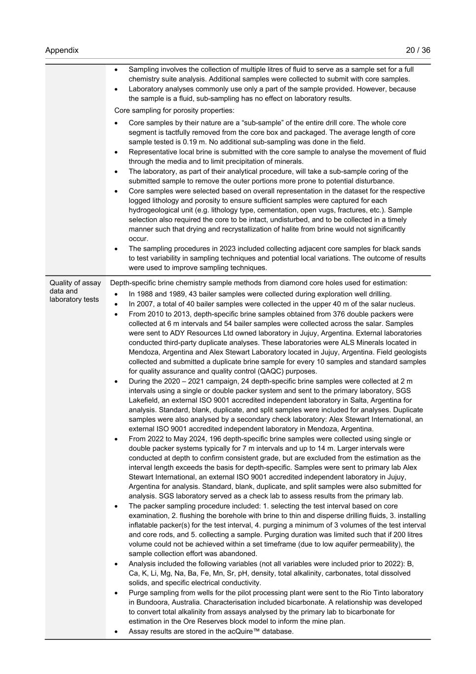 Appendix 20 / 36 RioTintoNonBusiness • Sampling involves the collection of multiple litres of fluid to serve as a sample set for a full chemistry suite analysis. Additional samples were collected to submit with core samples. • Laboratory analyses commonly use only a part of the sample provided. However, because the sample is a fluid, sub-sampling has no effect on laboratory results. Core sampling for porosity properties: • Core samples by their nature are a “sub-sample” of the entire drill core. The whole core segment is tactfully removed from the core box and packaged. The average length of core sample tested is 0.19 m. No additional sub-sampling was done in the field. • Representative local brine is submitted with the core sample to analyse the movement of fluid through the media and to limit precipitation of minerals. • The laboratory, as part of their analytical procedure, will take a sub-sample coring of the submitted sample to remove the outer portions more prone to potential disturbance. • Core samples were selected based on overall representation in the dataset for the respective logged lithology and porosity to ensure sufficient samples were captured for each hydrogeological unit (e.g. lithology type, cementation, open vugs, fractures, etc.). Sample selection also required the core to be intact, undisturbed, and to be collected in a timely manner such that drying and recrystallization of halite from brine would not significantly occur. • The sampling procedures in 2023 included collecting adjacent core samples for black sands to test variability in sampling techniques and potential local variations. The outcome of results were used to improve sampling techniques. Quality of assay data and laboratory tests Depth-specific brine chemistry sample methods from diamond core holes used for estimation: • In 1988 and 1989, 43 bailer samples were collected during exploration well drilling. • In 2007, a total of 40 bailer samples were collected in the upper 40 m of the salar nucleus. • From 2010 to 2013, depth-specific brine samples obtained from 376 double packers were collected at 6 m intervals and 54 bailer samples were collected across the salar. Samples were sent to ADY Resources Ltd owned laboratory in Jujuy, Argentina. External laboratories conducted third-party duplicate analyses. These laboratories were ALS Minerals located in Mendoza, Argentina and Alex Stewart Laboratory located in Jujuy, Argentina. Field geologists collected and submitted a duplicate brine sample for every 10 samples and standard samples for quality assurance and quality control (QAQC) purposes. • During the 2020 – 2021 campaign, 24 depth-specific brine samples were collected at 2 m intervals using a single or double packer system and sent to the primary laboratory, SGS Lakefield, an external ISO 9001 accredited independent laboratory in Salta, Argentina for analysis. Standard, blank, duplicate, and split samples were included for analyses. Duplicate samples were also analysed by a secondary check laboratory: Alex Stewart International, an external ISO 9001 accredited independent laboratory in Mendoza, Argentina. • From 2022 to May 2024, 196 depth-specific brine samples were collected using single or double packer systems typically for 7 m intervals and up to 14 m. Larger intervals were conducted at depth to confirm consistent grade, but are excluded from the estimation as the interval length exceeds the basis for depth-specific. Samples were sent to primary lab Alex Stewart International, an external ISO 9001 accredited independent laboratory in Jujuy, Argentina for analysis. Standard, blank, duplicate, and split samples were also submitted for analysis. SGS laboratory served as a check lab to assess results from the primary lab. • The packer sampling procedure included: 1. selecting the test interval based on core examination, 2. flushing the borehole with brine to thin and disperse drilling fluids, 3. installing inflatable packer(s) for the test interval, 4. purging a minimum of 3 volumes of the test interval and core rods, and 5. collecting a sample. Purging duration was limited such that if 200 litres volume could not be achieved within a set timeframe (due to low aquifer permeability), the sample collection effort was abandoned. • Analysis included the following variables (not all variables were included prior to 2022): B, Ca, K, Li, Mg, Na, Ba, Fe, Mn, Sr, pH, density, total alkalinity, carbonates, total dissolved solids, and specific electrical conductivity. • Purge sampling from wells for the pilot processing plant were sent to the Rio Tinto laboratory in Bundoora, Australia. Characterisation included bicarbonate. A relationship was developed to convert total alkalinity from assays analysed by the primary lab to bicarbonate for estimation in the Ore Reserves block model to inform the mine plan. • Assay results are stored in the acQuire™ database.