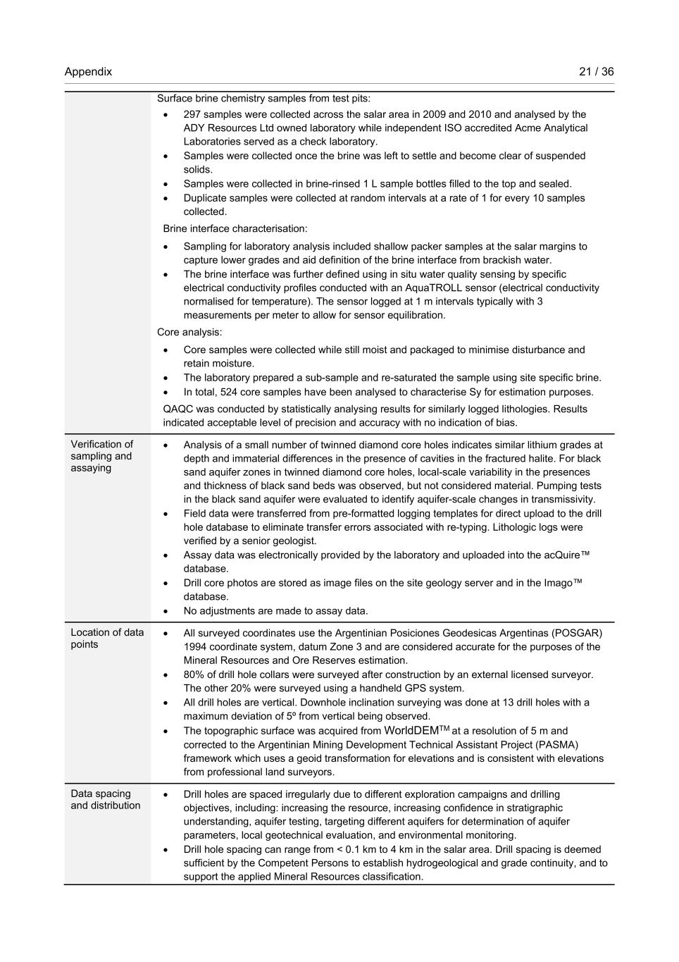 Appendix 21 / 36 RioTintoNonBusiness Surface brine chemistry samples from test pits: • 297 samples were collected across the salar area in 2009 and 2010 and analysed by the ADY Resources Ltd owned laboratory while independent ISO accredited Acme Analytical Laboratories served as a check laboratory. • Samples were collected once the brine was left to settle and become clear of suspended solids. • Samples were collected in brine-rinsed 1 L sample bottles filled to the top and sealed. • Duplicate samples were collected at random intervals at a rate of 1 for every 10 samples collected. Brine interface characterisation: • Sampling for laboratory analysis included shallow packer samples at the salar margins to capture lower grades and aid definition of the brine interface from brackish water. • The brine interface was further defined using in situ water quality sensing by specific electrical conductivity profiles conducted with an AquaTROLL sensor (electrical conductivity normalised for temperature). The sensor logged at 1 m intervals typically with 3 measurements per meter to allow for sensor equilibration. Core analysis: • Core samples were collected while still moist and packaged to minimise disturbance and retain moisture. • The laboratory prepared a sub-sample and re-saturated the sample using site specific brine. • In total, 524 core samples have been analysed to characterise Sy for estimation purposes. QAQC was conducted by statistically analysing results for similarly logged lithologies. Results indicated acceptable level of precision and accuracy with no indication of bias. Verification of sampling and assaying • Analysis of a small number of twinned diamond core holes indicates similar lithium grades at depth and immaterial differences in the presence of cavities in the fractured halite. For black sand aquifer zones in twinned diamond core holes, local-scale variability in the presences and thickness of black sand beds was observed, but not considered material. Pumping tests in the black sand aquifer were evaluated to identify aquifer-scale changes in transmissivity. • Field data were transferred from pre-formatted logging templates for direct upload to the drill hole database to eliminate transfer errors associated with re-typing. Lithologic logs were verified by a senior geologist. • Assay data was electronically provided by the laboratory and uploaded into the acQuire™ database. • Drill core photos are stored as image files on the site geology server and in the Imago™ database. • No adjustments are made to assay data. Location of data points • All surveyed coordinates use the Argentinian Posiciones Geodesicas Argentinas (POSGAR) 1994 coordinate system, datum Zone 3 and are considered accurate for the purposes of the Mineral Resources and Ore Reserves estimation. • 80% of drill hole collars were surveyed after construction by an external licensed surveyor. The other 20% were surveyed using a handheld GPS system. • All drill holes are vertical. Downhole inclination surveying was done at 13 drill holes with a maximum deviation of 5º from vertical being observed. • The topographic surface was acquired from WorldDEMTM at a resolution of 5 m and corrected to the Argentinian Mining Development Technical Assistant Project (PASMA) framework which uses a geoid transformation for elevations and is consistent with elevations from professional land surveyors. Data spacing and distribution • Drill holes are spaced irregularly due to different exploration campaigns and drilling objectives, including: increasing the resource, increasing confidence in stratigraphic understanding, aquifer testing, targeting different aquifers for determination of aquifer parameters, local geotechnical evaluation, and environmental monitoring. • Drill hole spacing can range from < 0.1 km to 4 km in the salar area. Drill spacing is deemed sufficient by the Competent Persons to establish hydrogeological and grade continuity, and to support the applied Mineral Resources classification.