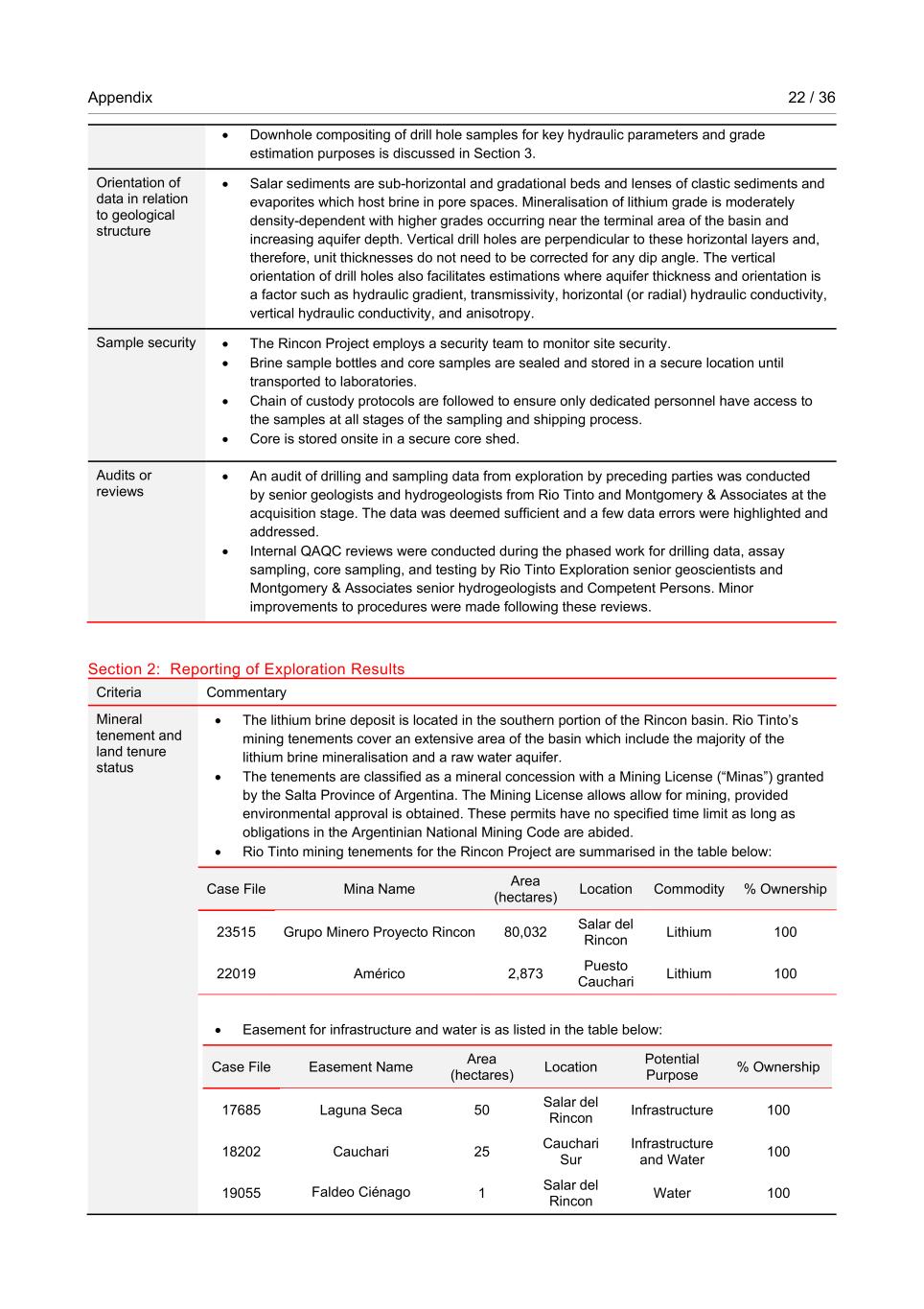 Appendix 22 / 36 RioTintoNonBusiness • Downhole compositing of drill hole samples for key hydraulic parameters and grade estimation purposes is discussed in Section 3. Orientation of data in relation to geological structure • Salar sediments are sub-horizontal and gradational beds and lenses of clastic sediments and evaporites which host brine in pore spaces. Mineralisation of lithium grade is moderately density-dependent with higher grades occurring near the terminal area of the basin and increasing aquifer depth. Vertical drill holes are perpendicular to these horizontal layers and, therefore, unit thicknesses do not need to be corrected for any dip angle. The vertical orientation of drill holes also facilitates estimations where aquifer thickness and orientation is a factor such as hydraulic gradient, transmissivity, horizontal (or radial) hydraulic conductivity, vertical hydraulic conductivity, and anisotropy. Sample security • The Rincon Project employs a security team to monitor site security. • Brine sample bottles and core samples are sealed and stored in a secure location until transported to laboratories. • Chain of custody protocols are followed to ensure only dedicated personnel have access to the samples at all stages of the sampling and shipping process. • Core is stored onsite in a secure core shed. Audits or reviews • An audit of drilling and sampling data from exploration by preceding parties was conducted by senior geologists and hydrogeologists from Rio Tinto and Montgomery & Associates at the acquisition stage. The data was deemed sufficient and a few data errors were highlighted and addressed. • Internal QAQC reviews were conducted during the phased work for drilling data, assay sampling, core sampling, and testing by Rio Tinto Exploration senior geoscientists and Montgomery & Associates senior hydrogeologists and Competent Persons. Minor improvements to procedures were made following these reviews. Section 2: Reporting of Exploration Results Criteria Commentary Mineral tenement and land tenure status • The lithium brine deposit is located in the southern portion of the Rincon basin. Rio Tinto’s mining tenements cover an extensive area of the basin which include the majority of the lithium brine mineralisation and a raw water aquifer. • The tenements are classified as a mineral concession with a Mining License (“Minas”) granted by the Salta Province of Argentina. The Mining License allows allow for mining, provided environmental approval is obtained. These permits have no specified time limit as long as obligations in the Argentinian National Mining Code are abided. • Rio Tinto mining tenements for the Rincon Project are summarised in the table below: Case File Mina Name Area (hectares) Location Commodity % Ownership 23515 Grupo Minero Proyecto Rincon 80,032 Salar del Rincon Lithium 100 22019 Américo 2,873 Puesto Cauchari Lithium 100 • Easement for infrastructure and water is as listed in the table below: Case File Easement Name Area (hectares) Location Potential Purpose % Ownership 17685 Laguna Seca 50 Salar del Rincon Infrastructure 100 18202 Cauchari 25 Cauchari Sur Infrastructure and Water 100 19055 Faldeo Ciénago 1 Salar del Rincon Water 100