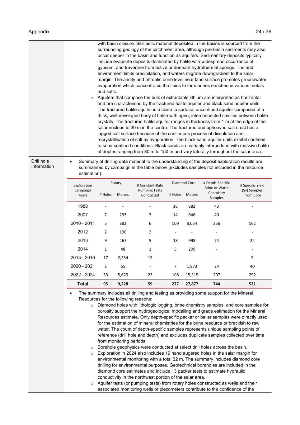 Appendix 24 / 36 RioTintoNonBusiness with basin closure. Siliclastic material deposited in the basins is sourced from the surrounding geology of the catchment area, although pre-basin sediments may also occur deeper in the basin and function as aquifers. Sedimentary deposits typically include evaporite deposits dominated by halite with widespread occurrence of gypsum, and travertine from active or dormant hydrothermal springs. The arid environment limits precipitation, and waters migrate downgradient to the salar margin. The aridity and phreatic brine level near land surface promotes groundwater evaporation which concentrates the fluids to form brines enriched in various metals and salts. o Aquifers that compose the bulk of extractable lithium are interpreted as horizontal and are characterised by the fractured halite aquifer and black sand aquifer units. The fractured halite aquifer is a close to surface, unconfined aquifer composed of a thick, well-developed body of halite with open, interconnected cavities between halite crystals. The fractured halite aquifer ranges in thickness from 1 m at the edge of the salar nucleus to 30 m in the centre. The fractured and upheaved salt crust has a jagged salt surface because of the continuous process of dissolution and recrystallisation of salt by evaporation. The black sand aquifer units exhibit confined to semi-confined conditions. Black sands are variably interbedded with massive halite at depths ranging from 30 m to 150 m and vary laterally throughout the salar area. Drill hole Information • Summary of drilling data material to the understanding of the deposit exploration results are summarised by campaign in the table below (excludes samples not included in the resource estimation): Exploration Campaign Years Rotary # Constant-Rate Pumping Tests Conducted Diamond Core # Depth-Specific Brine or Water Chemistry Samples # Specific Yield (Sy) Samples from Core # Holes Metres # Holes Metres 1988 - - - 16 682 43 - 2007 7 293 7 14 646 40 - 2010 - 2011 5 382 6 109 8,054 356 162 2012 2 190 2 - - - - 2013 9 267 5 18 998 74 22 2014 1 48 1 5 209 - - 2015 - 2016 17 2,354 15 - - - 5 2020 - 2021 1 65 - 7 1,973 24 40 2022 - 2024 53 5,629 23 108 15,315 207 292 Total 95 9,228 59 277 27,877 744 521 • The summary includes all drilling and testing as providing some support for the Mineral Resources for the following reasons: o Diamond holes with lithologic logging, brine chemistry samples, and core samples for porosity support the hydrogeological modelling and grade estimation for the Mineral Resources estimate. Only depth-specific packer or bailer samples were directly used for the estimation of mineral chemistries for the brine resource or brackish to raw water. The count of depth-specific samples represents unique sampling points of reference (drill hole and depth) and excludes duplicate samples collected over time from monitoring periods. o Borehole geophysics were conducted at select drill holes across the basin. o Exploration in 2024 also includes 19 hand augered holes in the salar margin for environmental monitoring with a total 32 m. The summary includes diamond core drilling for environmental purposes. Geotechnical boreholes are included in the diamond core estimates and include 13 packer tests to estimate hydraulic conductivity in the northwest portion of the salar area. o Aquifer tests (or pumping tests) from rotary holes constructed as wells and their associated monitoring wells or piezometers contribute to the confidence of the